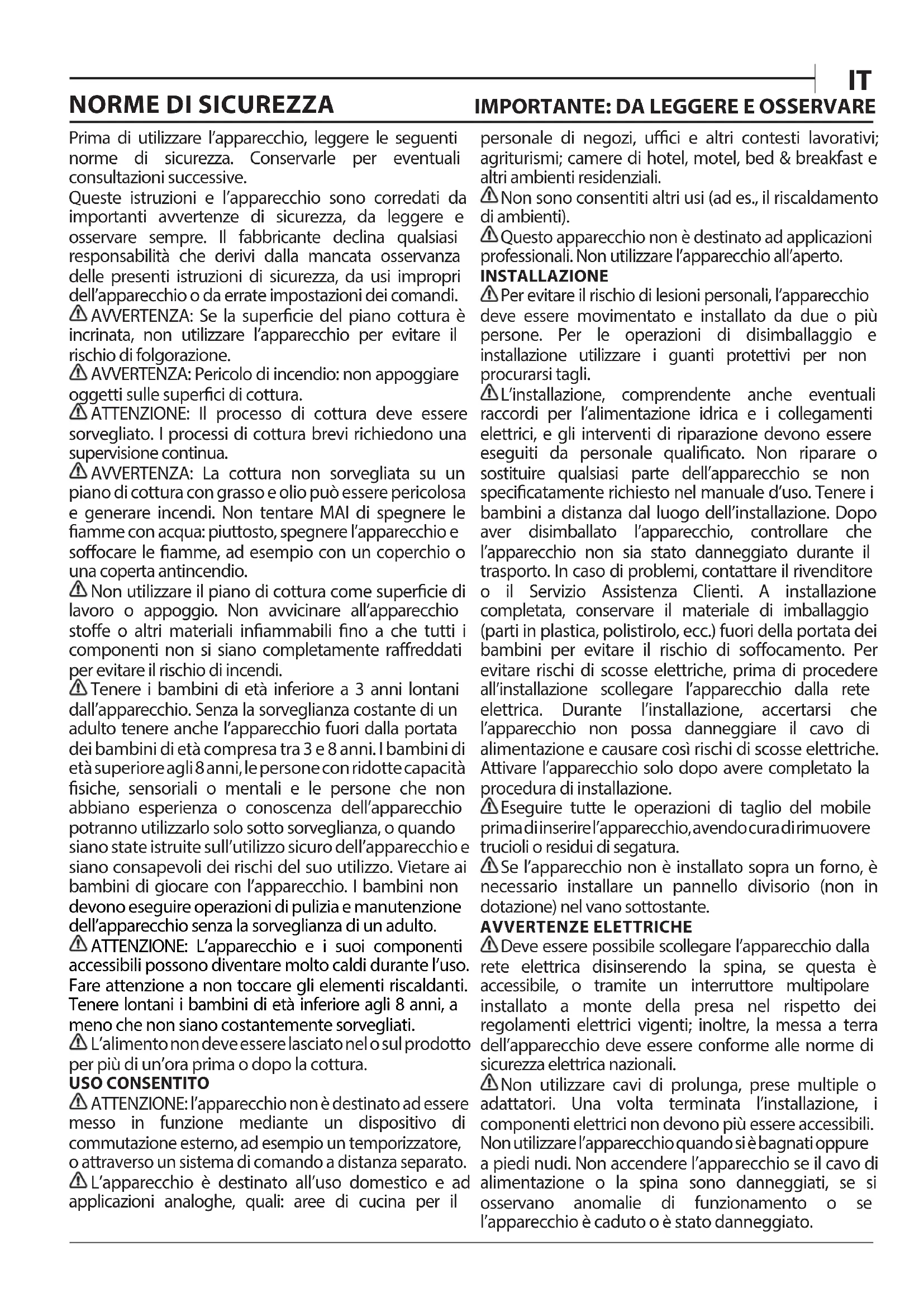 - Anders, contacteer onze Klantenservice (Het telefoonnummer staat in het garantieboekje). Wanneer u contact opneemt met de Klantenservice, gelieve de codes te vermelden die op het identicatieplaatje van het apparaat staan.Prima di utilizzare l’apparecchio, leggere le seguenti norme di sicurezza. Conservarle per eventuali consultazioni successive. Queste istruzioni e l’apparecchio sono corredati da importanti avvertenze di sicurezza, da leggere e osservare sempre. Il fabbricante declina qualsiasi responsabilità che derivi dalla mancata osservanza delle presenti istruzioni di sicurezza, da usi impropri dell’apparecchio o da errate impostazioni dei comandi. AVVERTENZA: Se la supercie del piano cottura è incrinata, non utilizzare l’apparecchio per evitare il rischio di folgorazione. AVVERTENZA: Pericolo di incendio: non appoggiare oggetti sulle superci di cottura. ATTENZIONE: Il processo di cottura deve essere sorvegliato. I processi di cottura brevi richiedono una supervisione continua. AVVERTENZA: La cottura non sorvegliata su un piano di cottura con grasso e olio può essere pericolosa e generare incendi. Non tentare MAI di spegnere le amme con acqua: piuttosto, spegnere l’apparecchio e soocare le amme, ad esempio con un coperchio o una coperta antincendio. Non utilizzare il piano di cottura come supercie di lavoro o appoggio. Non avvicinare all’apparecchio stoe o altri materiali inammabili no a che tutti i componenti non si siano completamente rareddati per evitare il rischio di incendi. Tenere i bambini di età inferiore a 3 anni lontani dall’apparecchio. Senza la sorveglianza costante di un adulto tenere anche l’apparecchio fuori dalla portata dei bambini di età compresa tra 3 e 8 anni. I bambini di età superiore agli 8 anni, le persone con ridotte capacità siche, sensoriali o mentali e le persone che non abbiano esperienza o conoscenza dell’apparecchio potranno utilizzarlo solo sotto sorveglianza, o quando siano state istruite sull’utilizzo sicuro dell’apparecchio e siano consapevoli dei rischi del suo utilizzo. Vietare ai bambini di giocare con l’apparecchio. I bambini non devono eseguire operazioni di pulizia e manutenzione dell’apparecchio senza la sorveglianza di un adulto. ATTENZIONE: L’apparecchio e i suoi componenti accessibili possono diventare molto caldi durante l’uso. Fare attenzione a non toccare gli elementi riscaldanti. Tenere lontani i bambini di età inferiore agli 8 anni, a meno che non siano costantemente sorvegliati. L’alimento non deve essere lasciato nel o sul prodotto per più di un’ora prima o dopo la cottura. USO CONSENTITO ATTENZIONE: l’apparecchio non è destinato ad essere messo in funzione mediante un dispositivo di commutazione esterno, ad esempio un temporizzatore, o attraverso un sistema di comando a distanza separato. L’apparecchio è destinato all’uso domestico e ad applicazioni analoghe, quali: aree di cucina per il personale di negozi, uci e altri contesti lavorativi; agriturismi; camere di hotel, motel, bed & breakfast e altri ambienti residenziali. Non sono consentiti altri usi (ad es., il riscaldamento di ambienti). Questo apparecchio non è destinato ad applicazioni professionali. Non utilizzare l’apparecchio all’aperto. INSTALLAZIONE Per evitare il rischio di lesioni personali, l’apparecchio deve essere movimentato e installato da due o più persone. Per le operazioni di disimballaggio e installazione utilizzare i guanti protettivi per non procurarsi tagli. L’installazione, comprendente anche eventuali raccordi per l’alimentazione idrica e i collegamenti elettrici, e gli interventi di riparazione devono essere eseguiti da personale qualicato. Non riparare o sostituire qualsiasi parte dell’apparecchio se non specicatamente richiesto nel manuale d’uso. Tenere i bambini a distanza dal luogo dell’installazione. Dopo aver disimballato l’apparecchio, controllare che l’apparecchio non sia stato danneggiato durante il trasporto. In caso di problemi, contattare il rivenditore o il Servizio Assistenza Clienti. A installazione completata, conservare il materiale di imballaggio (parti in plastica, polistirolo, ecc.) fuori della portata dei bambini per evitare il rischio di soocamento. Per evitare rischi di scosse elettriche, prima di procedere all’installazione scollegare l’apparecchio dalla rete elettrica. Durante l’installazione, accertarsi che l’apparecchio non possa danneggiare il cavo di alimentazione e causare così rischi di scosse elettriche. Attivare l’apparecchio solo dopo avere completato la procedura di installazione. Eseguire tutte le operazioni di taglio del mobile prima di inserire l’apparecchio, avendo cura di rimuovere trucioli o residui di segatura. Se l’apparecchio non è installato sopra un forno, è necessario installare un pannello divisorio (non in dotazione) nel vano sottostante. AVVERTENZE ELETTRICHE Deve essere possibile scollegare l’apparecchio dalla rete elettrica disinserendo la spina, se questa è accessibile, o tramite un interruttore multipolare installato a monte della presa nel rispetto dei regolamenti elettrici vigenti; inoltre, la messa a terra dell’apparecchio deve essere conforme alle norme di sicurezza elettrica nazionali. Non utilizzare cavi di prolunga, prese multiple o adattatori. Una volta terminata l’installazione, i componenti elettrici non devono più essere accessibili. Non utilizzare l’apparecchio quando si è bagnati oppure a piedi nudi. Non accendere l’apparecchio se il cavo di alimentazione o la spina sono danneggiati, se si osservano anomalie di funzionamento o se l’apparecchio è caduto o è stato danneggiato.