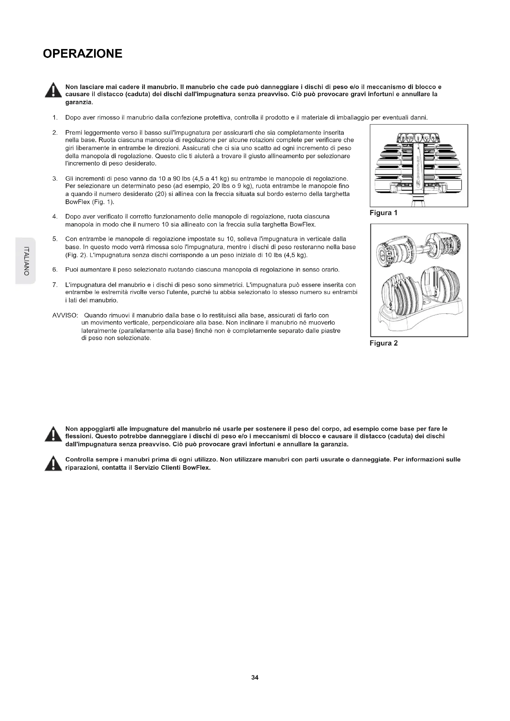 entrambe le estremità rivolte verso l'utente, purché tu abbia selezionato lo stesso numero su entrambi i lati del manubrio. AVVISO: Quando rimuovi il manubrio dalla base o lo restituisci alla base, assicurati di farlo con un movimento verticale, perpendicolare alla base. Non inclinare il manubrio né muoverlo lateralmente (parallelamente alla base) finché non è completamente separato dalle piastre di peso non selezionate. Non appoggiarti alle impugnature del manubrio né usarle per sostenere il peso del corpo, ad esempio come base per fare le flessioni. Questo potrebbe danneggiare i dischi di peso e/o i meccanismi di blocco e causare il distacco (caduta) dei dischi dall'impugnatura senza preavviso. Ciò può provocare gravi infortuni e annullare la garanzia. Controlla sempre i manubri prima di ogni utilizzo. Non utilizzare manubri con parti usurate o danneggiate. Per informazioni sulle riparazioni, contatta il Servizio Clienti BowFlex. Figura 1 Figura 2ITALIANO