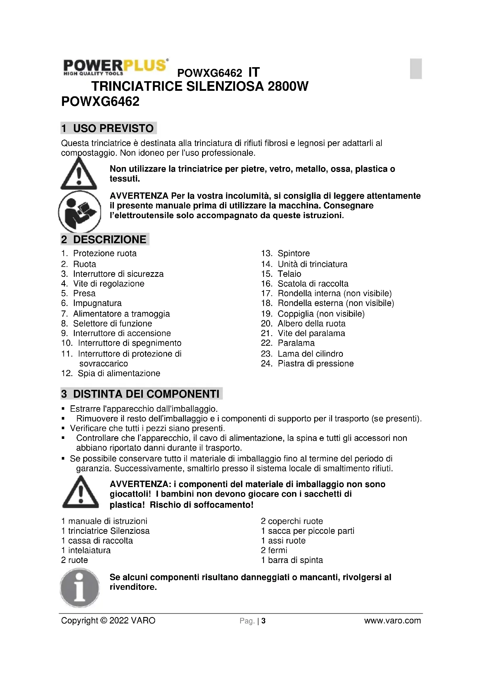 POWXG6462 1 USO PREVISTO Questa trinciatrice è destinata alla trinciatura di rifiuti fibrosi e legnosi per adattarli al compostaggio. Non idoneo per l'uso professionale. Non utilizzare la trinciatrice per pietre, vetro, metallo, ossa, plastica o tessuti. AVVERTENZA Per la vostra incolumità, si consiglia di leggere attentamente il presente manuale prima di utilizzare la macchina. Consegnare l’elettroutensile solo accompagnato da queste istruzioni. 2 DESCRIZIONE
