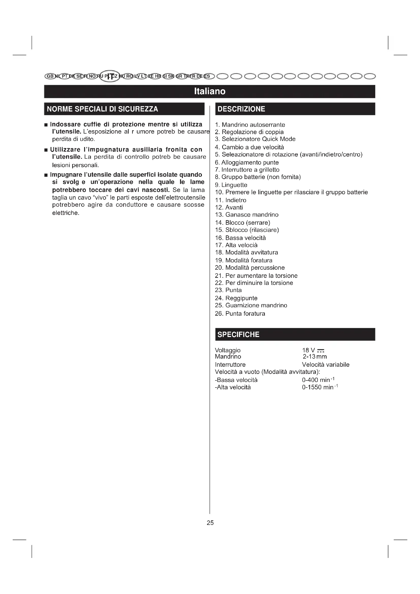 GB NL PT DK SE FI NO RU PL CZ HU RO LV LT EE HR SI SK GR TRFR DE ES FUNZIONAMENTO AVVERTENZE Le batterie dell’utensile permettono all’utensile di funzionare in qualsiasi momento. Bloccare quindi l’interr uttore quando l’utensile non viene utilizzato o quando lo si trasporta.