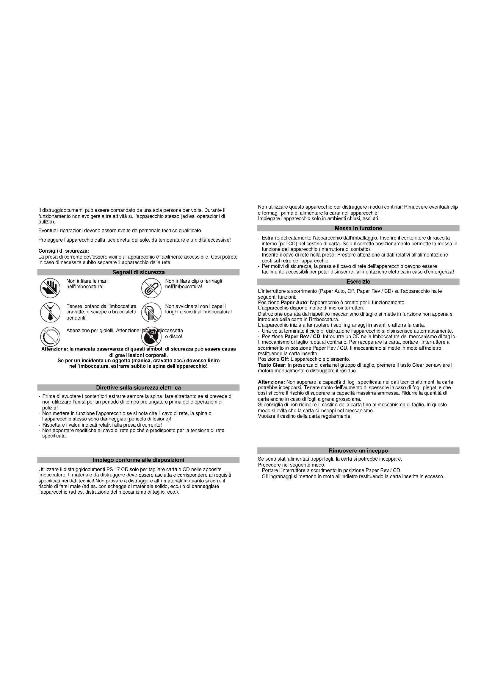 Principali norme di sicurezza Per poter sfruttare tutte le funzioni del distruggidocumenti, prima di mettere in funzione l’apparecchio leggere con attenzione le presenti istruzioni per l’uso. Tenere l’apparecchio lontano dalla portata di bambini e animali domestici! L‘apparecchio può essere utilizzato solo da persone adulte.Il distruggidocumenti può essere comandato da una sola persona per volta. Durante il funzionamento non svolgere altre attività sull‘apparecchio stesso (ad es. operazioni di pulizia). Eventuali riparazioni devono essere svolte da personale tecnico qualificato. Proteggere l’apparecchio dalla luce diretta del sole, da temperature e umidità eccessive! Consigli di sicurezza: La presa di corrente dev'essere vicino al apparecchio e facilmente accessibile. Cosi potrete in caso di necessità subito separare il apparecchio dalla rete. Segnali di sicurezza Non infilare le mani nell’imboccatura! Non infilare clip o fermagli nell’imboccatura! Tenere lontano dall’imboccatura cravatte, e sciarpe o braccialetti pendenti! Non avvicinarsi con i capelli lunghi e sciolti all’imboccatura! Attenzione per gioielli! Attenzione! Non audiocassetta o disco! Attenzione: la mancata osservanza di questi simboli di sicurezza può essere causa di gravi lesioni corporali. Se per un incidente un oggetto (manica, cravatta ecc.) dovesse finire nell’imboccatura, estrarre subito la spina dell’apparecchio! Direttive sulla sicurezza elettrica - Prima di svuotare i contenitori estrarre sempre la spina; fare altrettanto se si prevede di non utilizzare l’unità per un periodo di tempo prolungato o prima delle operazioni di pulizia! - Non mettere in funzione l’apparecchio se si nota che il cavo di rete, la spina o l’apparecchio stesso sono danneggiati (pericolo di lesione)! - Rispettare i valori indicati relativi alla presa di corrente! - Non apportare modifiche al cavo di rete poiché è predisposto per la tensione di rete specificata. Impiego conforme alle disposizioni Utilizzare il distruggidocumenti PS 17 CD solo per tagliare carta o CD nelle apposite imboccature. Il materiale da distruggere deve essere asciutta e corrispondere ai requisiti specificati nei dati tecnici! Non provare a distruggere altri materiali in quanto si corre il rischio di farsi male (ad es. con schegge di materiale solido, ecc.) o di danneggiare l‘apparecchio (ad es. distruzione del meccanismo di taglio, ecc.). Non utilizzare questo apparecchio per distruggere moduli continui! Rimuovere eventuali clip e fermagli prima di alimentare la carta nell‘apparecchio! Impiegare l’apparecchio solo in ambienti chiusi, asciutti. Messa in funzione - Estrarre delicatamente l’apparecchio dall’imballaggio. Inserire il contenitore di raccolta interno (per CD) nel cestino di carta. Solo il corretto posizionamento permette la messa in funzione dell‘apparecchio (interruttore di contatto). - Inserire il cavo di rete nella presa. Prestare attenzione ai dati relativi all‘alimentazione posti sul retro dell‘apparecchio. - Per motivi di sicurezza, la presa e il cavo di rete dell’apparecchio devono essere facilmente accessibili per poter disinserire l’alimentazione elettrica in caso d’emergenza! Esercizio L’interruttore a scorrimento (Paper Auto, Off, Paper Rev / CD) sull’apparecchio ha le seguenti funzioni: Posizione Paper Auto: l‘apparecchio è pronto per il funzionamento. L’apparecchio dispone inoltre di microinterruttori. Distruzione operata dal rispettivo meccanismo di taglio si mette in funzione non appena si introduce della carta in l’imboccatura. L’apparecchio inizia a far ruotare i suoi ingranaggi in avanti e afferra la carta. - Una volta terminato il ciclo di distruzione l’apparecchio si disinserisce automaticamente. - Posizione Paper Rev / CD: Introdurre un CD nella imboccatura del meccanismo di taglio. Il meccanismo di taglio ruota al contrario. Per recuperare la carta, portare l‘interruttore a scorrimento in posizione Paper Rev / CD. Il meccanismo si mette in moto all‘indietro restituendo la carta inserito. Posizione Off: L’apparecchio è disinserito. Tasto Clear: In presenza di carta nel gruppo di taglio, premere il tasto Clear per avviare il motore manualmente e distruggere il residuo. Attenzione: Non superare la capacità di fogli specificata nei dati tecnici altrimenti la carta potrebbe incepparsi! Tenere conto dell’aumento di spessore in caso di fogli piegati e che così si corre il rischio di superare la capacità massima ammessa. Ridurre la quantità di carta anche in caso di fogli a grana grossolana. Si consiglia di non riempire il cestino della carta fino al meccanismo di taglio. In questo modo si evita che la carta si inceppi nel meccanismo. Vuotare il cestino della carta regolarmente. Rimuovere un inceppo Se sono stati alimentati troppi fogli, la carta si potrebbe inceppare. Procedere nel seguente modo: - Portare l’interruttore a scorrimento in posizione Paper Rev / CD. - Gli ingranaggi si mettono in moto all‘indietro restituendo la carta inserita in eccesso.- Ridurre la quantità e riportare l’apparecchio su Paper Auto. Il meccanismo di taglio si rimette di nuovo in moto nel suo normale senso di marcia triturando i residui di materiale ancora presenti nell’imboccatura. Se non si riesce a risolvere l’inceppamento delle residui agendo sul senso di marcia del meccanismo di taglio, estrarre la spina dalla presa e rimuovere manualmente i residui. Salvamotore Il motore si disinserisce automaticamente in caso di sovraccarico. Estrarre la spina dalla presa di corrente e lasciar raffreddare il motore a temperatura ambiente. Reinserire la spina nella presa e rimettere in funzione l’apparecchio. Indicazioni per la manutenzione Attenzione: Le operazioni di manutenzione devono essere svolte solo dopo aver tolto la spina dalla presa! Per sfruttare al massimo le capacità dell’apparecchio, si consiglia di liberare regolarmente il meccanismo di taglio dai residui 