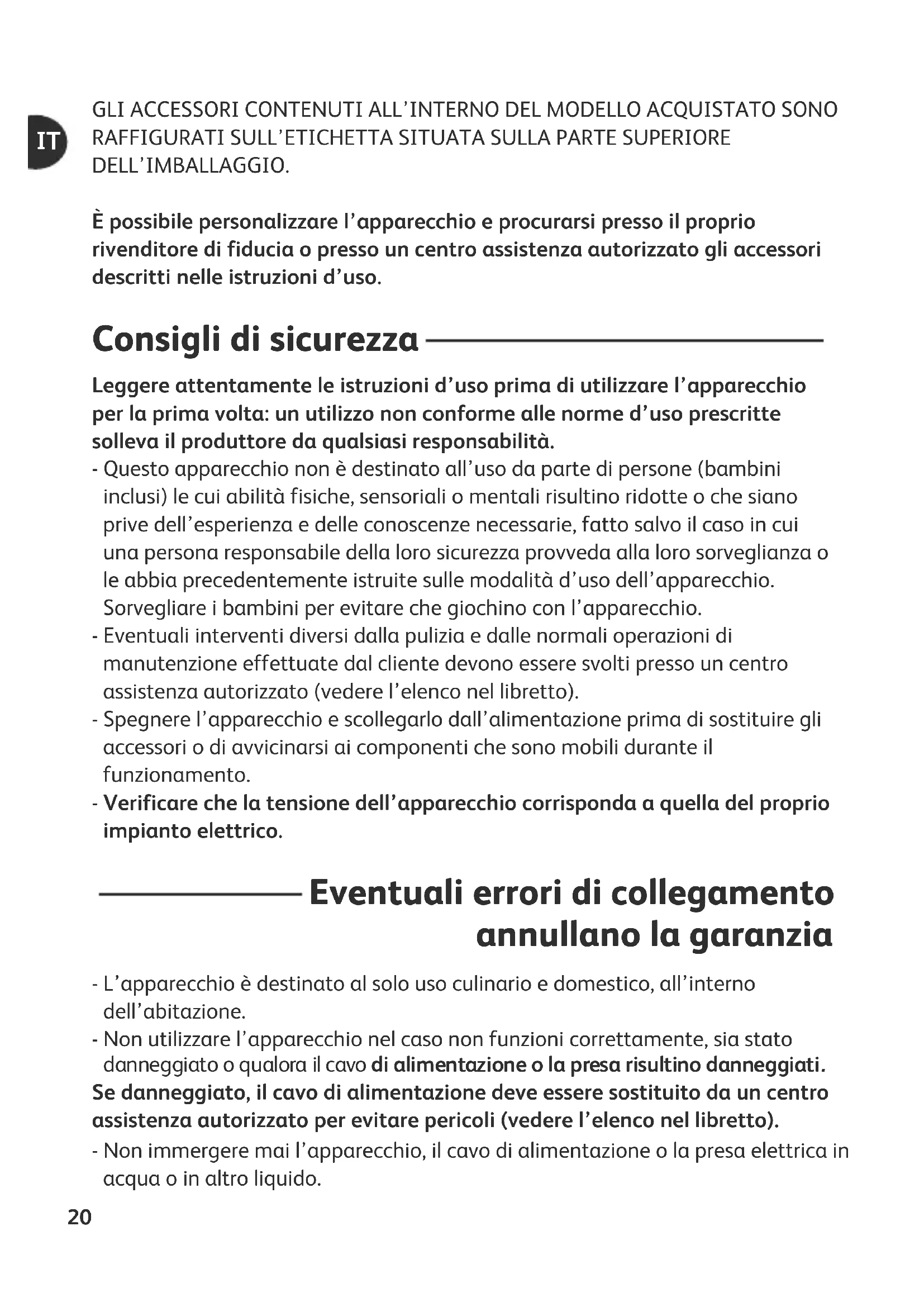 19GLI ACCESSORI CONTENUTI ALL’INTERNO DEL MODELLO ACQUISTATO SONO RAFFIGURATI SULL’ETICHETTA SITUATA SULLA PARTE SUPERIORE DELL’IMBALLAGGIO. È possibile personalizzare l’apparecchio e procurarsi presso il proprio rivenditore di fiducia o presso un centro assistenza autorizzato gli accessori descritti nelle istruzioni d’uso. Consigli di sicurezza Leggere attentamente le istruzioni d’uso prima di utilizzare l’apparecchio per la prima volta: un utilizzo non conforme alle norme d’uso prescritte solleva il produttore da qualsiasi responsabilità. - Questo apparecchio non è destinato all’uso da parte di persone (bambini inclusi) le cui abilità fisiche, sensoriali o mentali risultino ridotte o che siano prive dell’esperienza e delle conoscenze necessarie, fatto salvo il caso in cui una persona responsabile della loro sicurezza provveda alla loro sorveglianza o le abbia precedentemente istruite sulle modalità d’uso dell’apparecchio. Sorvegliare i bambini per evitare che giochino con l’apparecchio. - Eventuali interventi diversi dalla pulizia e dalle normali operazioni di manutenzione effettuate dal cliente devono essere svolti presso un centro assistenza autorizzato (vedere l’elenco nel libretto). - Spegnere l’apparecchio e scollegarlo dall’alimentazione prima di sostituire gli accessori o di avvicinarsi ai componenti che sono mobili durante il funzionamento. - Verificare che la tensione dell’apparecchio corrisponda a quella del proprio impianto elettrico. Eventuali errori di collegamento annullano la garanzia - L’apparecchio è destinato al solo uso culinario e domestico, all’interno dell’abitazione. - Non utilizzare l’apparecchio nel caso non funzioni correttamente, sia stato danneggiato o qualora il cavo di alimentazione o la presa risultino danneggiati. Se danneggiato, il cavo di alimentazione deve essere sostituito da un centro assistenza autorizzato per evitare pericoli (vedere l’elenco nel libretto). - Non immergere mai l’apparecchio, il cavo di alimentazione o la presa elettrica in acqua o in altro liquido.