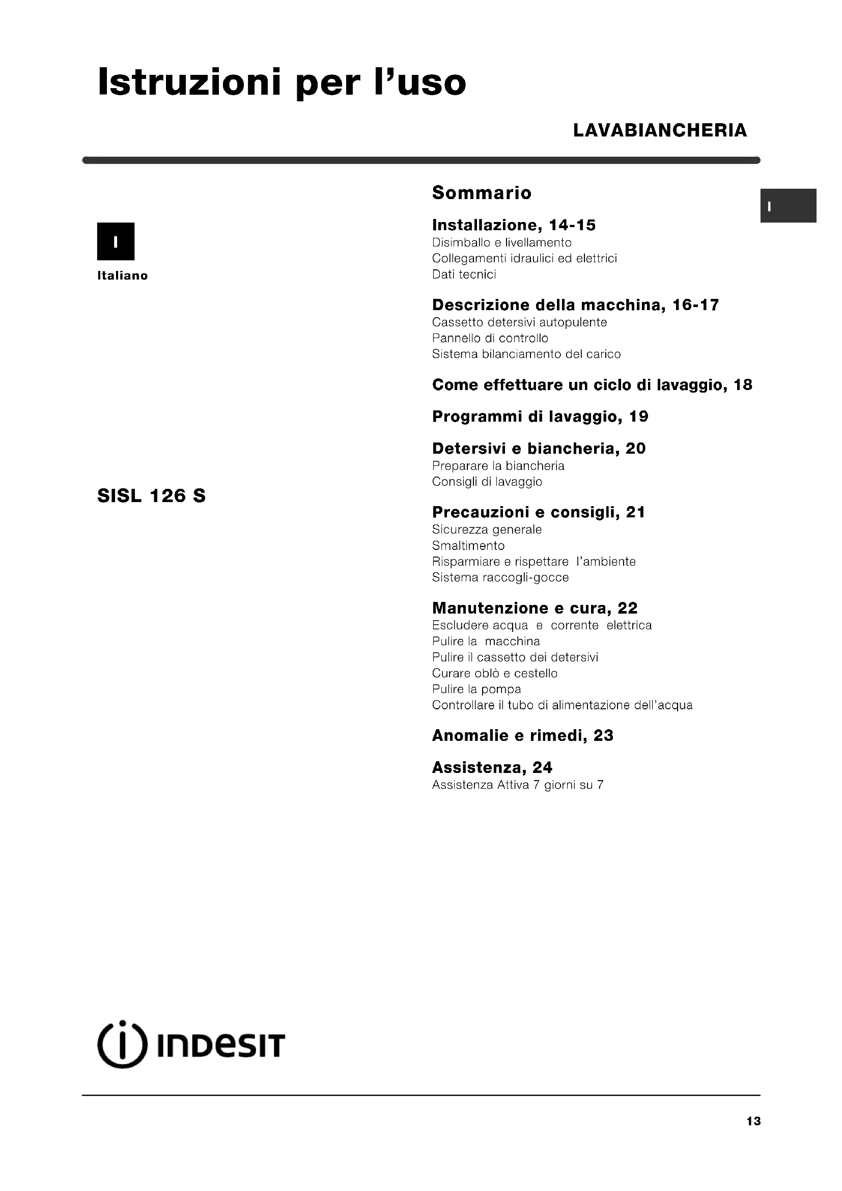Scarica le istruzioni per il tuo Lavatrice in formato PDF gratuitamente! Trova il tuo manuale SISL 126 S (EU) - INDESIT e riprendi in mano il tuo dispositivo elettronico. In questa pagina sono pubblicati tutti i documenti necessari per l'utilizzo del tuo dispositivo. SISL 126 S (EU) del marchio INDESIT.