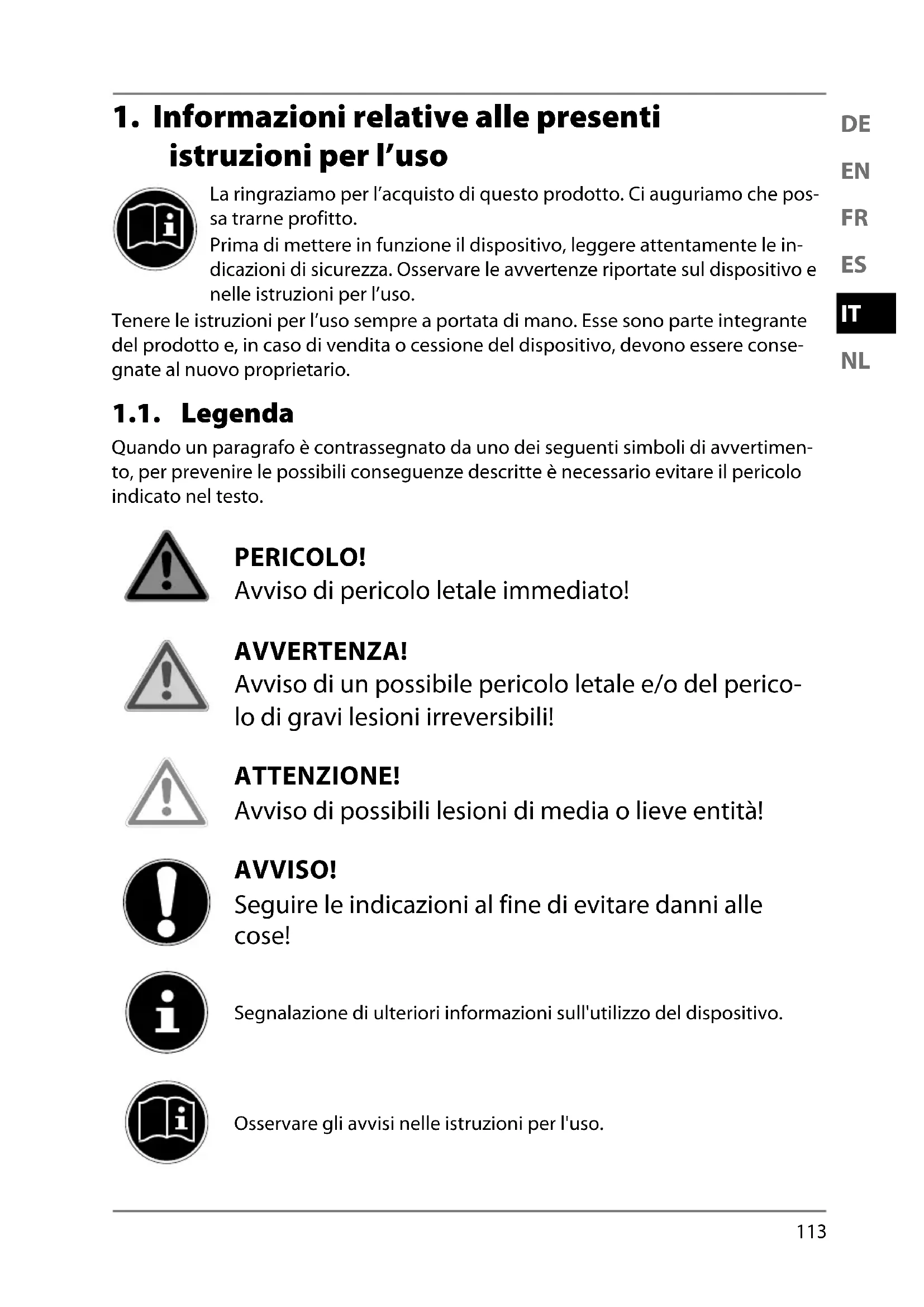1. Informazioni relative alle presenti istruzioni per l’uso ........................ 113