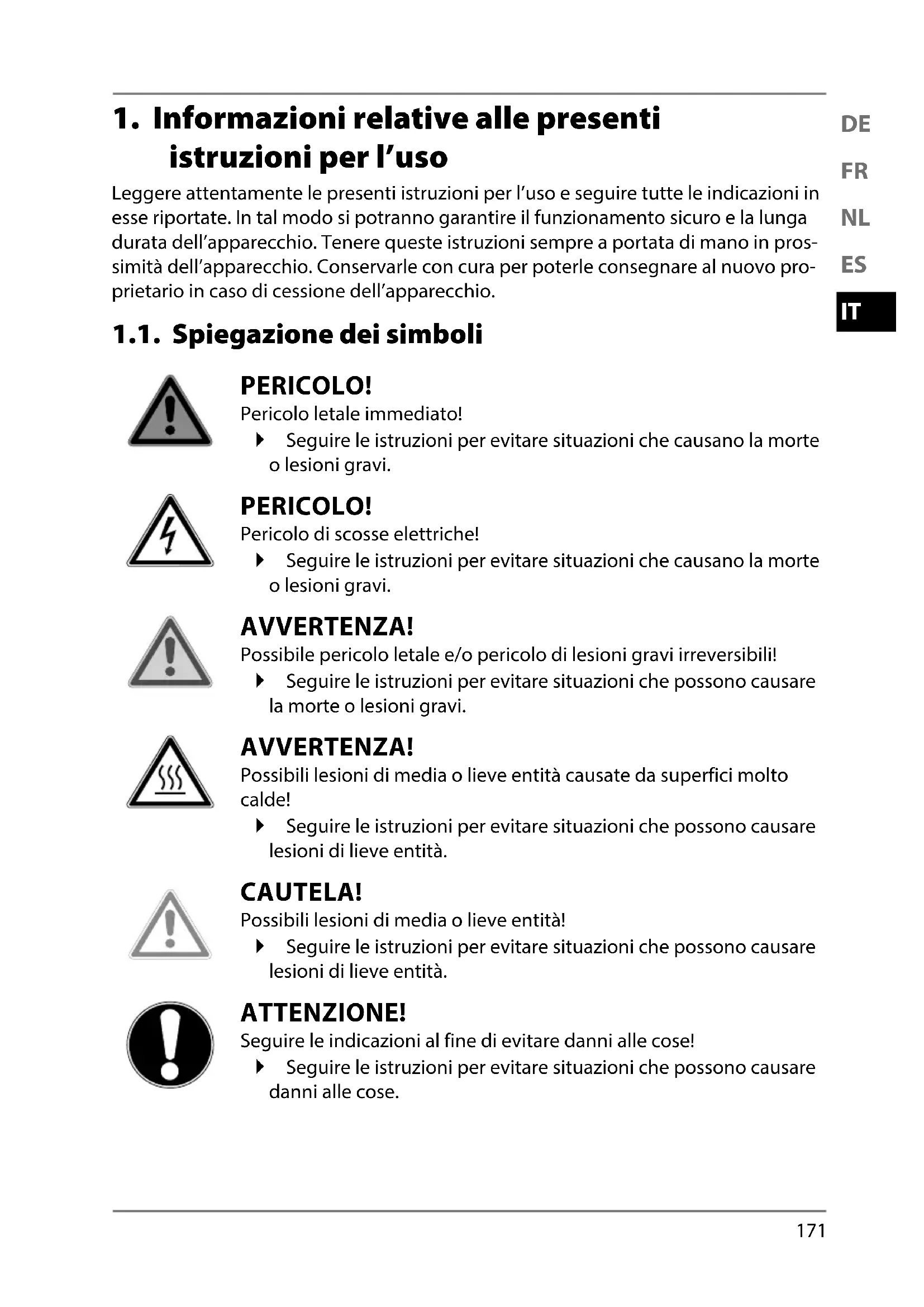 istruzioni per l’uso Leggere attentamente le presenti istruzioni per l’uso e seguire tutte le indicazioni in esse riportate. In tal modo si potranno garantire il funzionamento sicuro e la lunga durata dell’apparecchio. Tenere queste istruzioni sempre a portata di mano in pros- simità dell’apparecchio. Conservarle con cura per poterle consegnare al nuovo pro- prietario in caso di cessione dell’apparecchio. 1.1. Spiegazione dei simboli PERICOLO! Pericolo letale immediato! Seguire le istruzioni per evitare situazioni che causano la morte o lesioni gravi. PERICOLO! Pericolo di scosse elettriche! Seguire le istruzioni per evitare situazioni che causano la morte o lesioni gravi. AVVERTENZA! Possibile pericolo letale e/o pericolo di lesioni gravi irreversibili! Seguire le istruzioni per evitare situazioni che possono causare la morte o lesioni gravi. AVVERTENZA! Possibili lesioni di media o lieve entità causate da superfici molto calde! Seguire le istruzioni per evitare situazioni che possono causare lesioni di lieve entità. CAUTELA! Possibili lesioni di media o lieve entità! Seguire le istruzioni per evitare situazioni che possono causare lesioni di lieve entità. ATTENZIONE! Seguire le indicazioni al fine di evitare danni alle cose! Seguire le istruzioni per evitare situazioni che possono causare danni alle cose.172 Indicazioni di montaggio o di funzionamento Corrente alternata Uso in ambienti chiusi Gli apparecchi contrassegnati da questo simbolo possono essere utilizzati solo in ambienti chiusi. Superficie idonea al contatto con alimenti