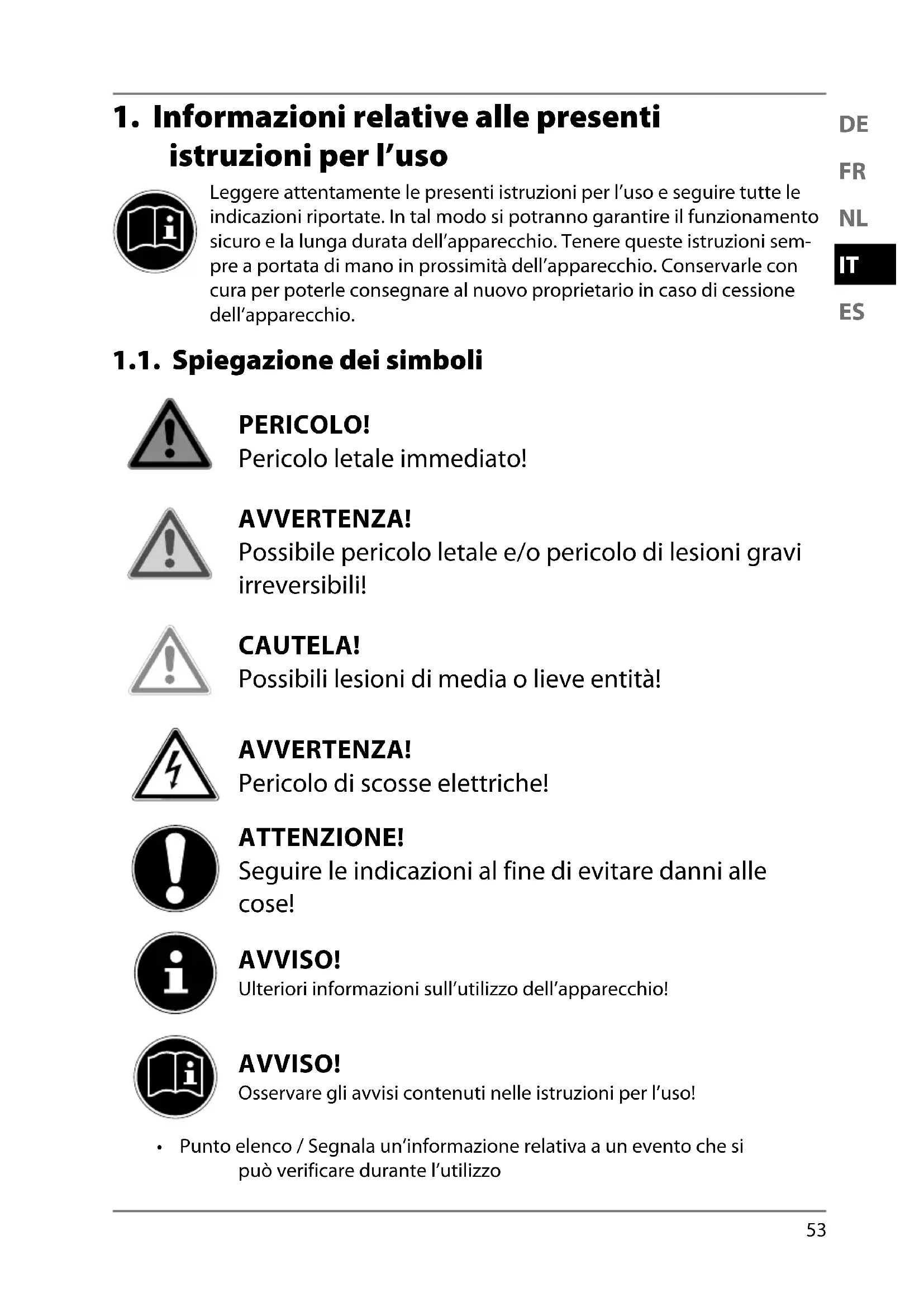 istruzioni per l’uso Leggere attentamente le presenti istruzioni per l’uso e seguire tutte le indicazioni riportate. In tal modo si potranno garantire il funzionamento sicuro e la lunga durata dell’apparecchio. Tenere queste istruzioni sem- pre a portata di mano in prossimità dell’apparecchio. Conservarle con cura per poterle consegnare al nuovo proprietario in caso di cessione dell’apparecchio. 1.1. Spiegazione dei simboli PERICOLO! Pericolo letale immediato! AVVERTENZA! Possibile pericolo letale e/o pericolo di lesioni gravi irreversibili! CAUTELA! Possibili lesioni di media o lieve entità! AVVERTENZA! Pericolo di scosse elettriche! ATTENZIONE! Seguire le indicazioni al fine di evitare danni alle cose! AVVISO! Ulteriori informazioni sull’utilizzo dell’apparecchio! AVVISO! Osservare gli avvisi contenuti nelle istruzioni per l’uso!
