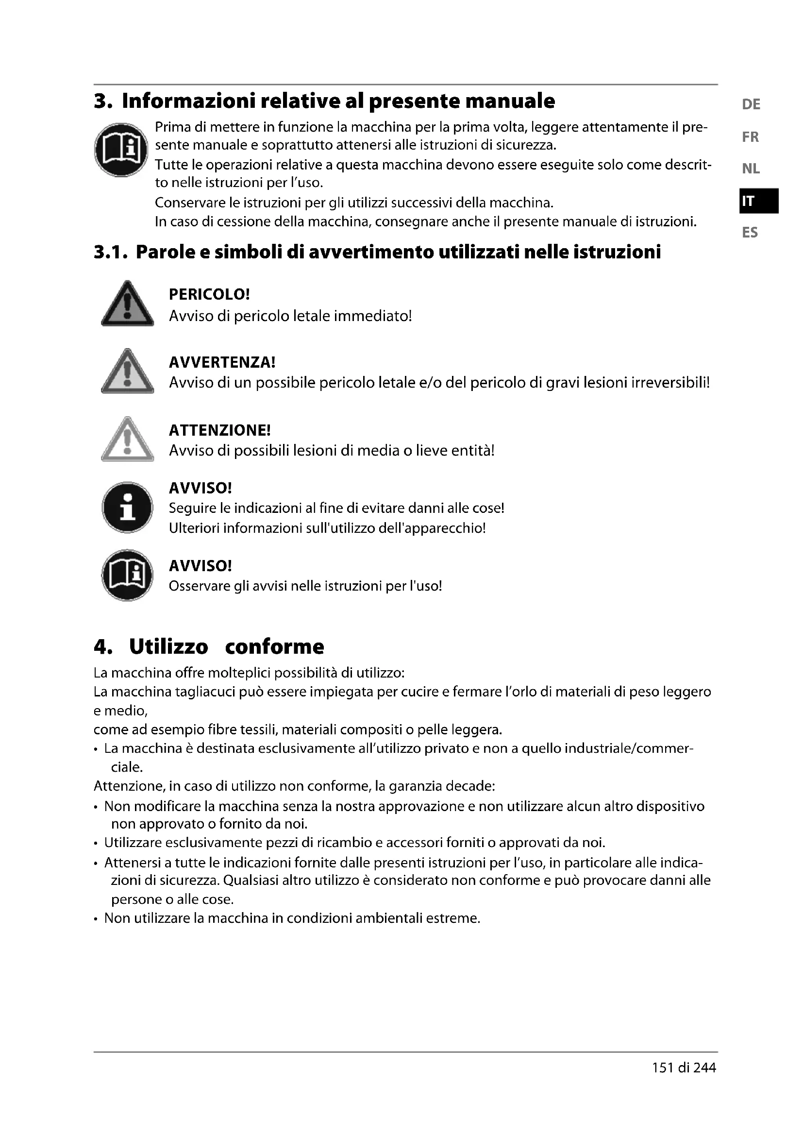 Prima di mettere in funzione la macchina per la prima volta, leggere attentamente il pre- sente manuale e soprattutto attenersi alle istruzioni di sicurezza. Tutte le operazioni relative a questa macchina devono essere eseguite solo come descrit- to nelle istruzioni per l’uso. Conservare le istruzioni per gli utilizzi successivi della macchina. In caso di cessione della macchina, consegnare anche il presente manuale di istruzioni. 3.1. Parole e simboli di avvertimento utilizzati nelle istruzioni PERICOLO! Avviso di pericolo letale immediato! AVVERTENZA! Avviso di un possibile pericolo letale e/o del pericolo di gravi lesioni irreversibili! ATTENZIONE! Avviso di possibili lesioni di media o lieve entità! AVVISO! Seguire le indicazioni al fine di evitare danni alle cose! Ulteriori informazioni sull'utilizzo dell'apparecchio! AVVISO! Osservare gli avvisi nelle istruzioni per l'uso!