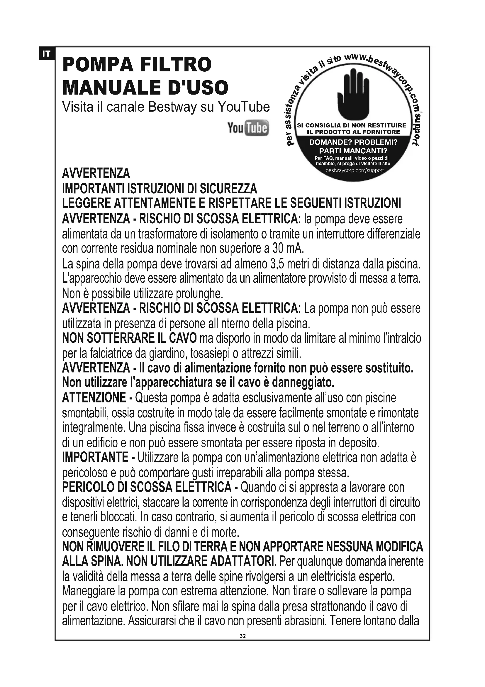 LEGGERE ATTENTAMENTE E RISPETTARE LE SEGUENTI ISTRUZIONI AVVERTENZA - RISCHIO DI SCOSSA ELETTRICA: la pompa deve essere alimentata da un trasformatore di isolamento o tramite un interruttore differenziale con corrente residua nominale non superiore a 30 mA. La spina della pompa deve trovarsi ad almeno 3,5 metri di distanza dalla piscina. L'apparecchio deve essere alimentato da un alimentatore provvisto di messa a terra. Non è possibile utilizzare prolunghe. AVVERTENZA - RISCHIO DI SCOSSA ELETTRICA: La pompa non può essere utilizzata in presenza di persone all nterno della piscina. NON SOTTERRARE IL CAVO ma disporlo in modo da limitare al minimo l’intralcio per la falciatrice da giardino, tosasiepi o attrezzi simili. AVVERTENZA - Il cavo di alimentazione fornito non può essere sostituito. Non utilizzare l'apparecchiatura se il cavo è danneggiato. ATTENZIONE - Questa pompa è adatta esclusivamente all’uso con piscine smontabili, ossia costruite in modo tale da essere facilmente smontate e rimontate integralmente. Una piscina fissa invece è costruita sul o nel terreno o all’interno di un edificio e non può essere smontata per essere riposta in deposito. IMPORTANTE - Utilizzare la pompa con un’alimentazione elettrica non adatta è pericoloso e può comportare gusti irreparabili alla pompa stessa. PERICOLO DI SCOSSA ELETTRICA - Quando ci si appresta a lavorare con dispositivi elettrici, staccare la corrente in corrispondenza degli interruttori di circuito e tenerli bloccati. In caso contrario, si aumenta il pericolo di scossa elettrica con conseguente rischio di danni e di morte. NON RIMUOVERE IL FILO DI TERRA E NON APPORTARE NESSUNA MODIFICA ALLA SPINA. NON UTILIZZARE ADATTATORI. Per qualunque domanda inerente la validità della messa a terra delle spine rivolgersi a un elettricista esperto. Maneggiare la pompa con estrema attenzione. Non tirare o sollevare la pompa per il cavo elettrico. Non sfilare mai la spina dalla presa strattonando il cavo di alimentazione. Assicurarsi che il cavo non presenti abrasioni. Tenere lontano dalla pompa filtro tutti gli oggetti appuntiti, oli, parti mobili e fonti di calore. AVVERTENZA - Questa apparecchiatura non è destinata all'uso da parte di persone (bambini di età inferiore a 8 anni inclusi) con capacità fisiche, mentali e sensoriali ridotte o mancanza di esperienza e conoscenze adeguate, a meno che non siano supervisionate e istruite ad un uso sicuro dell'apparecchio e se sono stati compresi i rischi connessi. I bambini devono sempre essere controllati per evitare che giochino con il prodotto. La pulizia e la manutenzione non devono essere eseguite dai bambini senza la supervisione di un adulto. (Per il mercato UE) AVVERTENZA: Questa apparecchiatura non è progettata per essere utilizzata da persone (bambini inclusi) con ridotte funzionalità fisiche, sensoriali o mentali o da persone inesperte, a meno che non vengano controllate o che una persona responsabile della loro sicurezza non abbia spiegato loro il funzionamento dell’apparecchiatura. I bambini devono essere controllati per evitare che giochino con l’apparecchiatura. (Per un mercato diverso da UE) La pulizia e manutenzione devono essere eseguite da un adulto maggiorenne e totalmente consapevole del pericolo di scosse elettriche. Se il prodotto non viene utilizzato per lunghi periodi, ad esempio in inverno, la piscina deve essere smontata e conservata al chiuso. ATTENZIONE - Leggere sempre le istruzioni prima di utilizzare l'apparecchiatura e prima di procedere con l'installazione e le operazioni di montaggio/smontaggio. L'apparecchiatura deve essere collocata ad almeno 2 metri di distanza dalla piscina. (solo per la Francia). Gli impianti elettrici devono rispettare le norme nazionali di cablaggio. Consultare un elettricista qualificato per qualsiasi domanda. Solo il supporto fornito o specificato dal produttore deve essere utilizzato con l'installazione del prodotto. È obbligatorio accertarsi che le aperture per l'aspirazione non siano ostruite. È consigliabile interrompere il filtraggio durante le operazioni di manutenzione sul sistema di filtraggio. Monitorare regolarmente il livello di ostruzione del filtro. Si raccomanda un controllo settimanale per la pulizia. Per garantire la pulizia dell'acqua della piscina si consiglia un tempo minimo giornaliero di funzionamento del sistema di filtraggio di 8 ore. È fondamentale sostituire i componenti danneggiati il prima possibile. Utilizzare esclusivamente componenti approvati dal responsabile dell'immissione del prodotto sul mercato. Tutti i filtri e dispositivi di filtraggio devono essere ispezionati regolarmente per evitare che un accumulo di detriti impedisca un buon filtraggio. Lo smaltimento dei dispositivi di filtraggio deve avvenire nel rispetto delle normative vigenti. In caso di dubbio sulla pompa o su qualsiasi dispositivo di circolazione, contattare un installatore qualificato, o il produttore/importatore/distributore. L'impianto di circolazione dell'acqua deve essere conforme alle normative europee, nazionali e locali, soprattutto per quanto concerne i problemi elettrici. Qualsiasi cambiamento nella posizione della valvola, nelle dimensioni della pompa o nelle dimensioni della griglia può causare una variazione del flusso e la velocità di aspirazione può essere aumentata. Prestare attenzione ai requisiti di sicurezza e alle raccomandazioni descritte nel manuale. NOTA: Prima dell’uso, esaminare con cura tutta la dotazione. Comunicare tempestivamente a Bestway, rivolgendosi a uno degli indirizzi dell’assistenza per i clienti indicati in questo manuale, di eventuali parti danneggiate o mancanti riscontrate al momento dell’acquisto. NOTA: Disporre la pompa su un fondo solido o su una tavola piana. Fare attenzione a posizionare piscina e pompa in modo da garantire adeguata ventilazione e possibilità di drenaggio, nonché facilità di accesso per le operazioni di pulizia. È necessario che ci sia una spina d