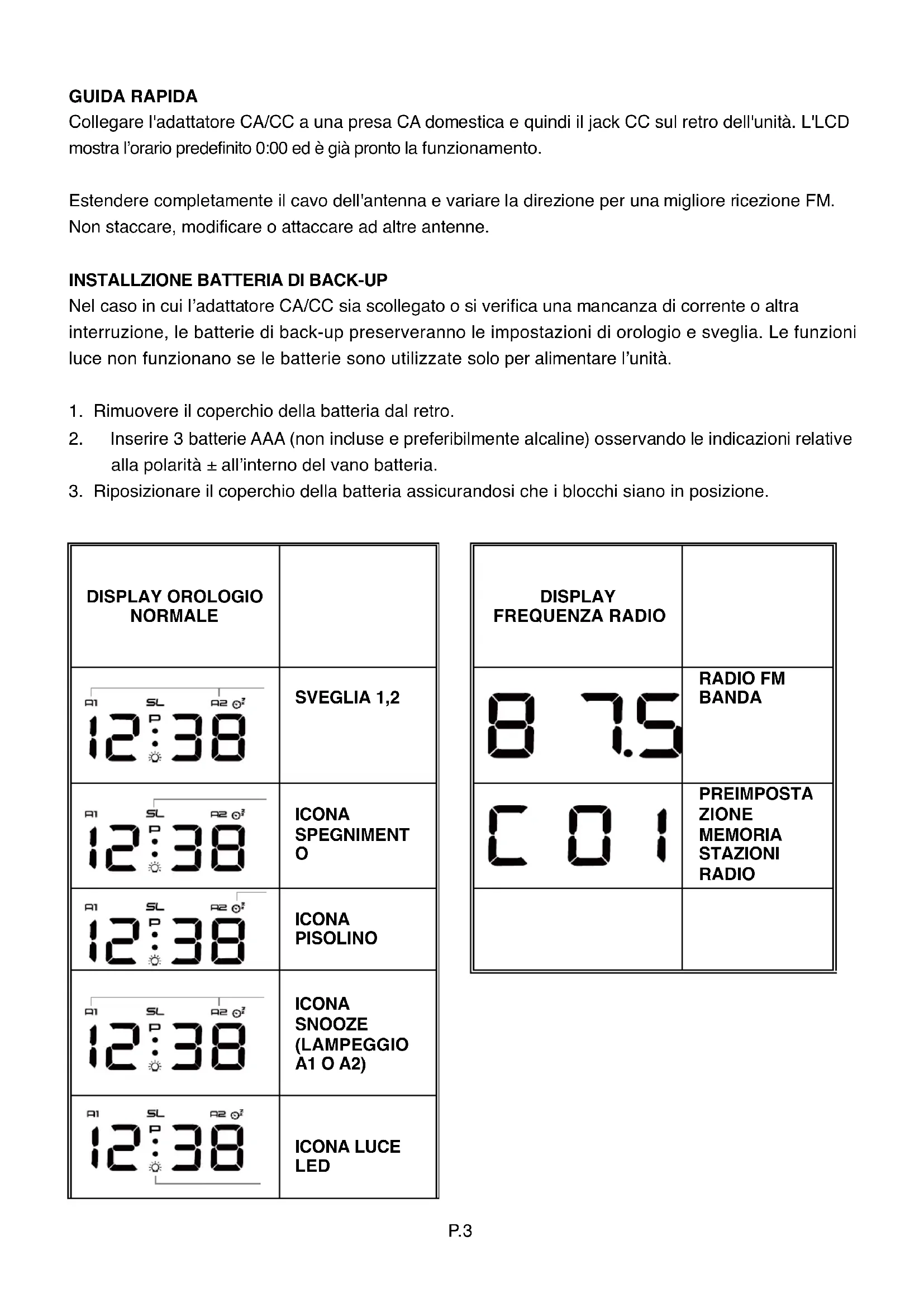 Nel caso in cui l'adattatore CA/CC sua scollegato o si verifica una mancanza di corrente o altra interruzione, le batterie di back-up preserveranno le impostazioni di orologio e sveglia. Le funzioni luce non funzionano se le batterie sono utilizzate solo per alimentare l'unità.