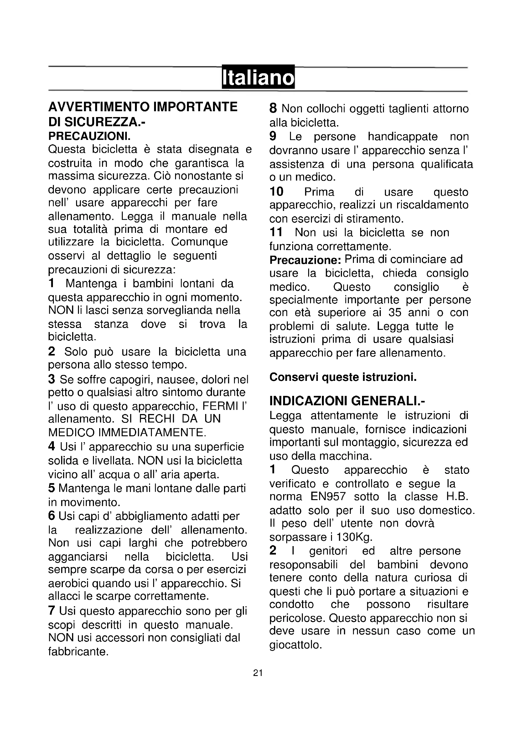 Italiano AVVERTIMENTO IMPORTANTE DI SICUREZZA.- PRECAUZIONI. Questa bicicletta è stata disegnata e costruita in modo che garantisca la massima sicurezza. Ciò nonostante si devono applicare certe precauzioni nell’ usare apparecchi per fare allenamento. Legga il manuale nella sua totalità prima di montare ed utilizzare la bicicletta. Comunque osservi al dettaglio le seguenti precauzioni di sicurezza: