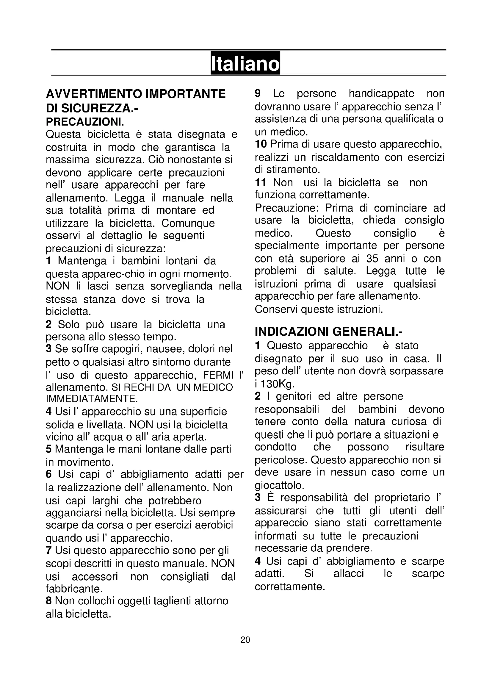 Italiano AVVERTIMENTO IMPORTANTE DI SICUREZZA.- PRECAUZIONI. Questa bicicletta è stata disegnata e costruita in modo che garantisca la massima sicurezza. Ciò nonostante si devono applicare certe precauzioni nell’ usare apparecchi per fare allenamento. Legga il manuale nella sua totalità prima di montare ed utilizzare la bicicletta. Comunque osservi al dettaglio le seguenti precauzioni di sicurezza: 1 Mantenga i bambini lontani da questa apparec-chio in ogni momento. NON li lasci senza sorveglianda nella stessa stanza dove si trova la bicicletta. 2 Solo può usare la bicicletta una persona allo stesso tempo. 3 Se soffre capogiri, nausee, dolori nel petto o qualsiasi altro sintomo durante l’ uso di questo apparecchio, FERMI l’ allenamento. SI RECHI DA UN MEDICO IMMEDIATAMENTE. 4 Usi l’ apparecchio su una superficie solida e livellata. NON usi la bicicletta vicino all’ acqua o all’ aria aperta. 5 Mantenga le mani lontane dalle parti in movimento. 6 Usi capi d’ abbigliamento adatti per la realizzazione dell’ allenamento. Non usi capi larghi che potrebbero agganciarsi nella bicicletta. Usi sempre scarpe da corsa o per esercizi aerobici quando usi l’ apparecchio. 7 Usi questo apparecchio sono per gli scopi descritti in questo manuale. NON usi accessori non consigliati dal fabbricante. 8 Non collochi oggetti taglienti attorno alla bicicletta. 9 Le persone handicappate non dovranno usare l’ apparecchio senza l’ assistenza di una persona qualificata o un medico. 10 Prima di usare questo apparecchio, realizzi un riscaldamento con esercizi di stiramento. 11 Non usi la bicicletta se non funziona correttamente. Precauzione: Prima di cominciare ad usare la bicicletta, chieda consiglo medico. Questo consiglio è specialmente importante per persone con età superiore ai 35 anni o con problemi di salute. Legga tutte le istruzioni prima di usare qualsiasi apparecchio per fare allenamento. Conservi queste istruzioni. INDICAZIONI GENERALI.- 1 Questo apparecchio è stato disegnato per il suo uso in casa. Il peso dell’ utente non dovrà sorpassare i 130Kg. 2 I genitori ed altre persone resoponsabili del bambini devono tenere conto della natura curiosa di questi che li può portare a situazioni e condotto che possono risultare pericolose. Questo apparecchio non si deve usare in nessun caso come un giocattolo. 3 È responsabilità del proprietario l’ assicurarsi che tutti gli utenti dell’ appareccio siano stati correttamente informati su tutte le precauzioni necessarie da prendere. 4 Usi capi d’ abbigliamento e scarpe adatti. Si allacci le scarpe correttamente.21