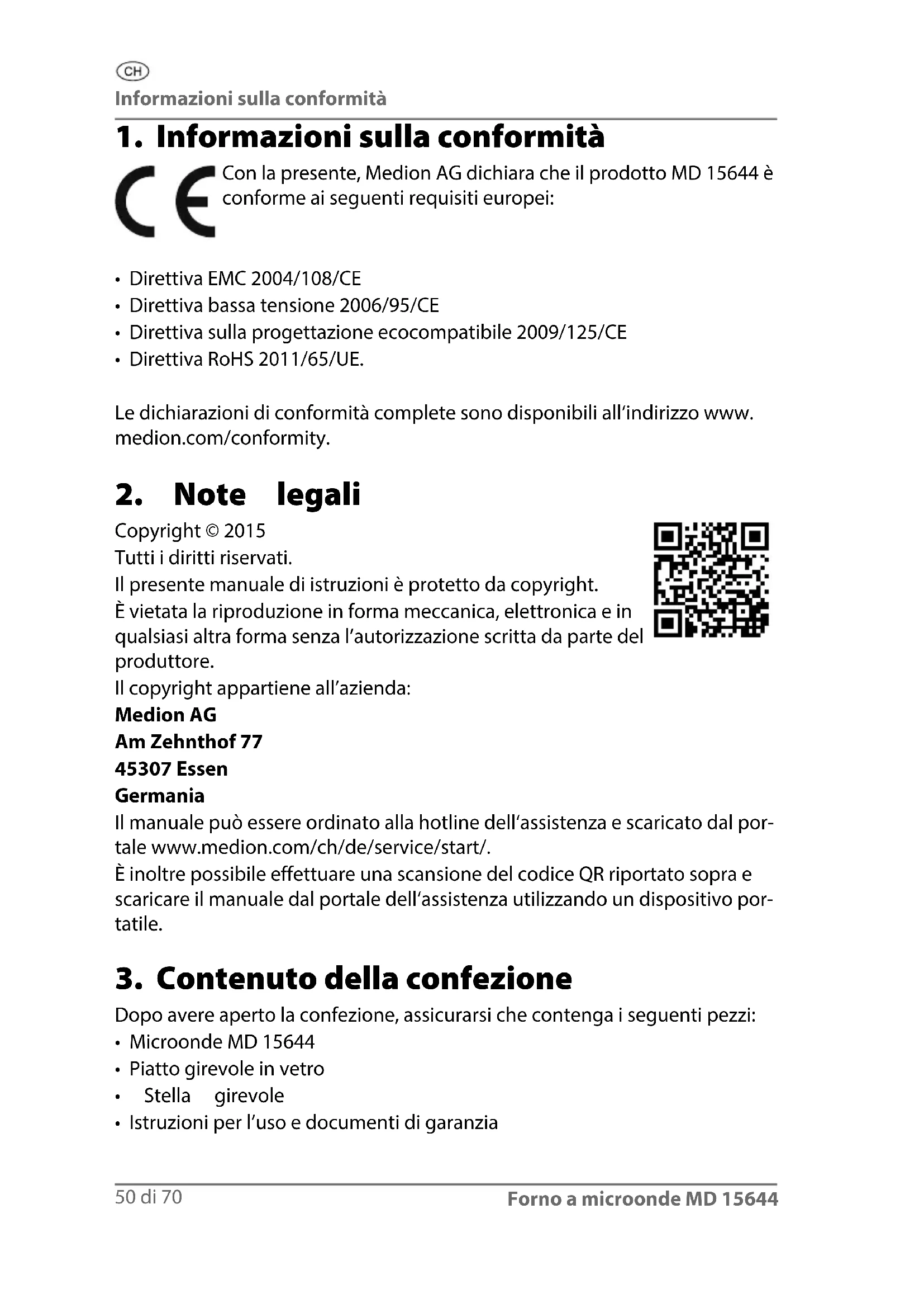 Copyright © 2015 Tutti i diritti riservati. Il presente manuale di istruzioni è protetto da copyright. È vietata la riproduzione in forma meccanica, elettronica e in qualsiasi altra forma senza l’autorizzazione scritta da parte del produttore. Il copyright appartiene all’azienda: Medion AG Am Zehnthof 77 45307 Essen Germania Il manuale può essere ordinato alla hotline dell‘assistenza e scaricato dal por- tale www.medion.com/ch/de/service/start/. È inoltre possibile effettuare una scansione del codice QR riportato sopra e scaricare il manuale dal portale dell‘assistenza utilizzando un dispositivo por- tatile.