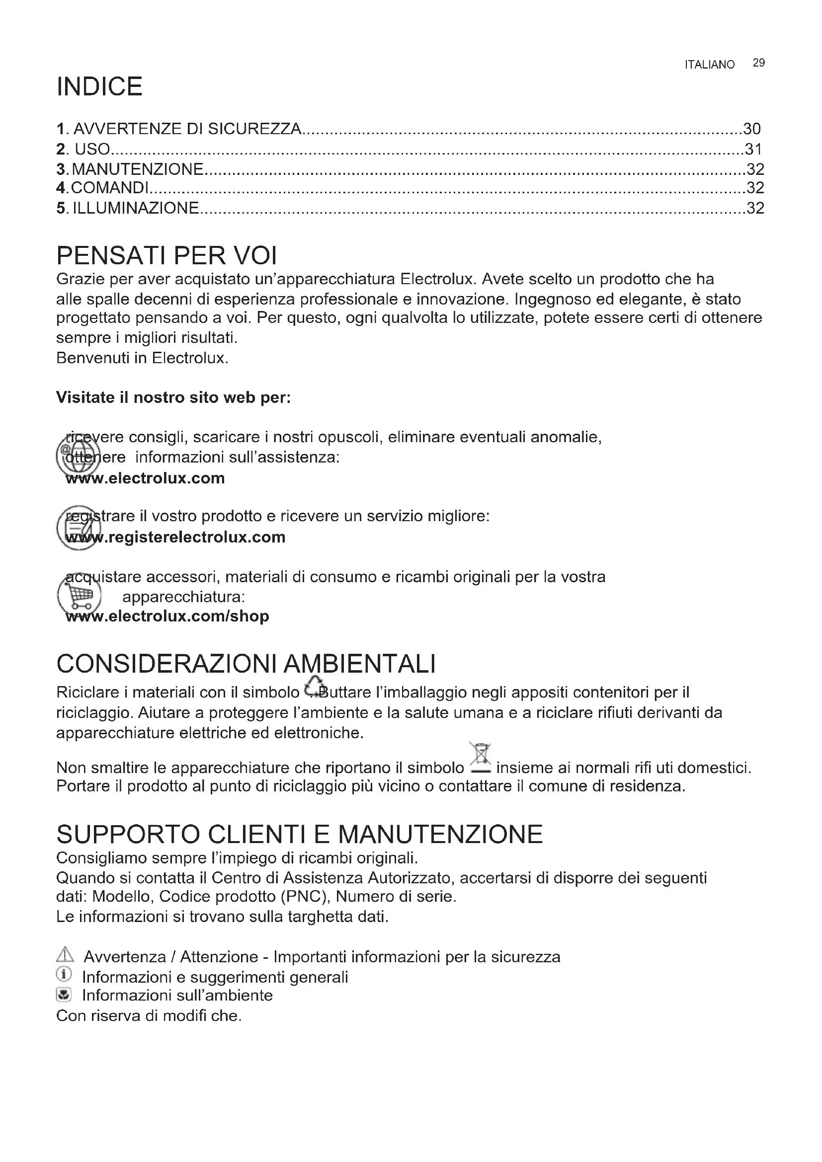 Consigliamo sempre l’impiego di ricambi originali. Quando si contatta il Centro di Assistenza Autorizzato, accertarsi di disporre dei seguenti dati: Modello, Codice prodotto (PNC), Numero di serie. Le informazioni si trovano sulla targhetta dati. Avvertenza / Attenzione - Importanti informazioni per la sicurezza Informazioni e suggerimenti generali Informazioni sull’ambiente Con riserva di modifi che. ITALIANO30 www.electrolux.com