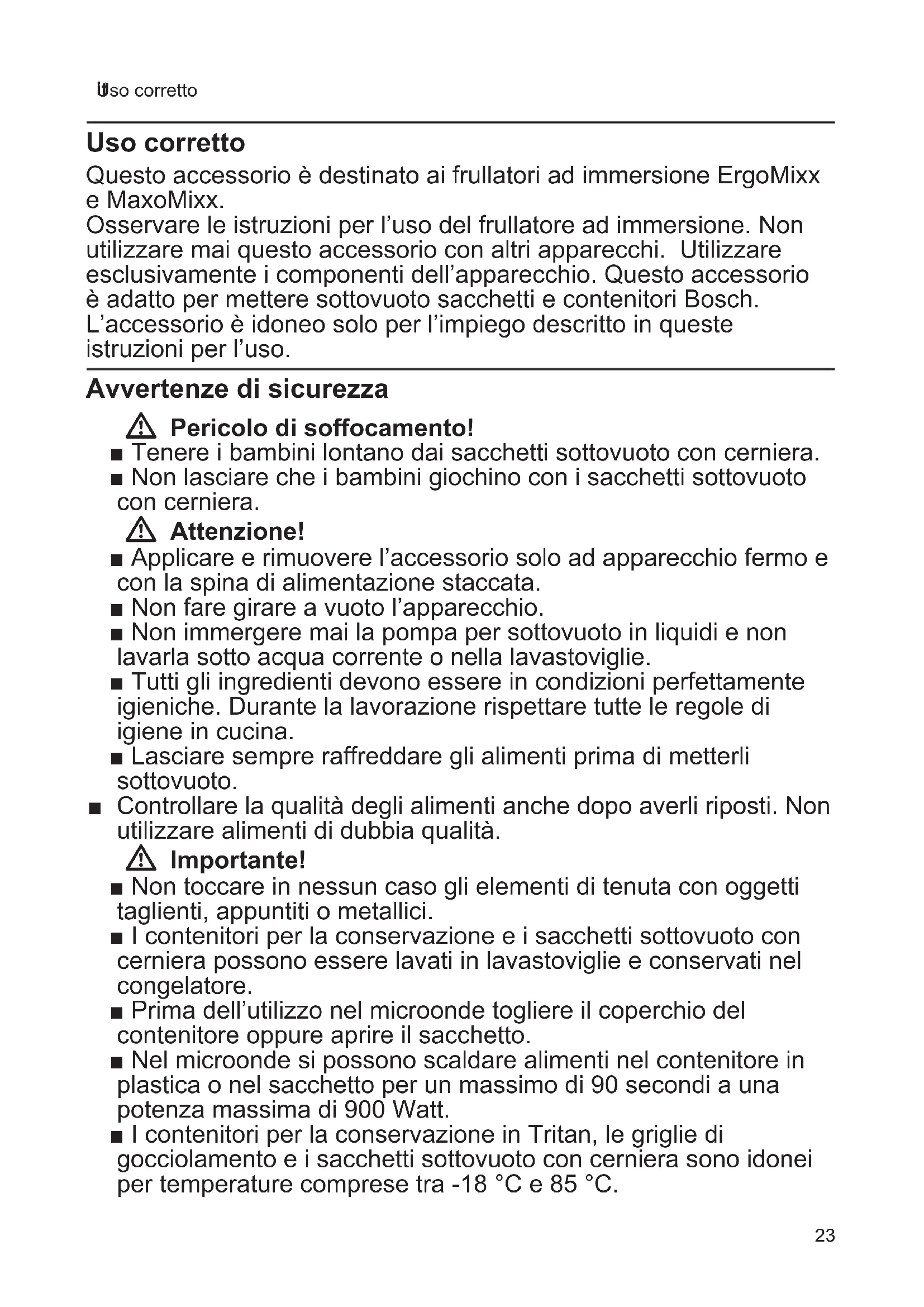 Uso corretto Uso corretto Questo accessorio è destinato ai frullatori ad immersione ErgoMixx e MaxoMixx. Osservare le istruzioni per l’uso del frullatore ad immersione. Non utilizzare mai questo accessorio con altri apparecchi. Utilizzare esclusivamente i componenti dell’apparecchio. Questo accessorio è adatto per mettere sottovuoto sacchetti e contenitori Bosch. L’accessorio è idoneo solo per l’impiego descritto in queste istruzioni per l’uso. Avvertenze di sicurezza W Pericolo di soffocamento! ■ Tenere i bambini lontano dai sacchetti sottovuoto con cerniera. ■ Non lasciare che i bambini giochino con i sacchetti sottovuoto con cerniera. W Attenzione! ■ Applicare e rimuovere l’accessorio solo ad apparecchio fermo e con la spina di alimentazione staccata. ■ Non fare girare a vuoto l’apparecchio. ■ Non immergere mai la pompa per sottovuoto in liquidi e non lavarla sotto acqua corrente o nella lavastoviglie. ■ Tutti gli ingredienti devono essere in condizioni perfettamente igieniche. Durante la lavorazione rispettare tutte le regole di igiene in cucina. ■ Lasciare sempre raffreddare gli alimenti prima di metterli sottovuoto. ■ Controllare la qualità degli alimenti anche dopo averli riposti. Non utilizzare alimenti di dubbia qualità. W Importante! ■ Non toccare in nessun caso gli elementi di tenuta con oggetti taglienti, appuntiti o metallici. ■ I contenitori per la conservazione e i sacchetti sottovuoto con cerniera possono essere lavati in lavastoviglie e conservati nel congelatore. ■ Prima dell’utilizzo nel microonde togliere il coperchio del contenitore oppure aprire il sacchetto. ■ Nel microonde si possono scaldare alimenti nel contenitore in plastica o nel sacchetto per un massimo di 90 secondi a una potenza massima di 900 Watt. ■ I contenitori per la conservazione in Tritan, le griglie di gocciolamento e i sacchetti sottovuoto con cerniera sono idonei per temperature comprese tra -18 °C e 85 °C.24 it Avvertenze di sicurezza Parti ed elementi di comando Contenitore per la conservazione Per conservare alimenti sottovuoto, per prolungare la freschezza e la durata degli alimenti contenuti, per marinarli o riscaldarli nel microonde. Il contenitore in vetro è idoneo anche per l’uso in forno. Prima di utilizzare il contenitore in microonde o in forno togliere il coperchio. Importante! – Riempire il contenitore non superando 1 cm max dal bordo superiore. – Il contenitore di vetro può essere messo direttamente dal congelatore nel forno riscaldato. – Non mettere mai un contenitore caldo nell’acqua. Far raffreddare il contenitore lentamente. Coperchio con guarnizione sottovuoto Per chiudere ermeticamente il contenitore. I coperchi dei contenitori per la conservazione sono dotati di indicatore sottovuoto. Quando l’indicatore si incurva visibilmente verso l’interno, significa che è stato creato il vuoto. Per togliere un coperchio in presenza del vuoto, afferrare la guarnizione sottovuoto da un lato e tirarla verso l’alto. Deve arrivare una quantità sufficiente di aria all’interno per poter togliere il coperchio. I coperchi dei contenitori per la conservazione sono dotati di indicatore della data. Ruotando i due anelli è possibile impostare il giorno e il mese in cui l’alimento è stato inserito nel contenitore. Panoramica X Figura A 1 Pompa per sottovuoto a Valvola del sottovuoto b Collegamento per apparecchio base 2 Contenitore per la conservazione * a Contenitori in: – plastica Tritan * – vetro * b Griglia di gocciolamento * c Coperchio d Clip di chiusura e Guarnizione sottovuoto f Indicatore sottovuoto g Anelli di impostazione della data (giorno/mese) h Guarnizione del coperchio 3 Sacchetti sottovuoto con cerniera * a Chiusura con cerniera b Marcatura max c Guarnizione sottovuoto