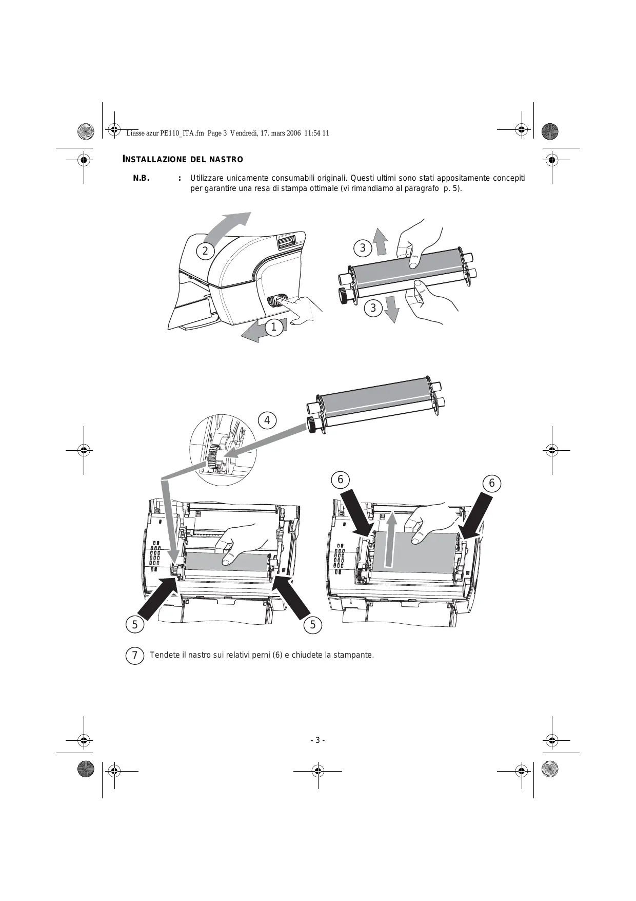 5 Tendete il nastro sui relativi perni (6) e chiudete la stampante.