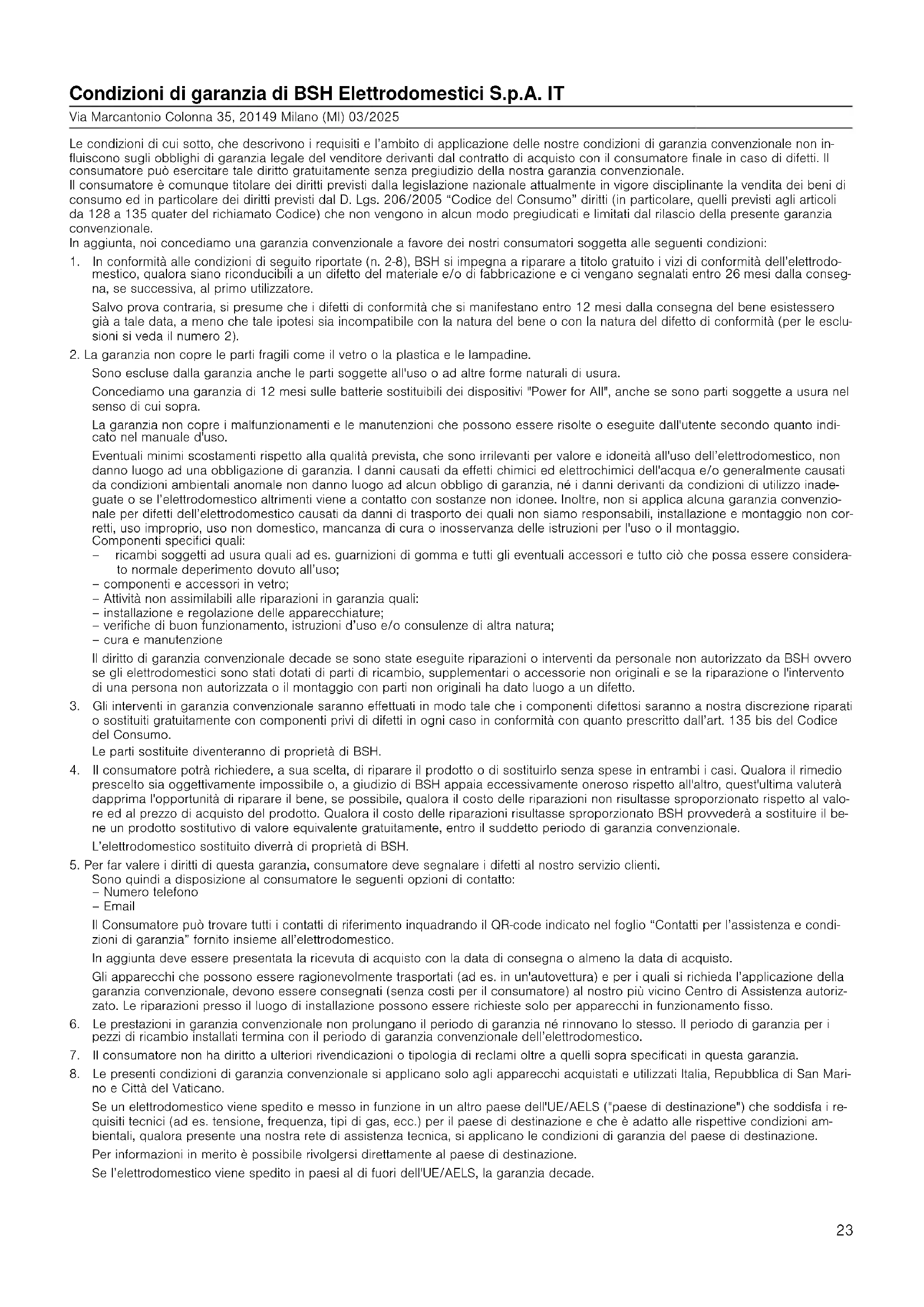 Þjónustuver og viðurkenndir þjónustuaðilar okkar verða áfram þér til reiðu eftir að ábyrgðin er gengin úr gildi. 22Condizioni di garanzia di BSH Elettrodomestici S.p.A. IT Via Marcantonio Colonna 35, 20149 Milano (MI) 03/2025 Le condizioni di cui sotto, che descrivono i requisiti e l’ambito di applicazione delle nostre condizioni di garanzia convenzionale non in- fluiscono sugli obblighi di garanzia legale del venditore derivanti dal contratto di acquisto con il consumatore finale in caso di difetti. Il consumatore può esercitare tale diritto gratuitamente senza pregiudizio della nostra garanzia convenzionale. Il consumatore è comunque titolare dei diritti previsti dalla legislazione nazionale attualmente in vigore disciplinante la vendita dei beni di consumo ed in particolare dei diritti previsti dal D. Lgs. 206/2005 “Codice del Consumo” diritti (in particolare, quelli previsti agli articoli da 128a135 quater del richiamato Codice) che non vengono in alcun modo pregiudicati e limitati dal rilascio della presente garanzia convenzionale. In aggiunta, noi concediamo una garanzia convenzionale a favore dei nostri consumatori soggetta alle seguenti condizioni: 1. In conformità alle condizioni di seguito riportate (n. 2-8), BSH si impegna a riparare a titolo gratuito i vizi di conformità dell’elettrodo- mestico, qualora siano riconducibili a un difetto del materiale e/o di fabbricazione e ci vengano segnalati entro 26mesi dalla conseg- na, se successiva, al primo utilizzatore. Salvo prova contraria, si presume che i difetti di conformità che si manifestano entro 12 mesi dalla consegna del bene esistessero già a tale data, a meno che tale ipotesi sia incompatibile con la natura del bene o con la natura del difetto di conformità (per le esclu- sioni si veda il numero 2).