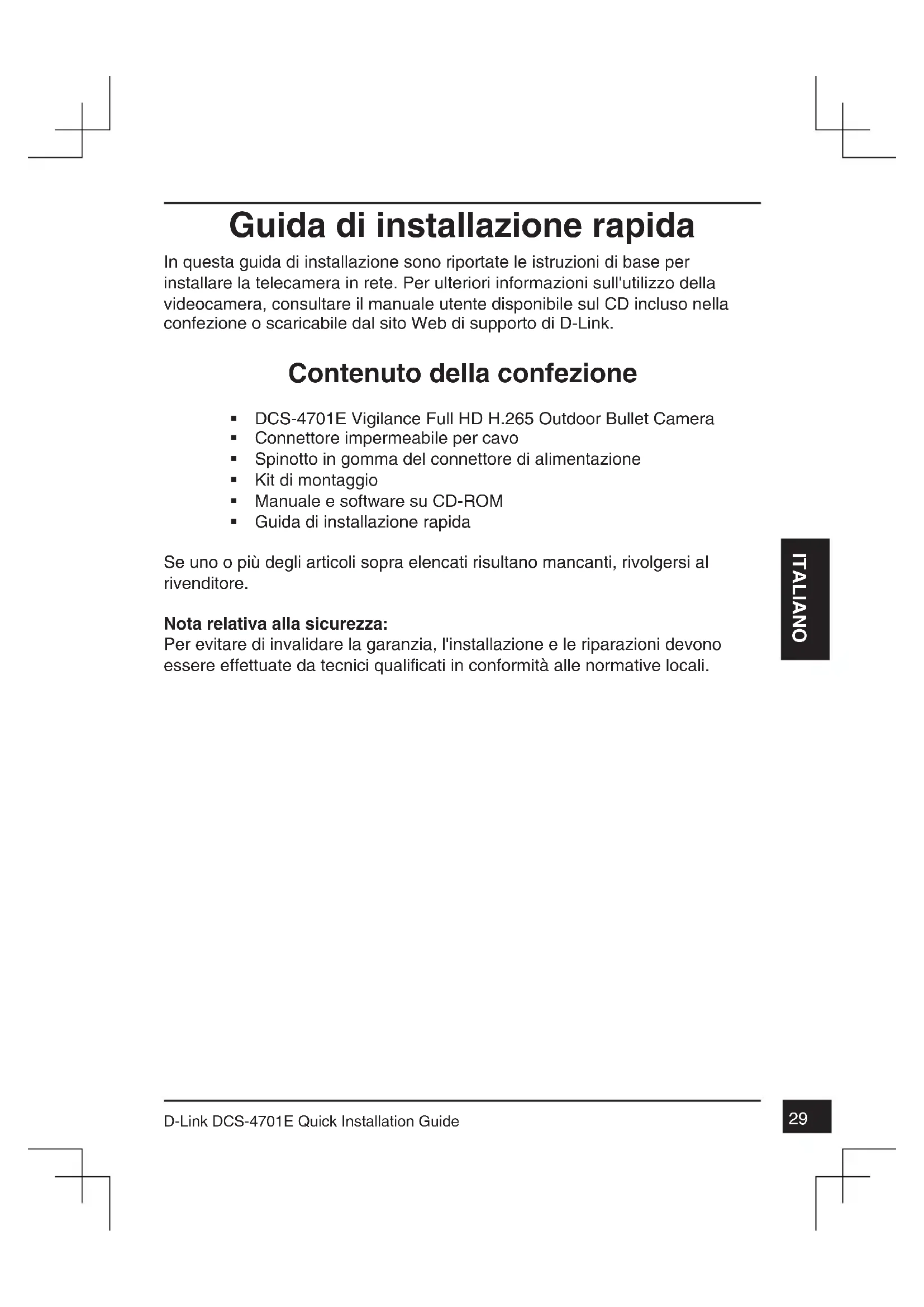 D-Link DCS-4701E Quick Installation Guide ITALIANO Guida di installazione rapida In questa guida di installazione sono riportate le istruzioni di base per installare la telecamera in rete. Per ulteriori informazioni sull'utilizzo della videocamera, consultare il manuale utente disponibile sul CD incluso nella confezione o scaricabile dal sito Web di supporto di D-Link. Contenuto della confezione DCS-4701E Vigilance Full HD H.265 Outdoor Bullet Camera Connettore impermeabile per cavo Spinotto in gomma del connettore di alimentazione Kit di montaggio Manuale e software su CD-ROM Guida di installazione rapida Se uno o più degli articoli sopra elencati risultano mancanti, rivolgersi al rivenditore. Nota relativa alla sicurezza: Per evitare di invalidare la garanzia, l'installazione e le riparazioni devono essere effettuate da tecnici qualificati in conformità alle normative locali.30