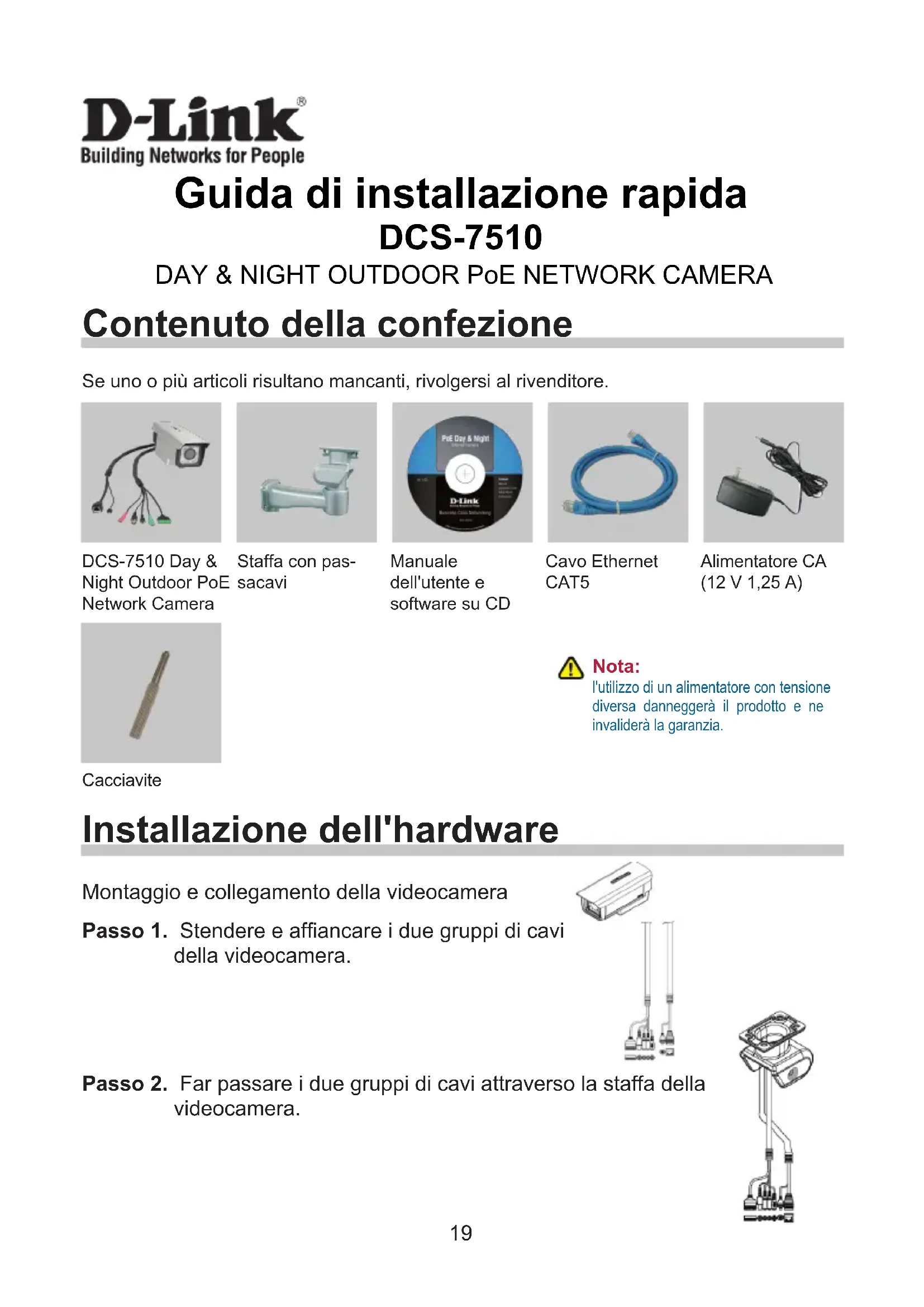 Guida di installazione rapida DCS-7510 DCS-7510 Day & Night Outdoor PoE Network CameraStaffa con pas-sacaviAlimentatore CA (12 V 1,25 A)Se uno o più articoli risultano mancanti, rivolgersi al rivenditore. DAY & NIGHT OUTDOOR PoE NETWORK CAMERA CacciaviteManuale dell'utente e software su CDCavo Ethernet CAT5 Montaggio e collegamento della videocamera Passo 1. Stendere e afancare i due gruppi di cavi della videocamera. Passo 2. Far passare i due gruppi di cavi attraverso la staffa della videocamera. Contenuto della confezione Installazione dell'hardware Nota:l'utilizzo di un alimentatore con tensione diversa danneggerà il prodotto e ne invaliderà la garanzia.20