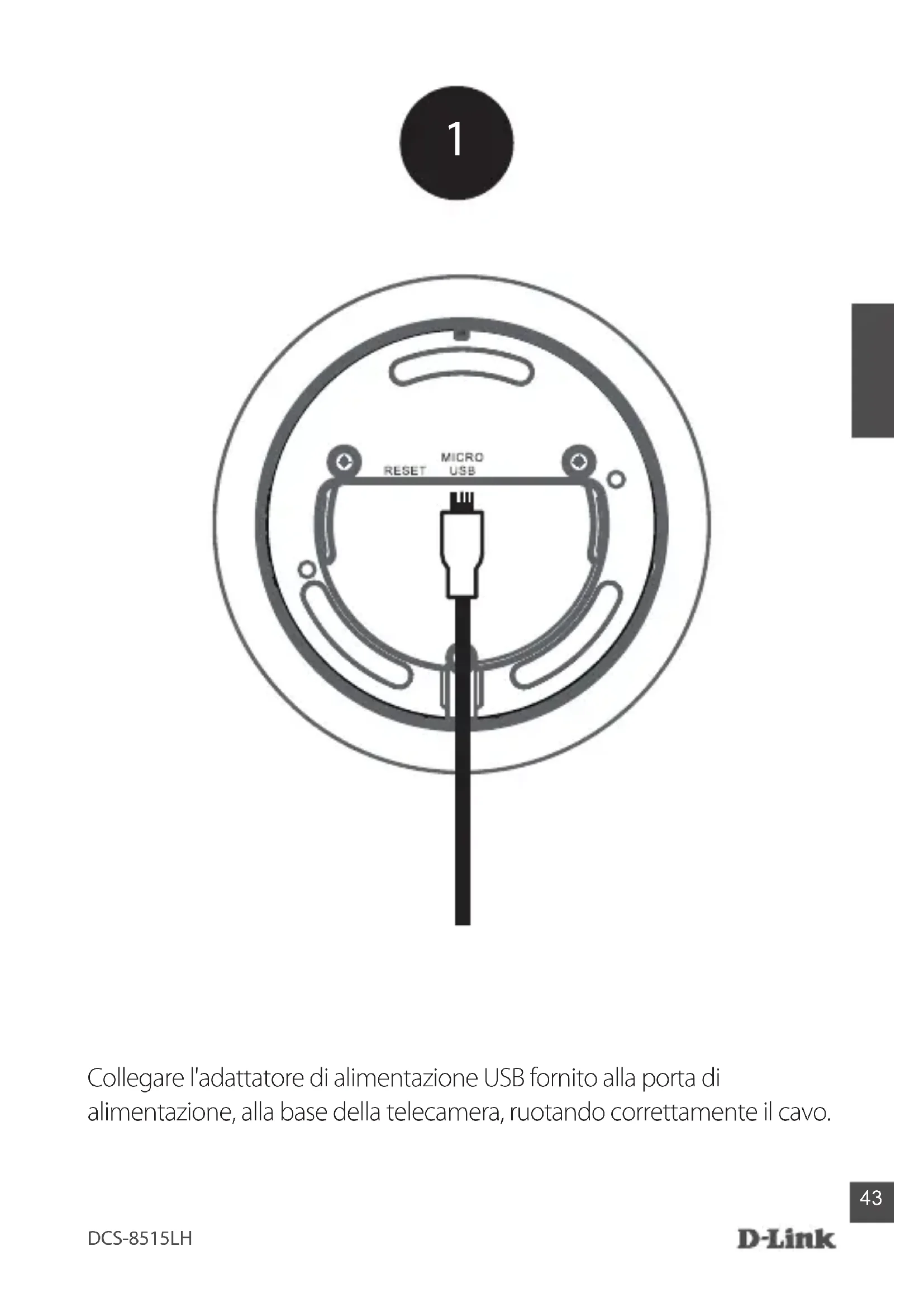 Collegare l'adattatore di alimentazione USB fornito alla porta di alimentazione, alla base della telecamera, ruotando correttamente il cavo.DCS-8515LH