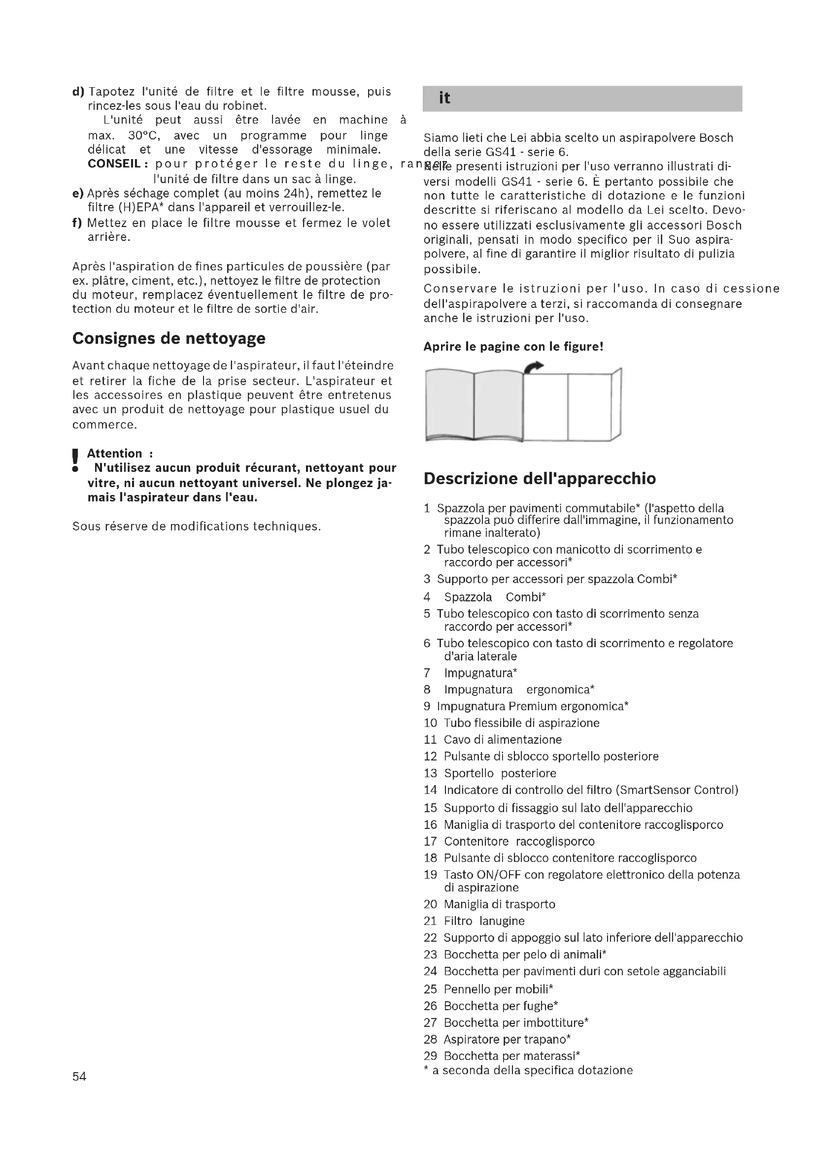 - a seconda della specifica dotazione Siamo lieti che Lei abbia scelto un aspirapolvere Bosch della serie GS41 - serie 6. Nelle presenti istruzioni per l'uso verranno illustrati di- versi modelli GS41 - serie 6. È pertanto possibile che non tutte le caratteristiche di dotazione e le funzioni descritte si riferiscano al modello da Lei scelto. Devo- no essere utilizzati esclusivamente gli accessori Bosch originali, pensati in modo specifico per il Suo aspira- polvere, al fine di garantire il miglior risultato di pulizia possibile. Conservare le istruzioni per l'uso. In caso di cessione dell'aspirapolvere a terzi, si raccomanda di consegnare anche le istruzioni per l'uso. Aprire le pagine con le figure! Descrizione dell'apparecchio 1 Spazzola per pavimenti commutabile* (l'aspetto della spazzola può differire dall'immagine, il funzionamento rimane inalterato) 2 Tubo telescopico con manicotto di scorrimento e raccordo per accessori* 3 Supporto per accessori per spazzola Combi* 4 Spazzola Combi* 5 Tubo telescopico con tasto di scorrimento senza raccordo per accessori* 6 Tubo telescopico con tasto di scorrimento e regolatore d'aria laterale 7 Impugnatura* 8 Impugnatura ergonomica* 9 Impugnatura Premium ergonomica* 10 Tubo flessibile di aspirazione 11 Cavo di alimentazione 12 Pulsante di sblocco sportello posteriore 13 Sportello posteriore 14 Indicatore di controllo del filtro (SmartSensor Control) 15 Supporto di fissaggio sul lato dell'apparecchio 16 Maniglia di trasporto del contenitore raccoglisporco 17 Contenitore raccoglisporco 18 Pulsante di sblocco contenitore raccoglisporco 19 Tasto ON/OFF con regolatore elettronico della potenza di aspirazione 20 Maniglia di trasporto 21 Filtro lanugine 22 Supporto di appoggio sul lato inferiore dell'apparecchio 23 Bocchetta per pelo di animali* 24 Bocchetta per pavimenti duri con setole agganciabili 25 Pennello per mobili* 26 Bocchetta per fughe* 27 Bocchetta per imbottiture* 28 Aspiratore per trapano* 29 Bocchetta per materassi*55