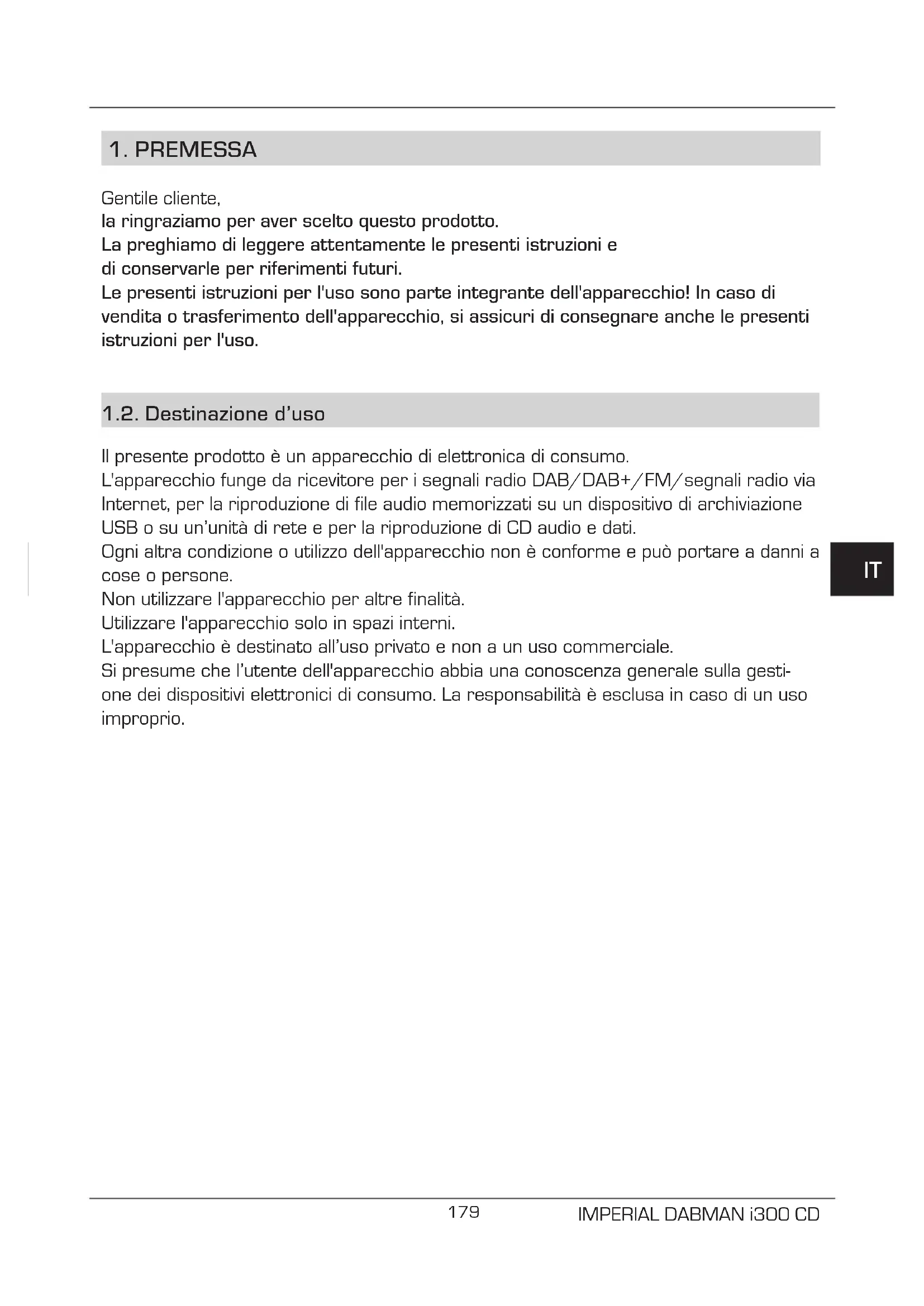 Gentile cliente, la ringraziamo per aver scelto questo prodotto. La preghiamo di leggere attentamente le presenti istruzioni e di conservarle per riferimenti futuri. Le presenti istruzioni per l'uso sono parte integrante dell'apparecchio! In caso di vendita o trasferimento dell'apparecchio, si assicuri di consegnare anche le presenti istruzioni per l'uso. 1.2. Destinazione d’uso Il presente prodotto è un apparecchio di elettronica di consumo. L'apparecchio funge da ricevitore per i segnali radio DAB/DAB+/FM/segnali radio via Internet, per la riproduzione di file audio memorizzati su un dispositivo di archiviazione USB o su un’unità di rete e per la riproduzione di CD audio e dati. Ogni altra condizione o utilizzo dell'apparecchio non è conforme e può portare a danni a cose o persone. Non utilizzare l'apparecchio per altre finalità. Utilizzare l'apparecchio solo in spazi interni. L'apparecchio è destinato all’uso privato e non a un uso commerciale. Si presume che l’utente dell'apparecchio abbia una conoscenza generale sulla gesti- one dei dispositivi elettronici di consumo. La responsabilità è esclusa in caso di un uso improprio.180 Istruzioni per l‘uso NLIT