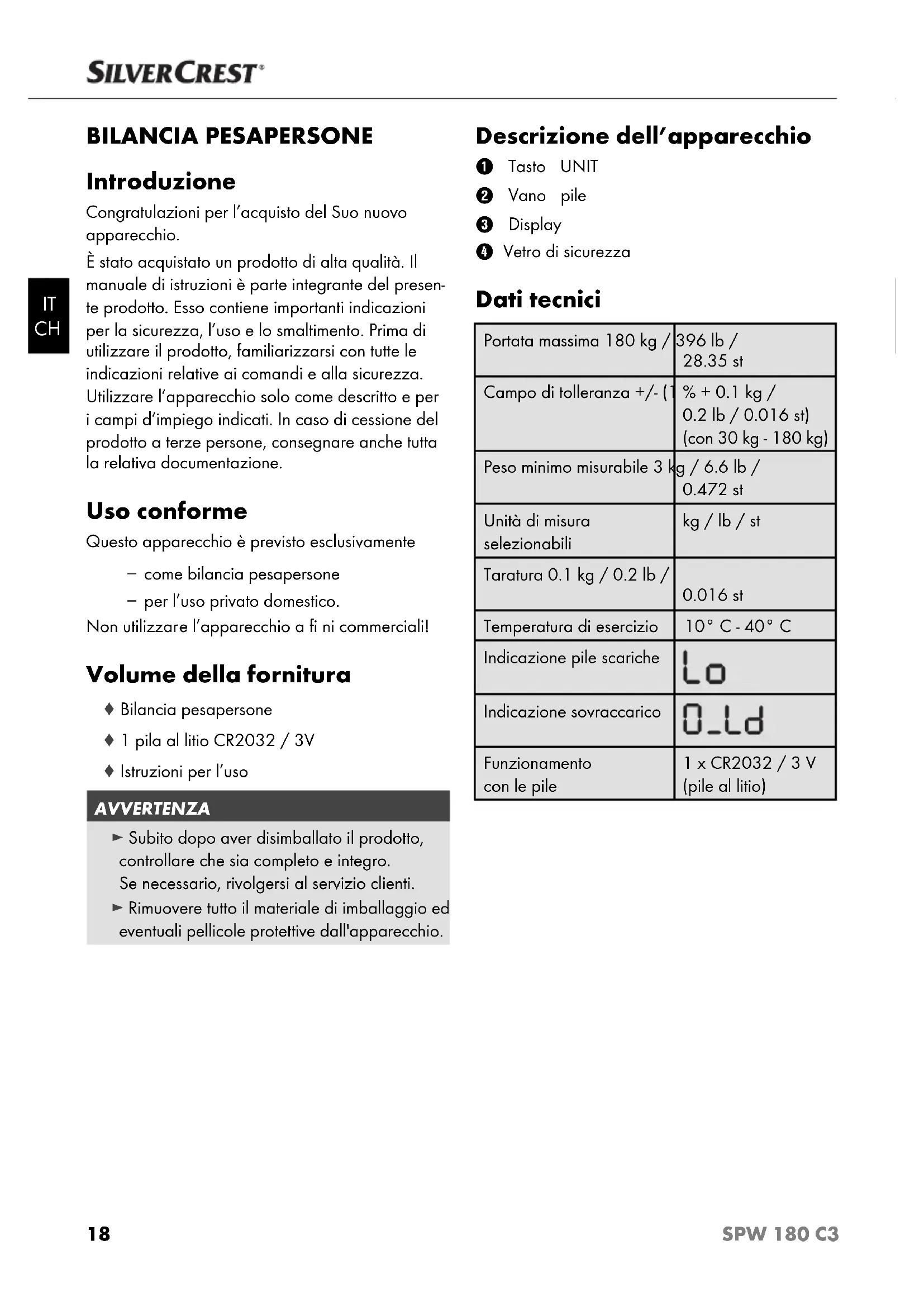 BILANCIA PESAPERSONE Introduzione Congratulazioni per l’acquisto del Suo nuovo apparecchio. È stato acquistato un prodotto di alta qualità. Il manuale di istruzioni è parte integrante del presen- te prodotto. Esso contiene importanti indicazioni per la sicurezza, l’uso e lo smaltimento. Prima di utilizzare il prodotto, familiarizzarsi con tutte le indicazioni relative ai comandi e alla sicurezza. Utilizzare l’apparecchio solo come descritto e per i campi d’impiego indicati. In caso di cessione del prodotto a terze persone, consegnare anche tutta la relativa documentazione. Uso conforme Questo apparecchio è previsto esclusivamente – come bilancia pesapersone – per l’uso privato domestico. Non utilizzar e l’apparecchio a fi ni commerciali! Volume della fornitura ♦ Bilancia pesapersone ♦ 1 pila al litio CR2032 / 3V ♦ Istruzioni per l’uso AVVERTENZA ► Subito dopo aver disimballato il prodotto, contr ollare che sia completo e integro. Se necessario, rivolgersi al servizio clienti. ► Rimuovere tutto il materiale di imballaggio ed