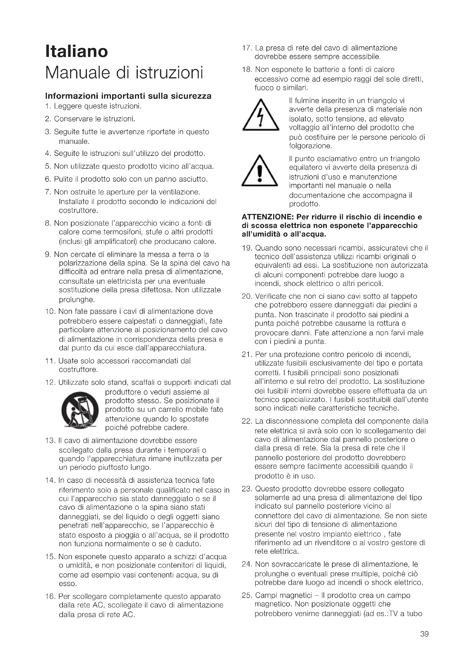 7575 CTSWxx SA1000 Inside 13/1/09 9:45 Page 38Italiano Manuale di istruzioni Informazioni importanti sulla sicurezza