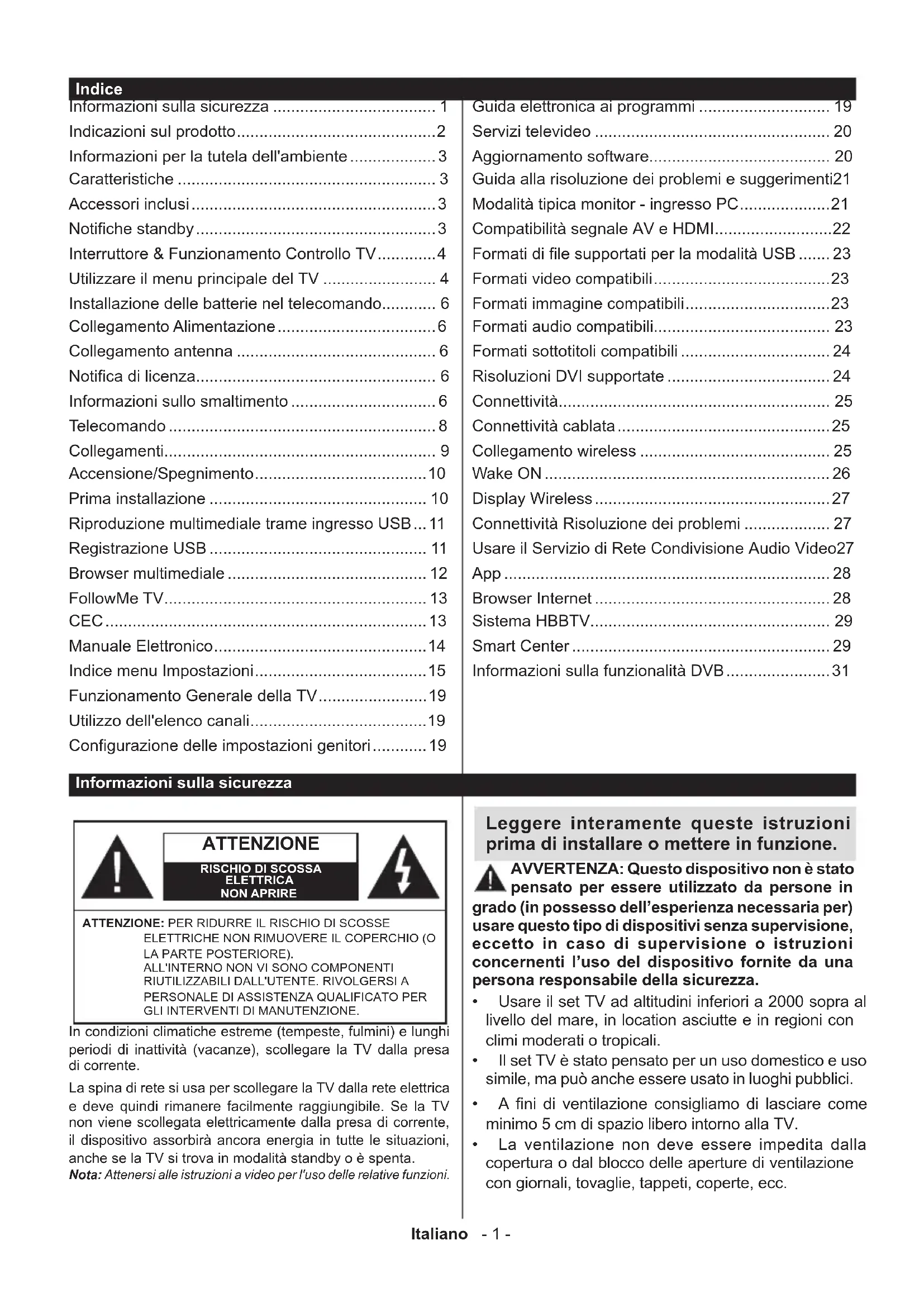 - Premere sul coperchio e farlo scivolare in direzione della freccia. Installare due batterie di tipo AAA/LR03 (1.5V). Ac- certarsi che i simboli (+) e (-) corrispondano (rispettare la polarità). Non utilizzare insieme batterie nuove e vecchie. Sostituire solo con batterie dello stesso tipo o di tipo equivalente. Riposizionare il coperchio. Quando le batterie sono scariche, sullo schermo viene visualizzato un messaggio che indica che devono essere sostituite.. Si noti che quando le batterie sono scariche, le prestazioni del telecomando potrebbero risultare compromesse. Le batterie non devono essere esposte a calore eccessivo, come luce solare, fuoco o simili. Collegamento Alimentazione IMPORTANTE: L’apparecchio TV è progettato per funzionare con alimentazione 220-240V AC, 50 Hz. Dopo aver tolto l'imballaggio, fare in modo che l'apparecchio TV raggiunga la temperatura ambiente prima di collegarlo all'alimentazione principale. Inserire il cavo di alimentazione alla presa della rete elettrica. Collegamento antenna Collegare l’antenna o il cavo TV nella presa INGRESSO ANTENNA (ANT TV) che si trova sulla parte posteriore della TV. Lato poeriore della TV ANT-TV Per collegare un dispositivo alla TV, verificare che sia la TV che il dispositivo engano spenti prima di eseguire eventuali collegamenti. Dopo aver realizzato il collegamento sarà possibile accendere le unità e usarle. Notifica di licenza HDMI, HDMI High-Definition Multimedia Interface e il logo HDMI Logo sono marchi o marchi registrati di HDMI Licensing Administrator, Inc. negli Stati Uniti e in altri Paesi. Prodotto su licenza dei Laboratori Dolby. Dolby, Dolby Audio e il simbolo doppia-D sono marchi registrati di Dolby Laboratories. “YouTube e il logo YouTube sono marchi registrati di Google Inc.” Questo prodotto contiene una tecnologia soggetta a determinati diritti di proprietà intellettuale di Microsoft. L’uso o la distribuzione di questa tecnologia al di fuori del prodotto sono operazioni vietate senza la licenza/ licenze adeguata/adeguate da Microsoft. I proprietari dei contenuti si servono della tecnologia di accesso ai contenuti Microsoft PlayReady™ per proteggere la propria proprietà intellettuale, compresi i contenuti coperti da copyright. Questo dispositivo si serve della tecnologia PlayReady per accedere ai contenuti protetti da PlayReady e/o ai contenuti protetti da WMDRM. Qualora il dispositivo non applichi in modo adeguato le limitazioni sull’uso dei contenuti, i proprietari dei contenuti potrebbero richiedere a Microsoft di revocare l’abilità del dispositivo di usufruire dei contenuti protetti da PlayReady. La revoca non dovrebbe interessare i contenuti non protetti o i contenuti protetti da altre tecnologie di accesso ai contenuti. I proprietari dei contenuti potrebbero richiedere di aggiornare PlayReady per poter accedere ai loro contenuti. Qualora venga rifiutato un aggiornamento, non sarà possibile accedere al contenuto che richiede l’aggiornamento. Il logo “Cl Plus” è un marchio di CI Plus LLP. Il prodotto è protetto da norme sulla proprietà intellettuale di Microsoft Corporation. L’uso o la distrubuzione di tale tecnologia sono vietati salvo esplicita approvazione di Microsoft o di una sussidiaria autorizzata. Informazioni sullo smaltimento [Unione Europea] Questo simbolo sul prodotto o sulla confezione significa che l’apparecchio elettrico o elettronico alla fine del ciclo di esercizio non deve essere smaltito insieme ai rifiuti domestici. È obbligatorioItaliano - 7 - riportarlo ad un punto di raccolta per provvedere al suo riciclaggio o recupero di parti e materie prime, nonché allo smaltimento corretto, conformemente alle leggi nazionali in vigore e alla Direttiva 2012/19/ UE e 2013/56/UE. Assicurando che questo prodotta venga smaltito correttamente, si contribuisce a prevenire potenziali conseguenze negative per l’ambiente e la salute umana che potrebbero invece essere causate da una gestione errata dello smaltimento di questo prodotto. Per maggiori informazioni sul riciclaggio di questo prodotto contattare gli uffici locali, il servizio smaltimenti rifiuti domestici o il negozio presso cui è stato acquistato. A seconda delle leggi nazionali in vigore nel caso di smaltimento scorretto possono essere applicabili varie sanzioni. (Utenti business) Per smaltire questo prodotto, contattare il fornitore e controllare i termini e le condizioni del contratto d’acquisto. [Paesi non -UE] Questi simboli sono validi esclusivamente nell’Unione Europea. Contattare le autorità di zona per maggiori informazioni sullo smaltimento e sul riciclo. Il prodotto e l’imballaggio dovrebbero essere portate al punto di raccolta di zona per essere riciclate. Alcuni punti di raccolta accettano i prodotti in modo gratuito. Nota: La dicitura Pb posta al di sotto del simbolo delle batterie indica che queste contengono piombo.