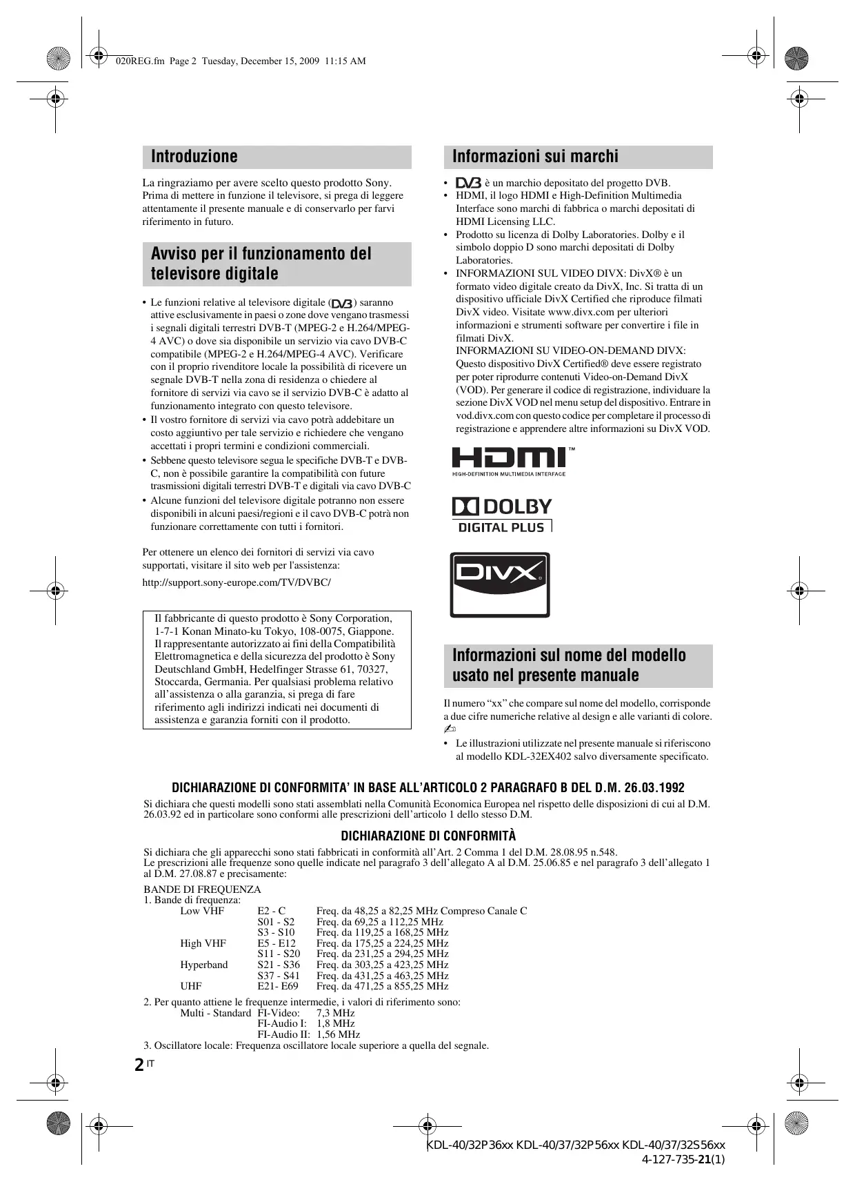 - Vérifiez si l’antenne n’a pas atteint le terme de sa vie utile (trois à cinq ans pour une utilisation normale, un à deux ans au bord de la mer). 19 FR KDL-40/32P36xx KDL-40/37/32P56xx KDL-40/37/32S56xx 4-127-735-21(1) 020REG.fm Page 2 Tuesday, December 15, 2009 11:15 AM Introduzione Informazioni sui marchi La ringraziamo per avere scelto questo prodotto Sony. Prima di mettere in funzione il televisore, si prega di leggere attentamente il presente manuale e di conservarlo per farvi riferimento in futuro. Avviso per il funzionamento del televisore digitale