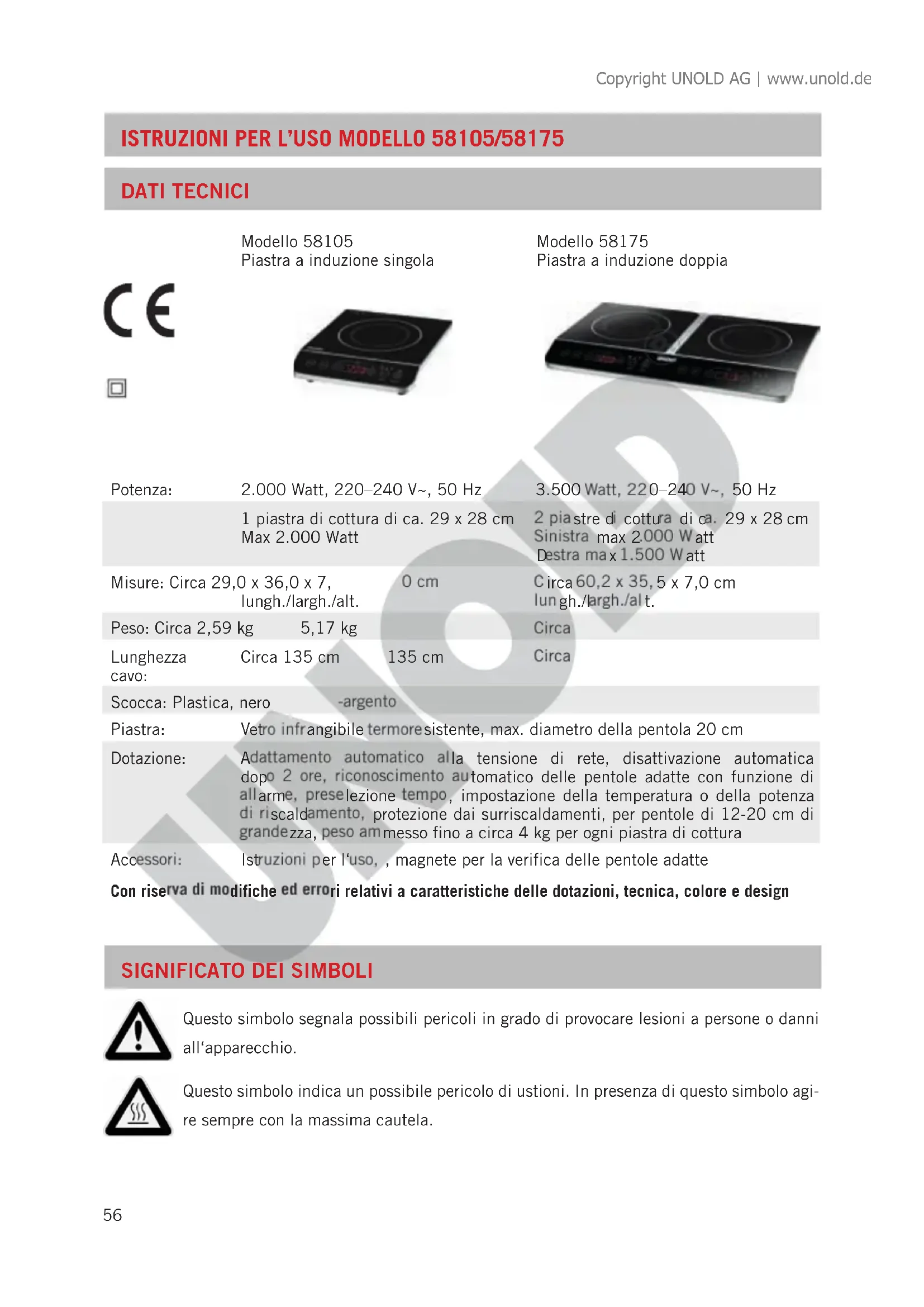 Questo simbolo segnala possibili pericoli in grado di provocare lesioni a persone o danni all‘apparecchio. Questo simbolo indica un possibile pericolo di ustioni. In presenza di questo simbolo agi- re sempre con la massima cautela. Modello 58105 Piastra a induzione singola Modello 58175 Piastra a induzione doppia Potenza: 2.000 Watt, 220–240 V~, 50 Hz 3.500 Watt, 220–240 V~, 50 Hz 1 piastra di cottura di ca. 29 x 28 cm Max 2.000 Watt 2 piastre di cottura di ca. 29 x 28 cm Sinistra max 2.000 Watt Destra max 1.500 Watt Misure: Circa 29,0 x 36,0 x 7,0 cm lungh./largh./alt. Circa 60,2 x 35,5 x 7,0 cm lungh./largh./alt. Peso: Circa 2,59 kg Circa 5,17 kg Lunghezza cavo: Circa 135 cm Circa 135 cm Scocca: Plastica, nero-argento Piastra: Vetro infrangibile termoresistente, max. diametro della pentola 20 cm Dotazione: Adattamento automatico alla tensione di rete, disattivazione automatica dopo 2 ore, riconoscimento automatico delle pentole adatte con funzione di allarme, preselezione tempo, impostazione della temperatura o della potenza di riscaldamento, protezione dai surriscaldamenti, per pentole di 12-20 cm di grandezza, peso ammesso fino a circa 4 kg per ogni piastra di cottura Accessori: Istruzioni per l‘uso, , magnete per la verifica delle pentole adatte Con riserva di modifiche ed errori relativi a caratteristiche delle dotazioni, tecnica, colore e design Copyright UNOLD AG | www.unold.de57