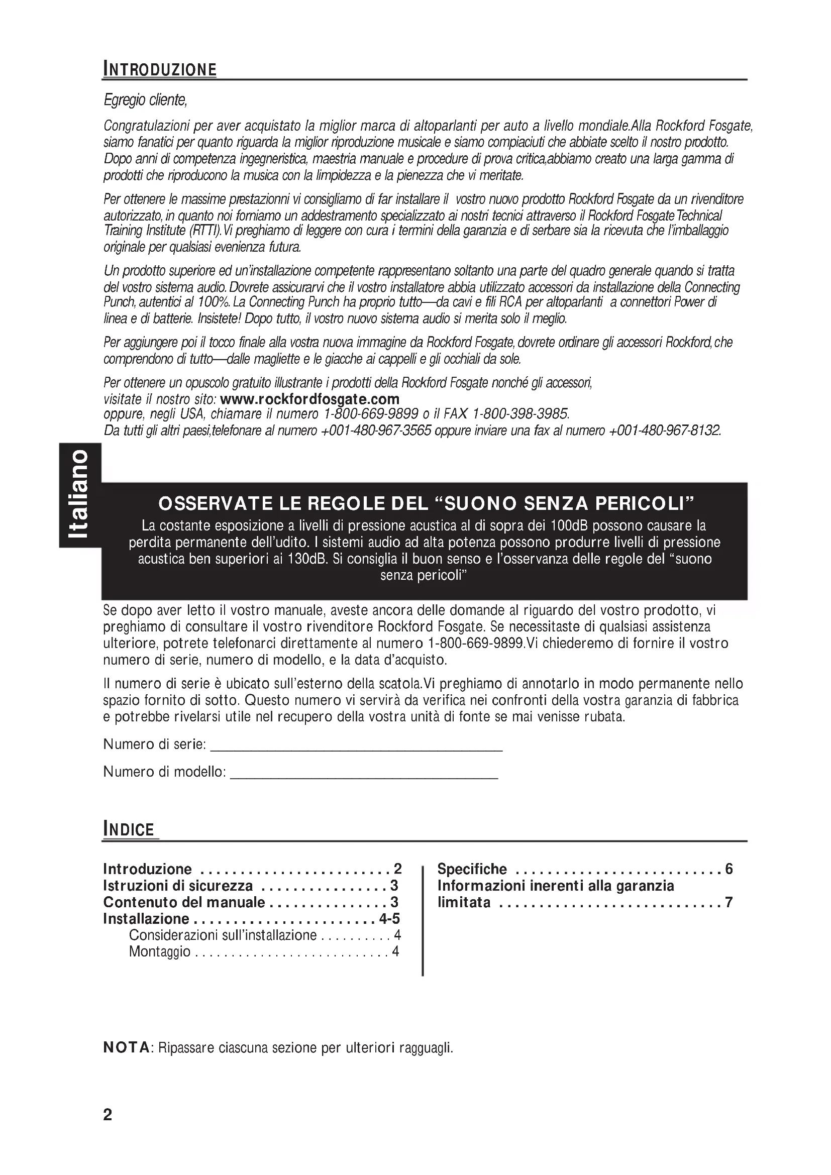 - INTRODUZIONE INDICE Egregio cliente, Congratulazioni per aver acquistato la miglior marca di altoparlanti per auto a livello mondiale.Alla Rockford Fosgate, siamo fanatici per quanto riguarda la miglior riproduzione musicale e siamo compiaciuti che abbiate scelto il nostro prodotto. Dopo anni di competenza ingegneristica, maestria manuale e procedure di prova critica,abbiamo creato una larga gamma di prodotti che riproducono la musica con la limpidezza e la pienezza che vi meritate. Per ottenere le massime prestazionni vi consigliamo di far installare il vostro nuovo prodotto Rockford Fosgate da un rivenditore autorizzato, in quanto noi forniamo un addestramento specializzato ai nostri tecnici attraverso il Rockford Fosgate Technical Training Institute (RTTI).Vi preghiamo di leggere con cura i termini della garanzia e di serbare sia la ricevuta che l’imballaggio originale per qualsiasi evenienza futura. Un prodotto superiore ed un’installazione competente rappresentano soltanto una parte del quadro generale quando si tratta del vostro sistema audio.Dovrete assicurarvi che il vostro installatore abbia utilizzato accessori da installazione della Connecting Punch, autentici al 100%. La Connecting Punch ha proprio tutto—da cavi e fili RCA per altoparlanti a connettori Power di linea e di batterie. Insistete! Dopo tutto, il vostro nuovo sistema audio si merita solo il meglio. Per aggiungere poi il tocco finale alla vostra nuova immagine da Rockford Fosgate, dovrete ordinare gli accessori Rockford,che comprendono di tutto—dalle magliette e le giacche ai cappelli e gli occhiali da sole. Per ottenere un opuscolo gratuito illustrante i prodotti della Rockford Fosgate nonché gli accessori, visitate il nostro sito: www.rockfordfosgate.com oppure, negli USA, chiamare il numero 1-800-669-9899 o il FAX 1-800-398-3985. Da tutti gli altri paesi,telefonare al numero +001-480-967-3565 oppure inviare una fax al numero +001-480-967-8132. OSSERVATE LE REGOLE DEL “SUONO SENZA PERICOLI” La costante esposizione a livelli di pressione acustica al di sopra dei 100dB possono causare la perdita permanente dell’udito. I sistemi audio ad alta potenza possono produrre livelli di pressione acustica ben superiori ai 130dB. Si consiglia il buon senso e l’osservanza delle regole del “suono senza pericoli” NOTA: Ripassare ciascuna sezione per ulteriori ragguagli. Se dopo aver letto il vostro manuale, aveste ancora delle domande al riguardo del vostro prodotto, vi preghiamo di consultare il vostro rivenditore Rockford Fosgate. Se necessitaste di qualsiasi assistenza ulteriore, potrete telefonarci direttamente al numero 1-800-669-9899.Vi chiederemo di fornire il vostro numero di serie, numero di modello, e la data d’acquisto. Il numero di serie è ubicato sull’esterno della scatola.Vi preghiamo di annotarlo in modo permanente nello spazio fornito di sotto. Questo numero vi servirà da verifica nei confronti della vostra garanzia di fabbrica e potrebbe rivelarsi utile nel recupero della vostra unità di fonte se mai venisse rubata. Numero di serie: ____________________________________ Numero di modello: _________________________________ Introduzione p. 2