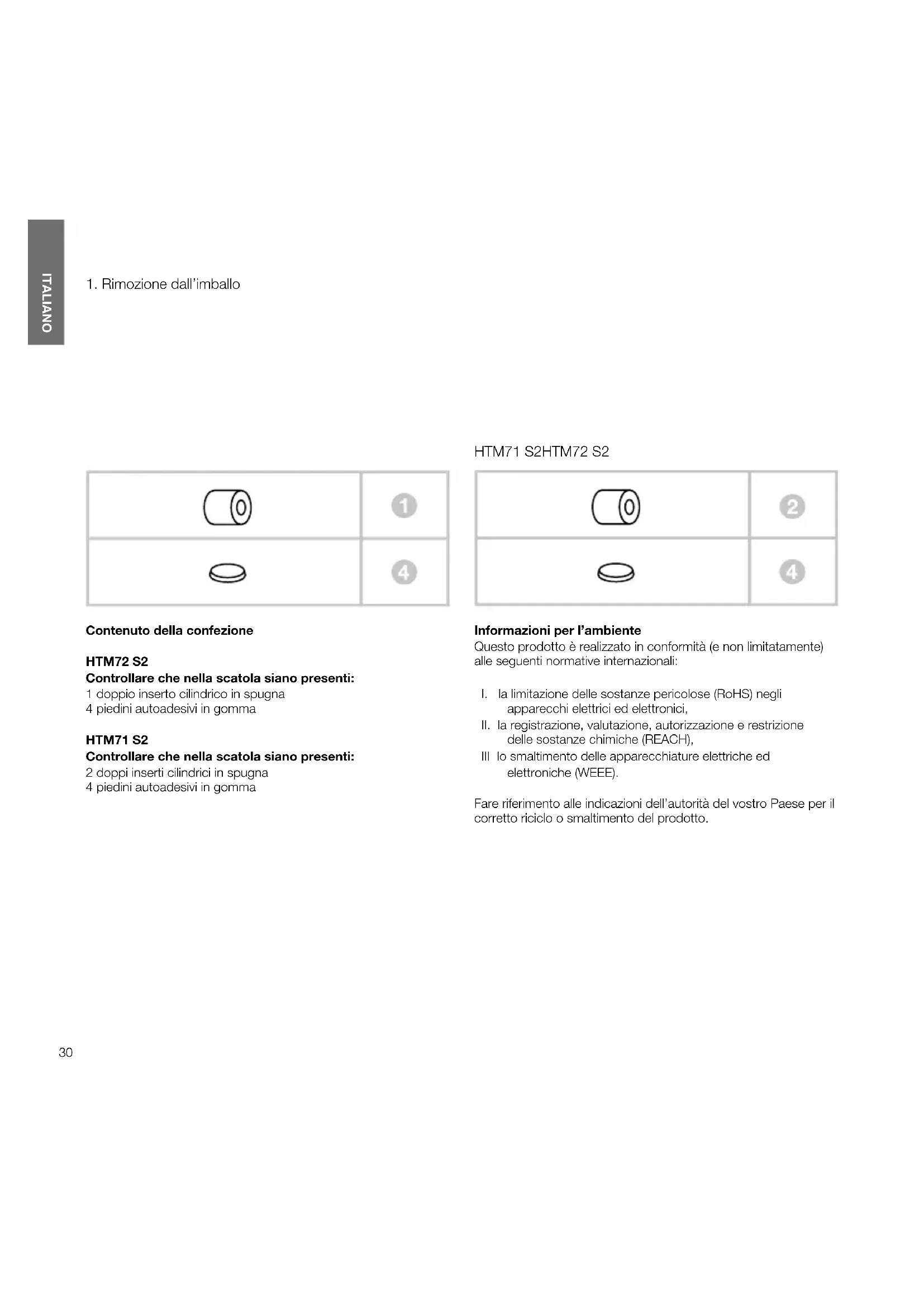 Contenuto della confezione HTM72S2 Controllare che nella scatola siano presenti: 1 doppio inserto cilindrico in spugna 4 piedini autoadesivi in gomma HTM71S2 Controllare che nella scatola siano presenti: 2 doppi inserti cilindrici in spugna 4 piedini autoadesivi in gomma Informazioni per l’ambiente Questo prodotto è realizzato in conformità (e non limitatamente) alle seguenti normative internazionali: