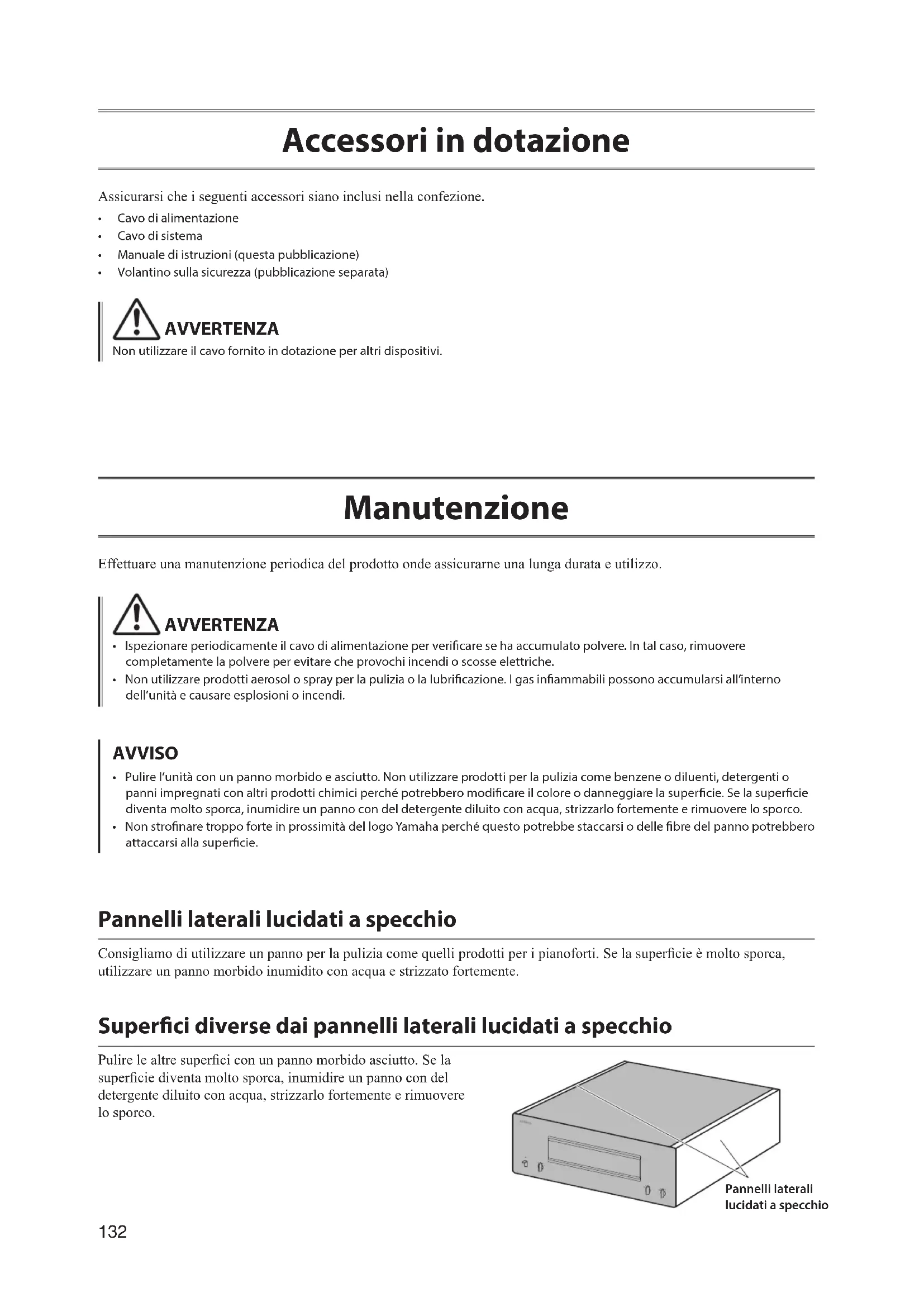 - Cavo di alimentazione• Cavo di sistema• Manuale di istruzioni (questa pubblicazione)• Volantino sulla sicurezza (pubblicazione separata) AVVERTENZA Non utilizzare il cavo fornito in dotazione per altri dispositivi. Manutenzione Effettuare una manutenzione periodica del prodotto onde assicurarne una lunga durata e utilizzo. AVVERTENZA
