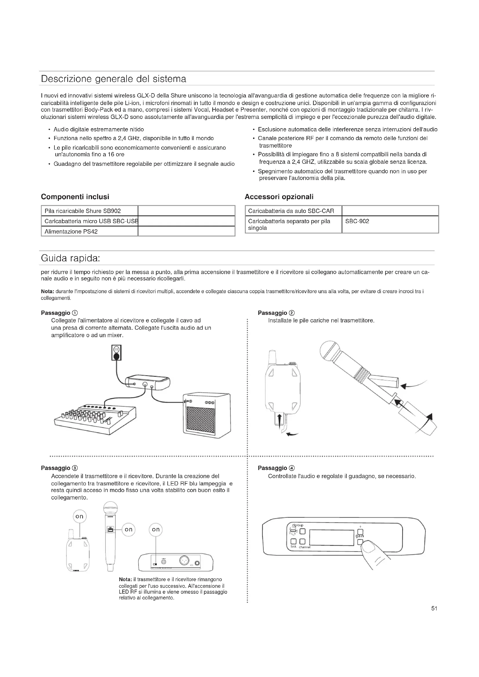 - Consulte al concesionario o a un técnico de radio/TV con experiencia para recibir ayuda.51 Descrizione generale del sistema I nuovi ed innovativi sistemi wireless GLX-D della Shure uniscono la tecnologia all'avanguardia di gestione automatica delle frequenze con la migliore ri- caricabilità intelligente delle pile Li-ion, i microfoni rinomati in tutto il mondo e design e costruzione unici. Disponibili in un'ampia gamma di configurazioni con trasmettitori Body-Pack ed a mano, compresi i sistemi Vocal, Headset e Presenter, nonché con opzioni di montaggio tradizionale per chitarra. I riv- oluzionari sistemi wireless GLX-D sono assolutamente all'avanguardia per l'estrema semplicità di impiego e per l'eccezionale purezza dell'audio digitale.