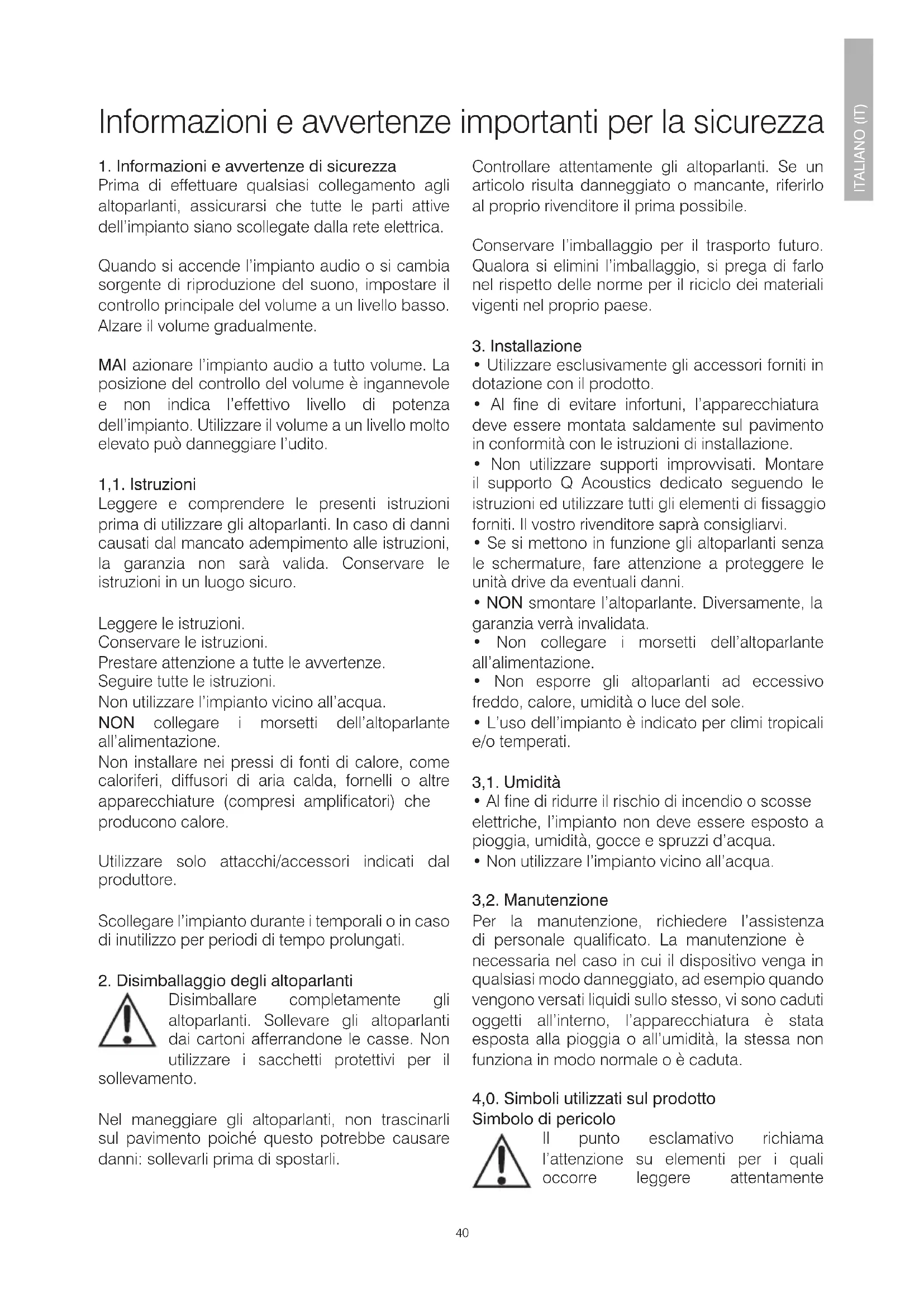 Prima di effettuare qualsiasi collegamento agli altoparlanti, assicurarsi che tutte le parti attive dell’impianto siano scollegate dalla rete elettrica. Quando si accende l’impianto audio o si cambia sorgente di riproduzione del suono, impostare il controllo principale del volume a un livello basso. Alzare il volume gradualmente. MAI azionare l’impianto audio a tutto volume. La posizione del controllo del volume è ingannevole e non indica l’effettivo livello di potenza dell’impianto. Utilizzare il volume a un livello molto elevato può danneggiare l’udito. 1,1. Istruzioni Leggere e comprendere le presenti istruzioni prima di utilizzare gli altoparlanti. In caso di danni causati dal mancato adempimento alle istruzioni, la garanzia non sarà valida. Conservare le istruzioni in un luogo sicuro. Leggere le istruzioni. Conservare le istruzioni. Prestare attenzione a tutte le avvertenze. Seguire tutte le istruzioni. Non utilizzare l’impianto vicino all’acqua. NON collegare i morsetti dell’altoparlante all’alimentazione. Non installare nei pressi di fonti di calore, come caloriferi, diffusori di aria calda, fornelli o altre apparecchiature (compresi amplicatori) che producono calore. Utilizzare solo attacchi/accessori indicati dal produttore. Scollegare l’impianto durante i temporali o in caso di inutilizzo per periodi di tempo prolungati.