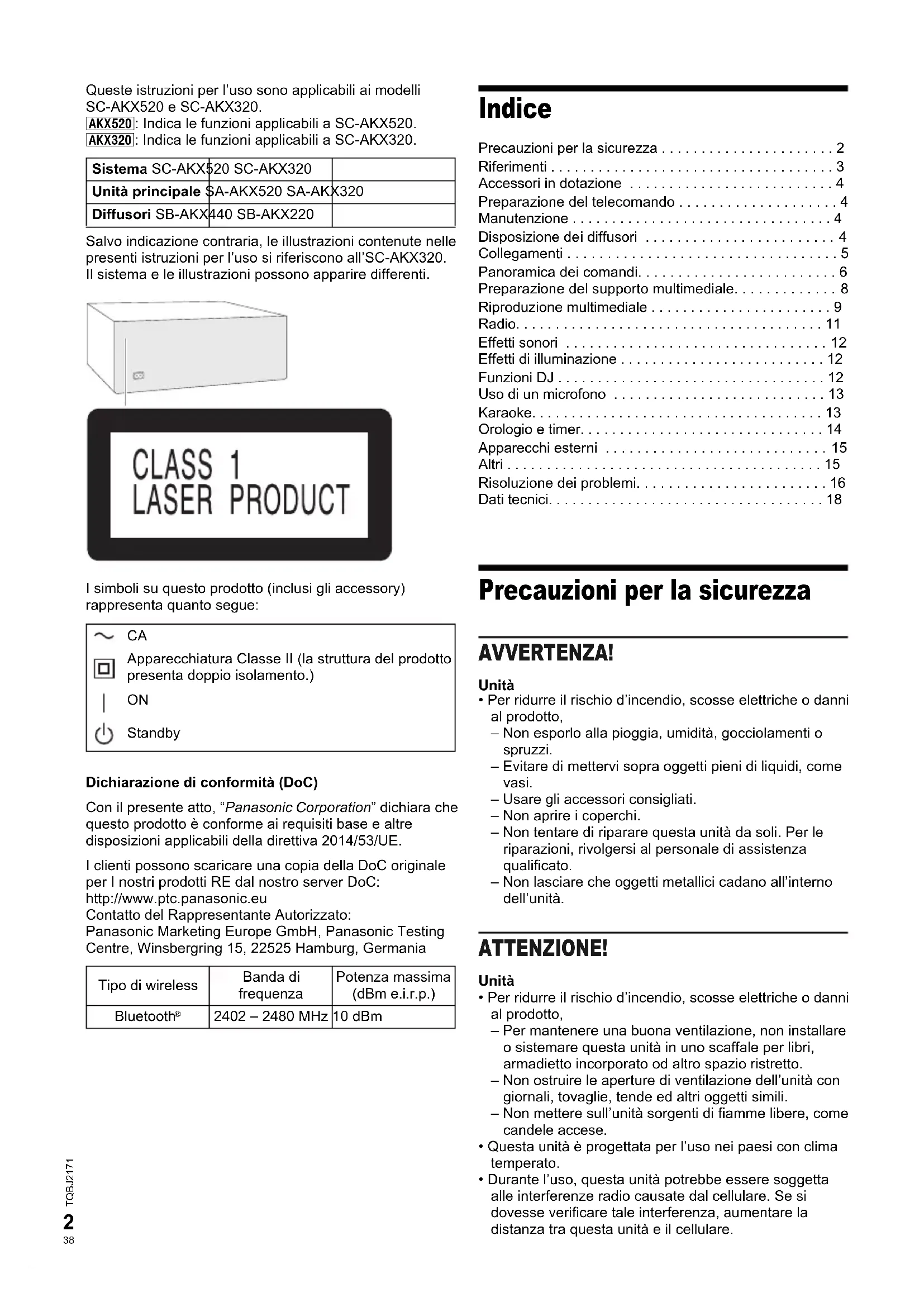Versione 4.2 Classe Classe 2 Profili supportati A2DP, AVRCP, SPP Banda di frequenza Banda a 2,4 GHz FH-SS Frequenza operativa Da 2402 MHz, a 2480 MHz Potenza massima (e.i.r.p.) 10 dBm Distanza operativa Campo visivo di 10 m Codec supportato SBC Alimentazione CA da 220 V a 240 V, 50 Hz Consumo di corrente [AKX520] 86 W [AKX320] 60 W Consumo di corrente nella modalità di attesa (circa) Con “BLUETOOTH STANDBY” impostato su “OFF” 0,5 W Con “BLUETOOTH STANDBY” impostato su “ON” 0,6 W SC-AKX520.320 E TQBJ2171-1 (03) It.fm Page 18 Friday, January 11, 2019 2:02 PM19 TQBJ2171
