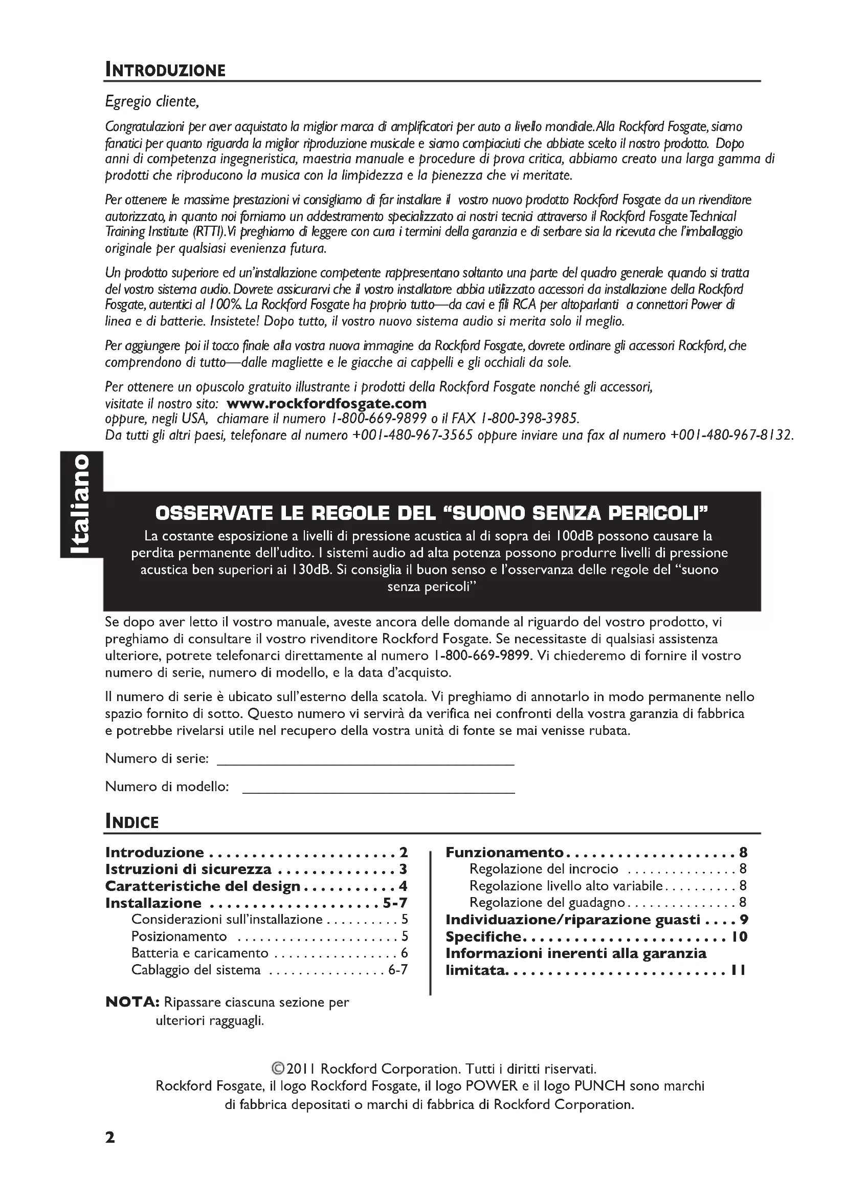- Einschränkung von implizierten Garantien Implizierte Garantien, einschließlich von Garantien der Eignung für einen bestimmten Zweck und Marktgängigkeit, werden auf den Zeitraum der obenstehenden ausdrücklichen Garantie beschränkt. Manche Staaten erlauben Einschränkungen der Gültigkeit der implizierten Garantie nicht. Daher trifft diese Einschränkung nicht in allen Fällen zu. Inanspruchnahme des Kundendienstes Kontaktieren Sie bitte den Rockford Fosgate Vertragshändler, bei dem Sie dieses Produkt gekauft haben. Benötigen Sie zusätzliche Hilfe, rufen Sie den Kundendienst von Rockford unter 1-800-669-9899 an. Sie erhalten dann eine RA# (Rücksendungsautorisierungsnummer), um jegliche Produkte an Rockford Fosgate zurückzusenden. Sie sind für die Rücksendung des Produkts an Rockford verantwortlich. EU-Garantie Dieses Produkt entspricht den gültigen EU-Garantiebestimmungen. Sprechen Sie mit Ihrem Vertragshändler über die Einzelheiten.2 Italiano INTRODUZIONE INDICE Egregio cliente, Congratulazioni per aver acquistato la miglior marca di amplificatori per auto a livello mondiale. Alla Rockford Fosgate, siamo fanatici per quanto riguarda la miglior riproduzione musicale e siamo compiaciuti che abbiate scelto il nostro prodotto. Dopo anni di competenza ingegneristica, maestria manuale e procedure di prova critica, abbiamo creato una larga gamma di prodotti che riproducono la musica con la limpidezza e la pienezza che vi meritate. Per ottenere le massime prestazioni vi consigliamo di far installare il vostro nuovo prodotto Rockford Fosgate da un rivenditore autorizzato, in quanto noi forniamo un addestramento specializzato ai nostri tecnici attraverso il Rockford Fosgate Technical Training Institute (RTTI). Vi preghiamo di leggere con cura i termini della garanzia e di serbare sia la ricevuta che l’imballaggio originale per qualsiasi evenienza futura. Un prodotto superiore ed un’installazione competente rappresentano soltanto una parte del quadro generale quando si tratta del vostro sistema audio. Dovrete assicurarvi che il vostro installatore abbia utilizzato accessori da installazione della Rockford Fosgate, autentici al 100%. La Rockford Fosgate ha proprio tutto—da cavi e fili RCA per altoparlanti a connettori Power di linea e di batterie. Insistete! Dopo tutto, il vostro nuovo sistema audio si merita solo il meglio. Per aggiungere poi il tocco finale alla vostra nuova immagine da Rockford Fosgate, dovrete ordinare gli accessori Rockford, che comprendono di tutto—dalle magliette e le giacche ai cappelli e gli occhiali da sole. Per ottenere un opuscolo gratuito illustrante i prodotti della Rockford Fosgate nonché gli accessori, visitate il nostro sito: www.rockfordfosgate.com oppure, negli USA, chiamare il numero 1-800-669-9899 o il FAX 1-800-398-3985. Da tutti gli altri paesi, telefonare al numero +001-480-967-3565 oppure inviare una fax al numero +001-480-967-8132. OOSSSSEERRVVAATTEE LLEE RREEGGOOLLEE DDEELL ““SSUUOONNOO SSEENNZZAA PPEERRIICCOOLLII”” La costante esposizione a livelli di pressione acustica al di sopra dei 100dB possono causare la perdita permanente dell’udito. I sistemi audio ad alta potenza possono produrre livelli di pressione acustica ben superiori ai 130dB. Si consiglia il buon senso e l’osservanza delle regole del “suono senza pericoli” NOTA: Ripassare ciascuna sezione per ulteriori ragguagli. Se dopo aver letto il vostro manuale, aveste ancora delle domande al riguardo del vostro prodotto, vi preghiamo di consultare il vostro rivenditore Rockford Fosgate. Se necessitaste di qualsiasi assistenza ulteriore, potrete telefonarci direttamente al numero 1-800-669-9899. Vi chiederemo di fornire il vostro numero di serie, numero di modello, e la data d’acquisto. Il numero di serie è ubicato sull’esterno della scatola. Vi preghiamo di annotarlo in modo permanente nello spazio fornito di sotto. Questo numero vi servirà da verifica nei confronti della vostra garanzia di fabbrica e potrebbe rivelarsi utile nel recupero della vostra unità di fonte se mai venisse rubata. Numero di serie: ____________________________________ Numero di modello: _________________________________ Introduzione p. 2