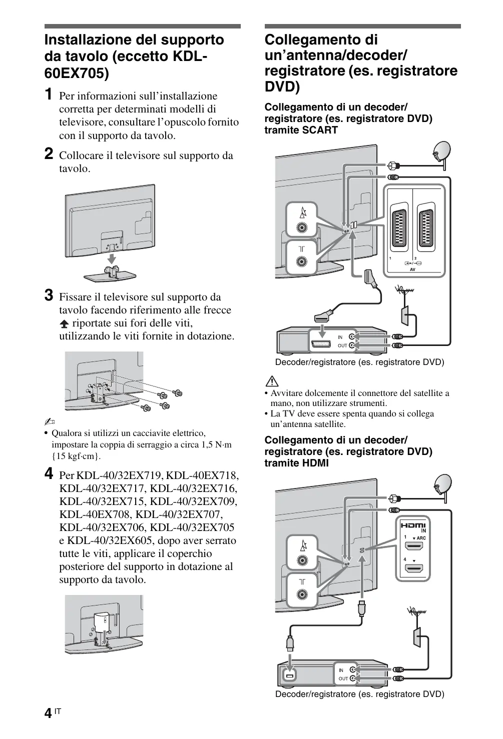 - La TV deve essere spenta quando si collega un’antenna satellite. Collegamento di un decoder/ registratore (es. registratore DVD) tramite HDMI Per KDL-40/32EX719, KDL-40EX718, KDL-40/32EX717, KDL-40/32EX716, KDL-40/32EX715, KDL-40/32EX709, KDL-40EX708, KDL-40/32EX707,