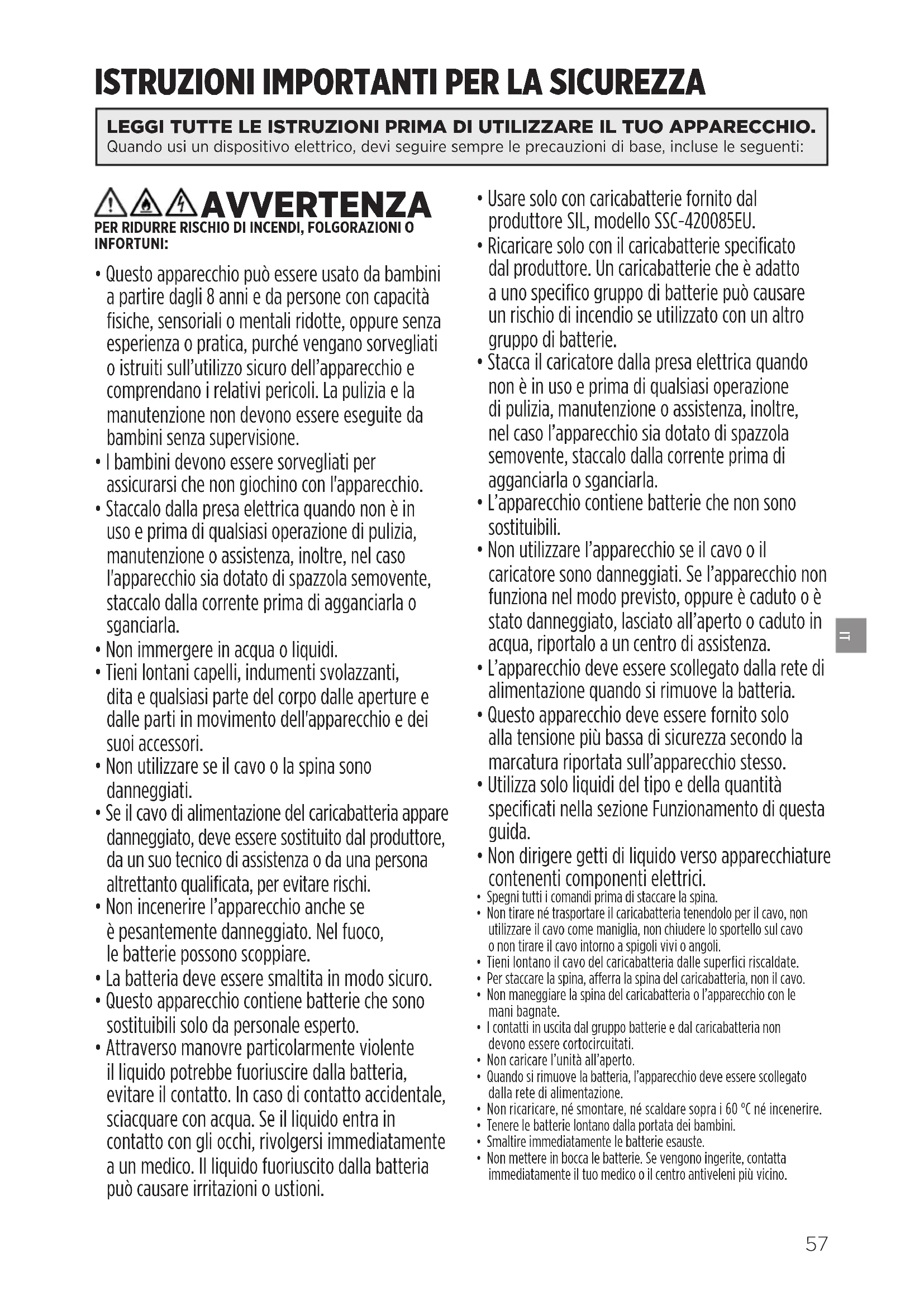 - Usare solo con caricabatterie fornito dal produttore SIL, modello SSC-420085EU.