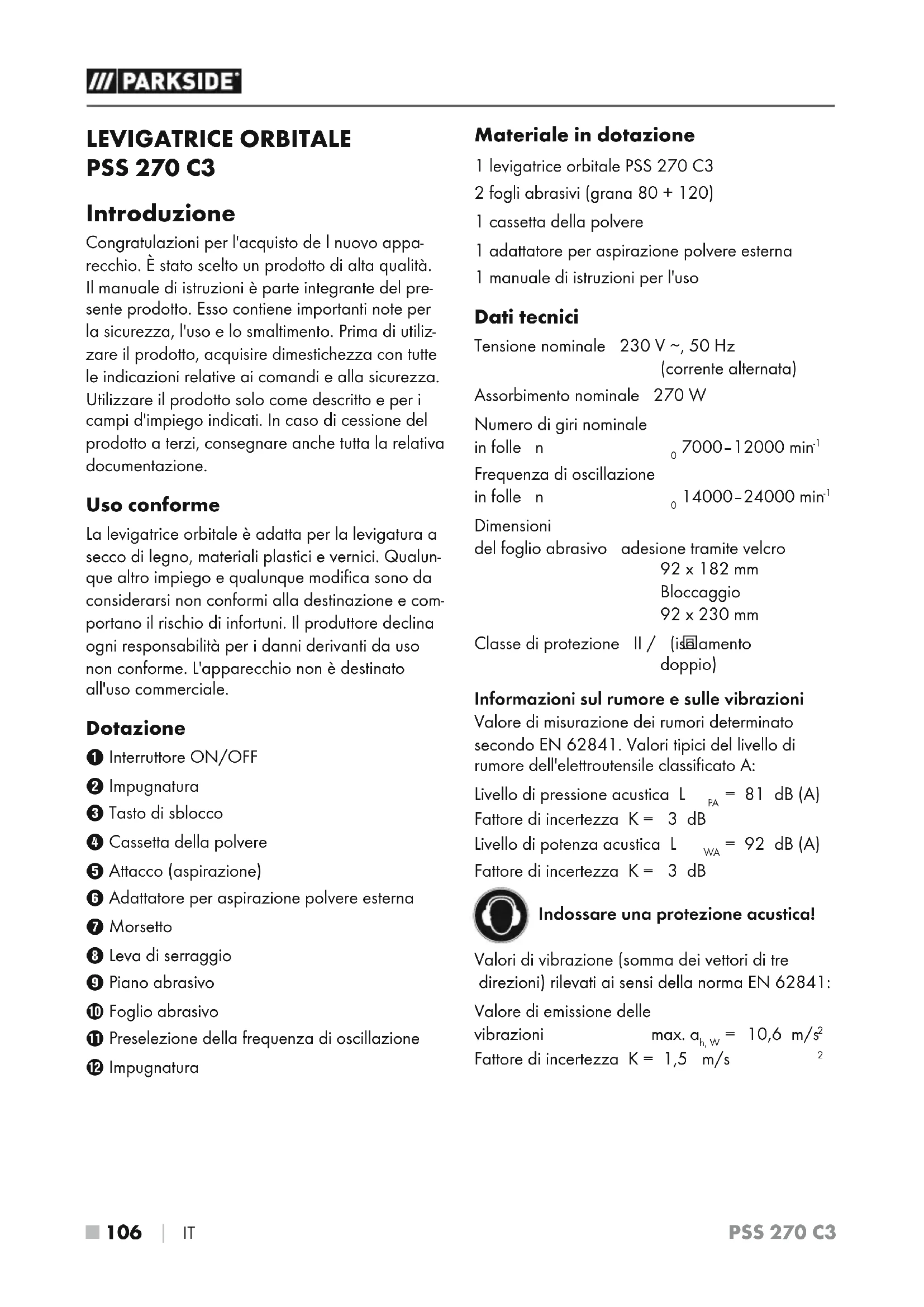 IT LEVIGATRICE ORBITALE PSS 270 C3 Introduzione Congratulazioni per l'acquisto de l nuovo appa- recchio. È stato scelto un prodotto di alta qualità. Il manuale di istruzioni è parte integrante del pre- sente prodotto. Esso contiene importanti note per la sicurezza, l'uso e lo smaltimento. Prima di utiliz- zare il prodotto, acquisire dimestichezza con tutte le indicazioni relative ai comandi e alla sicurezza. Utilizzare il prodotto solo come descritto e per i campi d'impiego indicati. In caso di cessione del prodotto a terzi, consegnare anche tutta la relativa documentazione. Uso conforme La levigatrice orbitale è adatta per la levigatura a secco di legno, materiali plastici e vernici. Qualun- que altro impiego e qualunque modifica sono da considerarsi non conformi alla destinazione e com- portano il rischio di infortuni. Il produttore declina ogni responsabilità per i danni derivanti da uso non conforme. L'apparecchio non è destinato all'uso commerciale. Dotazione 1 Interruttore ON/OFF 2 Impugnatura 3 Tasto di sblocco 4 Cassetta della polvere 5 Attacco (aspirazione) 6 Adattatore per aspirazione polvere esterna 7 Morsetto 8 Leva di serraggio 9 Piano abrasivo 0 Foglio abrasivo q Preselezione della frequenza di oscillazione w Impugnatura Materiale in dotazione 1 levigatrice orbitale PSS 270 C3 2 fogli abrasivi (grana 80 + 120) 1 cassetta della polvere 1 adattatore per aspirazione polvere esterna 1 manuale di istruzioni per l'uso Dati tecnici Tensione nominale 230 V ∼, 50 Hz (corrente alternata) Assorbimento nominale 270 W Numero di giri nominale in folle n