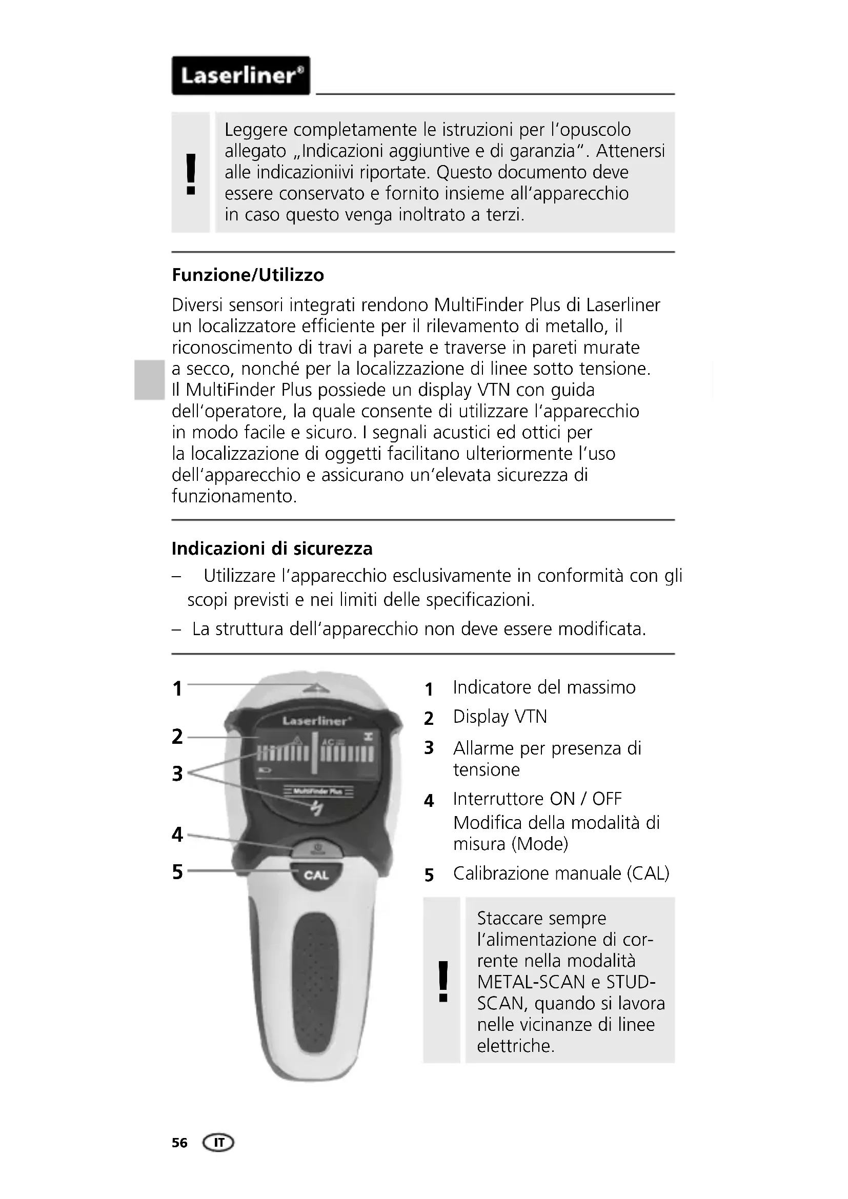 Indicatore del massimo Display VTN Allarme per presenza di tensione Interruttore ON / OFF Modifica della modalità di misura (Mode) Calibrazione manuale (CAL) Diversi sensori integrati rendono MultiFinder Plus di Laserliner un localizzatore efficiente per il rilevamento di metallo, il riconoscimento di travi a parete e traverse in pareti murate a secco, nonché per la localizzazione di linee sotto tensione. Il MultiFinder Plus possiede un display VTN con guida dell‘operatore, la quale consente di utilizzare l‘apparecchio in modo facile e sicuro. I segnali acustici ed ottici per la localizzazione di oggetti facilitano ulteriormente l‘uso dell‘apparecchio e assicurano un‘elevata sicurezza di funzionamento. Funzione/Utilizzo Leggere completamente le istruzioni per l‘opuscolo allegato „Indicazioni aggiuntive e di garanzia“. Attenersi alle indicazioniivi riportate. Questo documento deve essere conservato e fornito insieme all‘apparecchio in caso questo venga inoltrato a terzi.