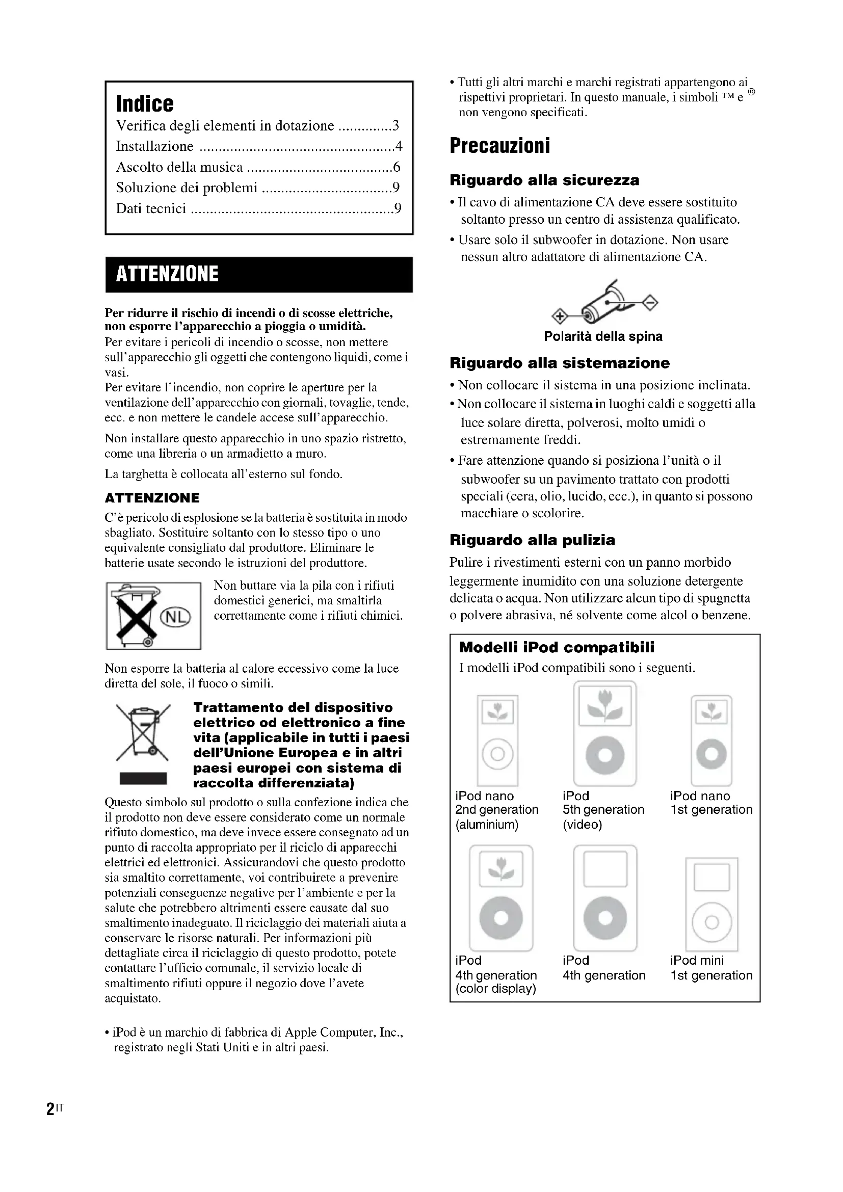 - Fare attenzione quando si posiziona l’unità o il subwoofer su un pavimento trattato con prodotti speciali (cera, olio, lucido, ecc.), in quanto si possono macchiare o scolorire. Riguardo alla pulizia Pulire i rivestimenti esterni con un panno morbido leggermente inumidito con una soluzione detergente delicata o acqua. Non utilizzare alcun tipo di spugnetta o polvere abrasiva, né solvente come alcol o benzene. Indice Verifica degli elementi in dotazione ..............3 Installazione ...................................................4 Ascolto della musica ......................................6 Soluzione dei problemi ..................................9 Dati tecnici .....................................................9 ATTENZIONE Modelli iPod compatibili I modelli iPod compatibili sono i seguenti. Polarità della spinaiPod nano 2nd generation (aluminium)iPod 5th generation (video)iPod nano 1st generationiPod 4th generation (color display)iPod 4th generationiPod mini 1st generation3