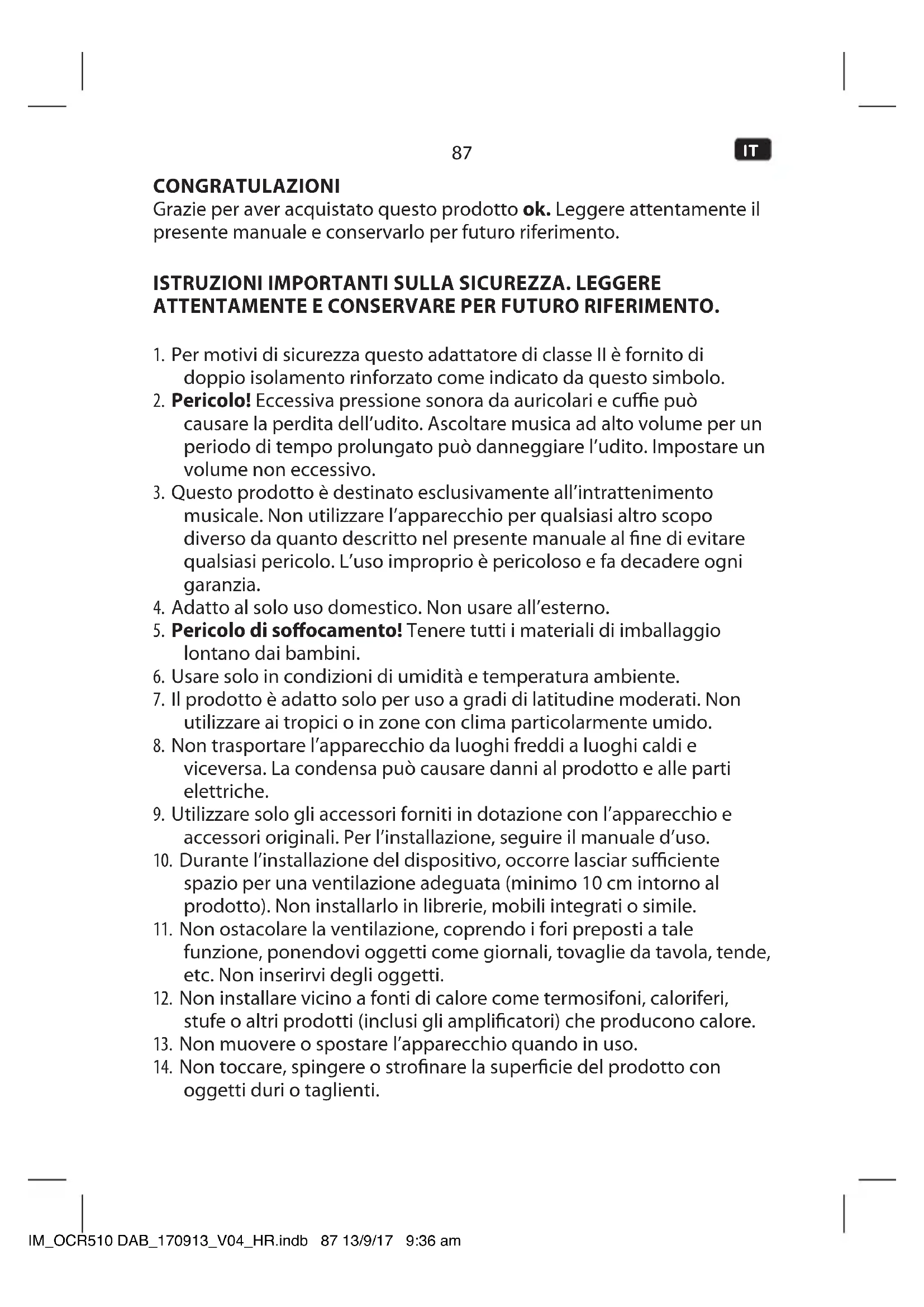intulizzabile scollegando la corrente dall’adattatore e tagliando in due il cavo. IM_OCR510 DAB_170913_V04_HR.indb 88 13/9/17 9:36 am89
