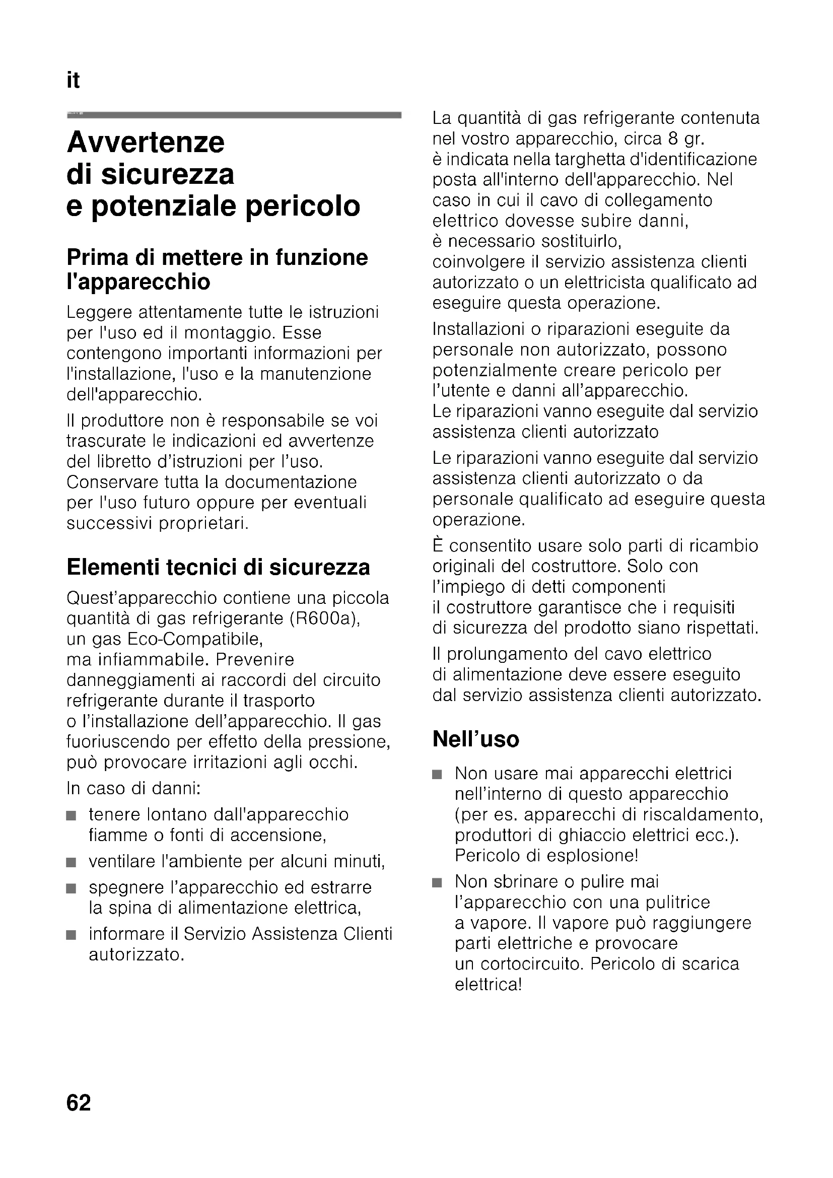 itIndic e Istruzioni per I´usoit Avvertenze di sicurezza e potenziale pericolo Prima di mettere in funzione l'apparecchio Leggere attentamente tutte le istruzioni per l'uso ed il montaggio. Esse contengono importanti informazioni per l'installazione, l'uso e la manutenzione dell'apparecchio. Il produttore non è responsabile se voi trascurate le indicazioni ed avvertenze del libretto d’istruzioni per l’uso. Conservare tutta la documentazione per l'uso futuro oppure per eventuali successivi proprietari. Elementi tecnici di sicurezza Quest’apparecchio contiene una piccola quantità di gas refrigerante (R600a), un gas Eco-Compatibile, ma infiammabile. Prevenire danneggiamenti ai raccordi del circuito refrigerante durante il trasporto o l’installazione dell’apparecchio. Il gas fuoriuscendo per effetto della pressione, può provocare irritazioni agli occhi. In caso di danni: ■ tenere lontano dall'apparecchio fiamme o fonti di accensione, ■ ventilare l'ambiente per alcuni minuti, ■ spegnere l’apparecchio ed estrarre la spina di alimentazione elettrica, ■ informare il Servizio Assistenza Clienti autorizzato. La quantità di gas refrigerante contenuta nel vostro apparecchio, circa 8 gr. è indicata nella targhetta d'identificazione posta all'interno dell'apparecchio. Nel caso in cui il cavo di collegamento elettrico dovesse subire danni, è necessario sostituirlo, coinvolgere il servizio assistenza clienti autorizzato o un elettricista qualificato ad eseguire questa operazione. Installazioni o riparazioni eseguite da personale non autorizzato, possono potenzialmente creare pericolo per l’utente e danni all’apparecchio. Le riparazioni vanno eseguite dal servizio assistenza clienti autorizzato Le riparazioni vanno eseguite dal servizio assistenza clienti autorizzato o da personale qualificato ad eseguire questa operazione. È consentito usare solo parti di ricambio originali del costruttore. Solo con l’impiego di detti componenti il costruttore garantisce che i requisiti di sicurezza del prodotto siano rispettati. Il prolungamento del cavo elettrico di alimentazione deve essere eseguito dal servizio assistenza clienti autorizzato. Nell’uso ■ Non usare mai apparecchi elettrici nell’interno di questo apparecchio (per es. apparecchi di riscaldamento, produttori di ghiaccio elettrici ecc.). Pericolo di esplosione! ■ Non sbrinare o pulire mai l’apparecchio con una pulitrice a vapore. Il vapore può raggiungere parti elettriche e provocare un cortocircuito. Pericolo di scarica elettrica!it