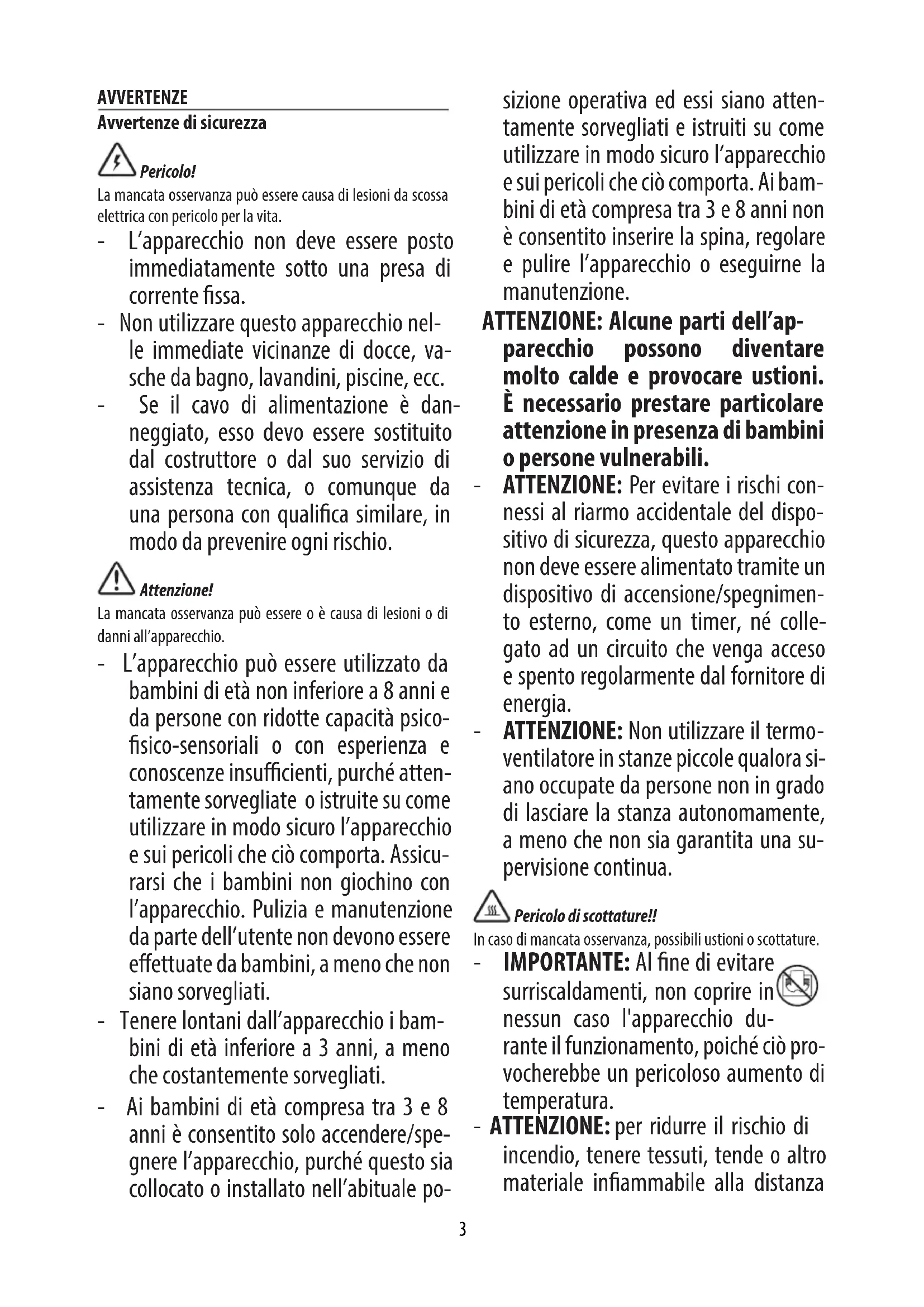 AVVERTENZE Avvertenze di sicurezza Pericolo! La mancata osservanza può essere causa di lesioni da scossa elettrica con pericolo per la vita. - L’apparecchio non deve essere posto immediatamente sotto una presa di corrente ssa. - Non utilizzare questo apparecchio nel- le immediate vicinanze di docce, va- sche da bagno, lavandini, piscine, ecc. - Se il cavo di alimentazione è dan- neggiato, esso devo essere sostituito dal costruttore o dal suo servizio di assistenza tecnica, o comunque da una persona con qualica similare, in modo da prevenire ogni rischio. Attenzione! La mancata osservanza può essere o è causa di lesioni o di danni all’apparecchio. - L’apparecchio può essere utilizzato da bambini di età non inferiore a 8 anni e da persone con ridotte capacità psico- sico-sensoriali o con esperienza e conoscenze insucienti, purché atten- tamente sorvegliate o istruite su come utilizzare in modo sicuro l’apparecchio e sui pericoli che ciò comporta. Assicu- rarsi che i bambini non giochino con l’apparecchio. Pulizia e manutenzione da parte dell’utente non devono essere eettuate da bambini, a meno che non siano sorvegliati. - Tenere lontani dall’apparecchio i bam- bini di età inferiore a 3 anni, a meno che costantemente sorvegliati. - Ai bambini di età compresa tra 3 e 8 anni è consentito solo accendere/spe- gnere l’apparecchio, purché questo sia collocato o installato nell’abituale po- sizione operativa ed essi siano atten- tamente sorvegliati e istruiti su come utilizzare in modo sicuro l’apparecchio e sui pericoli che ciò comporta. Ai bam- bini di età compresa tra 3 e 8 anni non è consentito inserire la spina, regolare e pulire l’apparecchio o eseguirne la manutenzione. ATTENZIONE: Alcune parti dell’ap- parecchio possono diventare molto calde e provocare ustioni. È necessario prestare particolare attenzione in presenza di bambini o persone vulnerabili. - ATTENZIONE: Per evitare i rischi con- nessi al riarmo accidentale del dispo- sitivo di sicurezza, questo apparecchio non deve essere alimentato tramite un dispositivo di accensione/spegnimen- to esterno, come un timer, né colle- gato ad un circuito che venga acceso e spento regolarmente dal fornitore di energia. - ATTENZIONE: Non utilizzare il termo- ventilatore in stanze piccole qualora si- ano occupate da persone non in grado di lasciare la stanza autonomamente, a meno che non sia garantita una su- pervisione continua. Pericolo di scottature!! In caso di mancata osservanza, possibili ustioni o scottature. - IMPORTANTE: Al ne di evitare surriscaldamenti, non coprire in nessun caso l'apparecchio du- rante il funzionamento, poiché ciò pro- vocherebbe un pericoloso aumento di temperatura. - ATTENZIONE: per ridurre il rischio di incendio, tenere tessuti, tende o altro materiale inammabile alla distanza4 minima di 1 m dalla griglia di uscita dell’aria. Funzioni di sicurezza - Dispositivo di sicurezza: l’appa- recchio è dotato di un dispositivo di sicurezza che interrompe il funziona- mento del termoventilatore in caso di surriscaldamento accidentale (es. ostruzione delle griglie di entrata ed uscita dell’aria, motore che non gira o gira lento). Per ripristinare il funzionamento, è necessario staccare la spina dalla presa per alcuni minuti, eliminare la causa del surriscaldamento, quindi reinserire la spina. Qualora il problema persista non utilizzare l’apparecchio e rivolgersi ad un centro assistenza autorizzato per la verica del problema. - Dispositivo di sicurezza antiribal- tamento: Alcuni modelli sono dotati di un dispositivo anti-ribaltamento che spegne l’apparecchio in caso di caduta. Per avviare nuovamente l’apparecchio è suciente rimetterlo in posizione verticale. Nota: Questo simbolo segnala raccomandazioni e informazioni im- portanti per l’utente. - Utilizzare l’apparecchio su una super- cie orizzontale e stabile. - Usare l'apparecchio sempre e soltanto in posizione verticale. - Non utilizzare l'apparecchio se è caduto. - Non utilizzare l'apparecchio se presenta segni visibili di danneggiamento. - È sconsigliato l’uso di prolunghe. Qua- lora il loro uso si rendesse necessario, seguire attentamente le istruzioni ac- cluse alla prolunga, facendo attenzio- ne a non superare il limite di potenza marcato sulla stessa. - Non far funzionare l’apparecchio a ri- dosso di pareti, mobili, tende ecc. - Non usare questo apparecchio in una stanza la cui area di base è inferiore a 4m². - Prima di riporre l’apparecchio, control- lare che sia completamente spento e che la spina sia staccata dalla presa. Non riporre in ambienti polverosi. - Non porre nulla sopra l’apparecchio. - L’apparecchio non deve essere appeso in alcun modo. - Alcuni modelli sono provvisti di un di- spositivo che ritarda di alcuni secondi lo spegnimento del ventilatore. - Non usare l’apparecchio per asciugare la biancheria. Non ostruire la zona di ingresso e uscita dell’aria (pericolo di surriscaldamento). - Solo per apparecchi predisposti per l’asciugatura della biancheria: Questo apparecchio è destinato esclu- sivamente all’asciugatura di tessuti lavati in acqua. Importante!