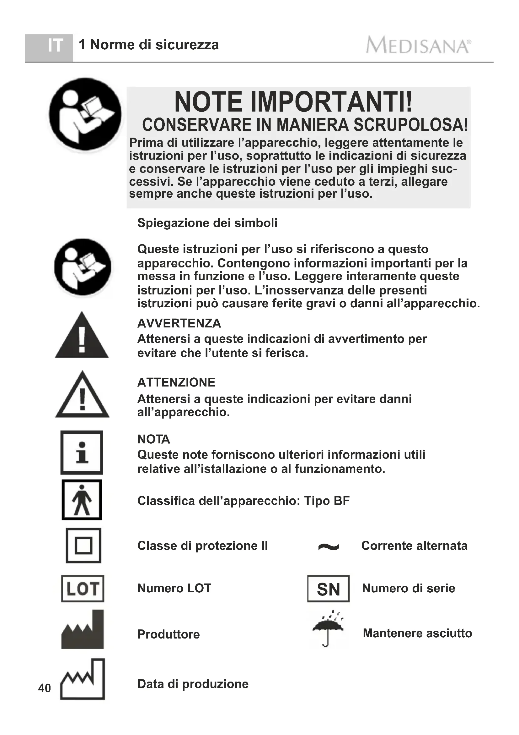 5 Garantie FRNOTE IMPORTANTI! CONSERVARE IN MANIERA SCRUPOLOSA! Queste istruzioni per l’uso si riferiscono a questoapparecchio. Contengono informazioni importanti per lamessa in funzione e l’uso. Leggere interamente questeistruzioni per l’uso. L’inosservanza delle presentiistruzioni può causare ferite gravi o danni all’apparecchio.AVVERTENZAAttenersi a queste indicazioni di avvertimento per evitare che l’utente si ferisca.ATTENZIONEAttenersi a queste indicazioni per evitare danniall’apparecchio. NOTA Queste note forniscono ulteriori informazioni utili relative all’istallazione o al funzionamento. Numero LOT Numero di serie Produttore Spiegazione dei simboli Classifica dell’apparecchio: Tipo BFClasse di protezione II Corrente alternataData di produzione 1 Norme di sicurezza Prima di utilizzare l’apparecchio, leggere attentamente leistruzioni per l’uso, soprattutto le indicazioni di sicurezza e conservare le istruzioni per l’uso per gli impieghi suc-cessivi. Se l’apparecchio viene ceduto a terzi, allegare sempre anche queste istruzioni per l’uso.