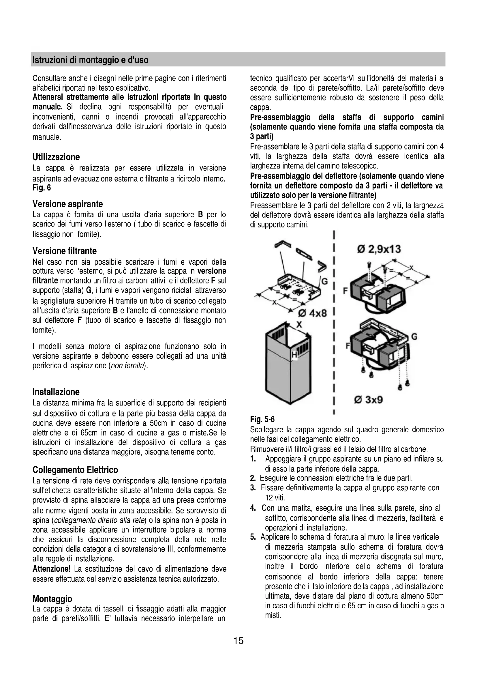 fissaggio non fornite, da acquistare) per lo scarico dei fumi all’anello di connessione posto sopra l’unità motore aspirante. L’altra estremità del tubo dovrà essere collegata ad un dispositivo di espulsione fumi verso l’esterno in caso di utilizzo della cappa in versione aspirante. Nel caso si voglia utilizzare la cappa in versione filtrante, allora fissare alla staffa di supporto camini G il deflettore F e collegare l’altra estremità del tubo all’anello di connessione posto sul deflettore F.
