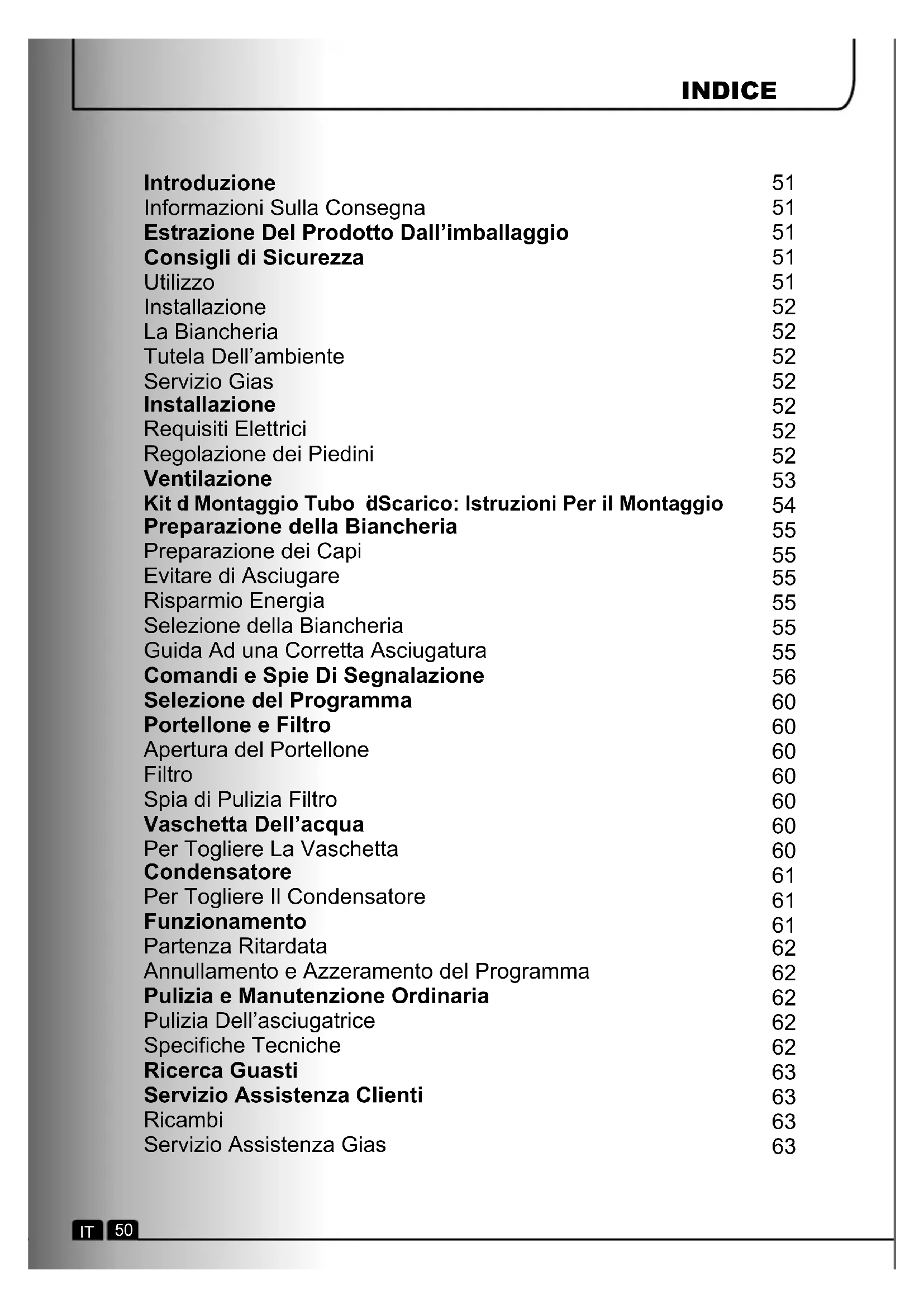 NOTA: Installare e utilizzare il tubo di scarico per scaricare acqua condensata.l’ Informazıonı per Test dı Laboratorıo EN 61121 Programmı Programmı da uare -Cotone Asciutto-Capi Asciutti da Riporre -Capi Asciutti da Stirare -Capi Asciutti da Riporre+Sintetico -Cotone Asciutto da Stirare -Tessuti DelicatiProblemi che può risolvere l’utente Prima di rivolgersi al Centro Assistenza GIAS, consultare la seguente checklist. La chiamata verrà addebitata all'utente nel caso in cui risulti che la macchina funziona o è stata installata o utilizzata in maniera errata. Se il problema persiste anche dopo aver eseguito i controlli consigliati, rivolgersi al servizio di assistenza GIAS che sarà a disposizione per suggerire eventuali soluzioni per telefono. Il tempo di asciugatura residuo può variare durante il ciclo. Il tempo infatti viene costantemente aggiornato per migliorarne la stima. E' per tanto normale che durante il ciclo, il tempo mostrato sul display possa aumentare o diminuire. Tempo di asciugatura eccessivamente lungo/capi non sufficientemente asciutti… ●Il programma/tempo di asciugatura selezionato è corretto? ● I capi sono stati introdotti eccessivamente bagnati? Si è provveduto a strizzare o centrifugare adeguatamente i capi prima d’introdurli nella macchina? ● Si deve pulire il filtro? ● Si deve pulire il condensatore? ●L’asciugatrice è stata caricata eccessivamente? ● Vi sono ostruzioni a livello delle prese, degli sfiati e della base dell’asciugatrice? ● Il tasto è stato selezionato da un ciclo precedente? L’asciugatrice non funziona… ● L’alimentazione elettrica cui è collegata la macchina è attiva? Controllare provando con un altro apparecchio (ad esempio, lampada da tavolo). ● La spina di alimentazione è stata collegata correttamente all’alimentazione elettrica? ● Manca la corrente? ● Fusibile bruciato? ● Il portellone è stato chiuso perfettamente? ● La macchina è stata opportunamente attivata (sia collegata all’alimentazione sia attivata localmente)? ● È stato selezionato il tempo o il programma di asciugatura? ●La macchina è stata riattivata dopo aver aperto il portellone? ●La macchina ha smesso di funzionare perché la vaschetta dell’acqua è piena e deve essere svuotata? Se il problema persiste anche dopo aver effettuato tutti icontrolli consigliati, rivolgersi al Servizio Assistenza GIAS. Sarà a disposizione per suggerire eventuali soluzioni per telefono o per fissare la visita del tecnico in base alle condizioni di garanzia. Si ricorda che l’intervento del tecnico può essere soggetto a pagamento nel caso la macchina: ● risulti perfettamente funzionante. ● non sia stata installata secondo quanto indicato nelle istruzioni d’installazione. ● sia stata utilizzata in modo improprio. Utilizzare sempre ricambi originali, disponibili direttamente presso il Servizio Assistenza GIAS. Per assistenza e riparazioni, rivolgersi al tecnico del Servizio Assistenza GIAS più vicino. L’asciugatrice fa molto rumore… ● Spegnere l’asciugatrice e rivolgersi al Servizio Assistenza GIAS. La spia di segnalazione è accesa… ● Si deve pulire il filtro? ● Si deve pulire il condensatore? La spia di segnalazione è accesa… ● Si deve svuotare la vaschetta dell’acqua? Il produttore declina ogni responsabilità in caso di eventuali errori di stampa nel presente opuscolo. Il produttore si riserva il diritto di apportare le necessarie modifiche ai propri prodotti, senza alterarne le caratteristiche essenziali. RICERCA GUASTI Quale Può Essere La Causa...