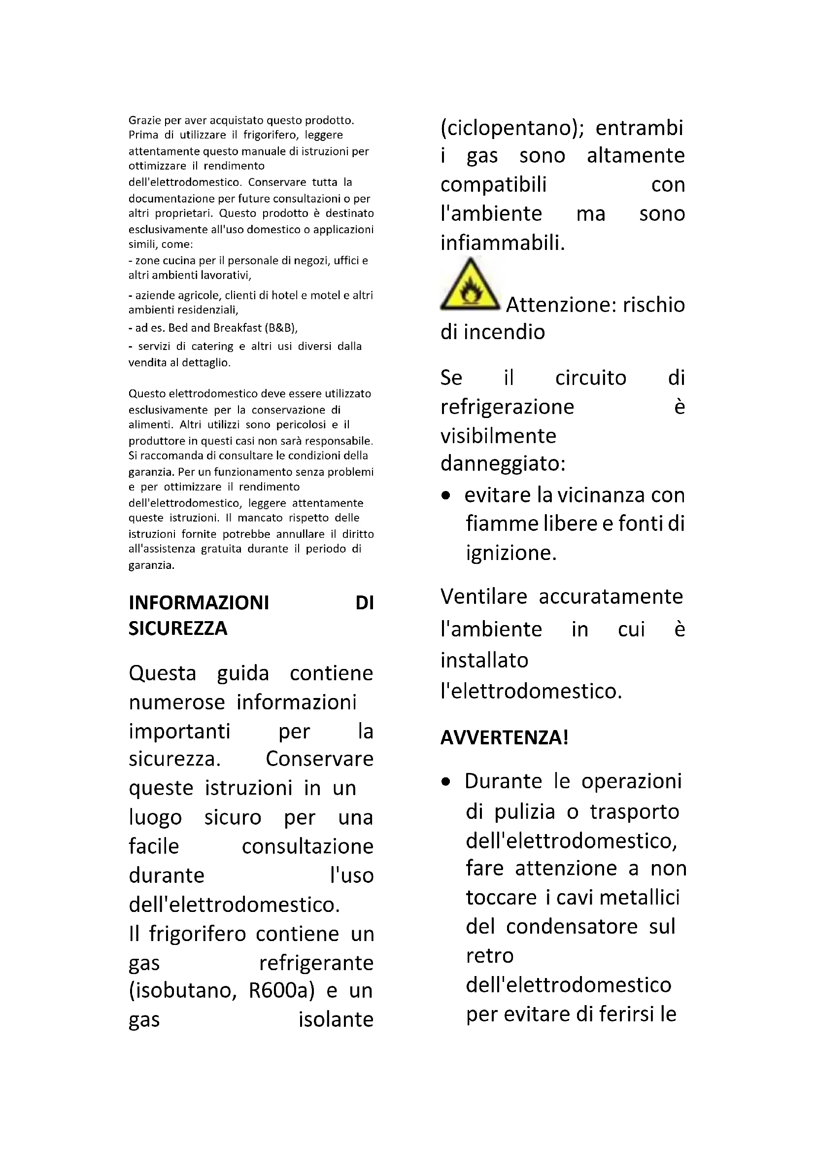 - Español Grazie per aver acquistato questo prodotto. Prima di utilizzare il frigorifero, leggere attentamente questo manuale di istruzioni per ottimizzare il rendimento dell'elettrodomestico. Conservare tutta la documentazione per future consultazioni o per altri proprietari. Questo prodotto è destinato esclusivamente all'uso domestico o applicazioni simili, come: - zone cucina per il personale di negozi, uffici e altri ambienti lavorativi, - aziende agricole, clienti di hotel e motel e altri ambienti residenziali, - ad es. Bed and Breakfast (B&B), - servizi di catering e altri usi diversi dalla vendita al dettaglio. Questo elettrodomestico deve essere utilizzato esclusivamente per la conservazione di alimenti. Altri utilizzi sono pericolosi e il produttore in questi casi non sarà responsabile. Si raccomanda di consultare le condizioni della garanzia. Per un funzionamento senza problemi e per ottimizzare il rendimento dell'elettrodomestico, leggere attentamente queste istruzioni. Il mancato rispetto delle istruzioni fornite potrebbe annullare il diritto all'assistenza gratuita durante il periodo di garanzia. INFORMAZIONI DI SICUREZZA Questa guida contiene numerose informazioni importanti per la sicurezza. Conservare queste istruzioni in un luogo sicuro per una facile consultazione durante l'uso dell'elettrodomestico. Il frigorifero contiene un gas refrigerante (isobutano, R600a) e un gas isolante (ciclopentano); entrambi i gas sono altamente compatibili con l'ambiente ma sono infiammabili. Attenzione: rischio di incendio Se il circuito di refrigerazione è visibilmente danneggiato: p. 51