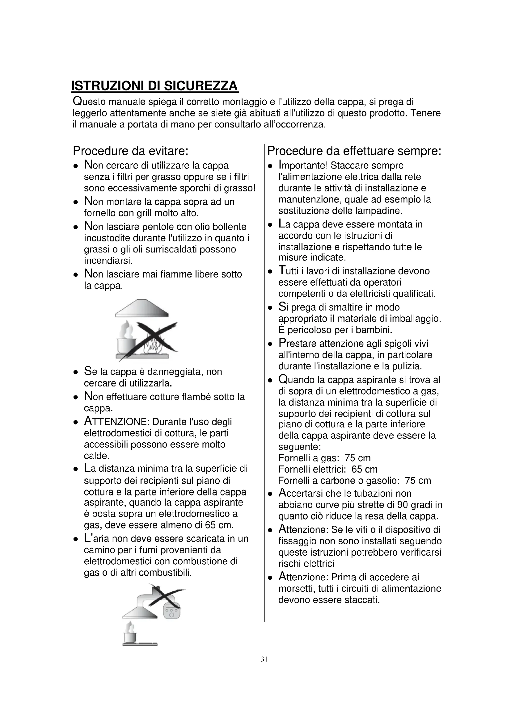 Procedure da effettuare sempre: ● Importante! Staccare sempre l'alimentazione elettrica dalla rete durante le attività di installazione e manutenzione, quale ad esempio la sostituzione delle lampadine. ● La cappa deve essere montata in accordo con le istruzioni di installazione e rispettando tutte le misure indicate. ● Tutti i lavori di installazione devono essere effettuati da operatori competenti o da elettricisti qualificati. ● Si prega di smaltire in modo appropriato il materiale di imballaggio. È pericoloso per i bambini. ● Prestare attenzione agli spigoli vivi all'interno della cappa, in particolare durante l'installazione e la pulizia. ● Quando la cappa aspirante si trova al di sopra di un elettrodomestico a gas, la distanza minima tra la superficie di supporto dei recipienti di cottura sul piano di cottura e la parte inferiore della cappa aspirante deve essere la seguente: Fornelli a gas: 75 cm Fornelli elettrici: 65 cm Fornelli a carbone o gasolio: 75 cm ● Accertarsi che le tubazioni non abbiano curve più strette di 90 gradi in quanto ciò riduce la resa della cappa. ● Attenzione: Se le viti o il dispositivo di fissaggio non sono installati seguendo queste istruzioni potrebbero verificarsi rischi elettrici ● Attenzione: Prima di accedere ai morsetti, tutti i circuiti di alimentazione devono essere staccati.32 Procedure da effettuare sempre: ● Mettere sempre i coperchi su pentole e tegami quando si cuoce su un fornello a gas. ● In modalità di estrazione, l'aria all'interno dell'ambiente viene aspirata dalla cappa. Accertarsi che siano adottate misure adeguate per la ventilazione. La cappa toglie gli odori dall'ambiente ma non il vapore. ● Deve esserci un'adeguata ventilazione dell'ambiente quando si utilizza la cappa aspirante insieme ad elettrodomestici con combustione di gas o di altri combustibili. ● La cappa è progettata per un uso esclusivamente domestico.